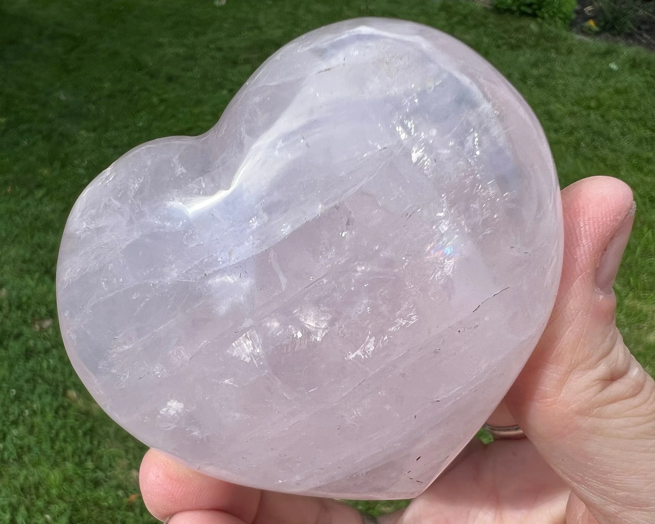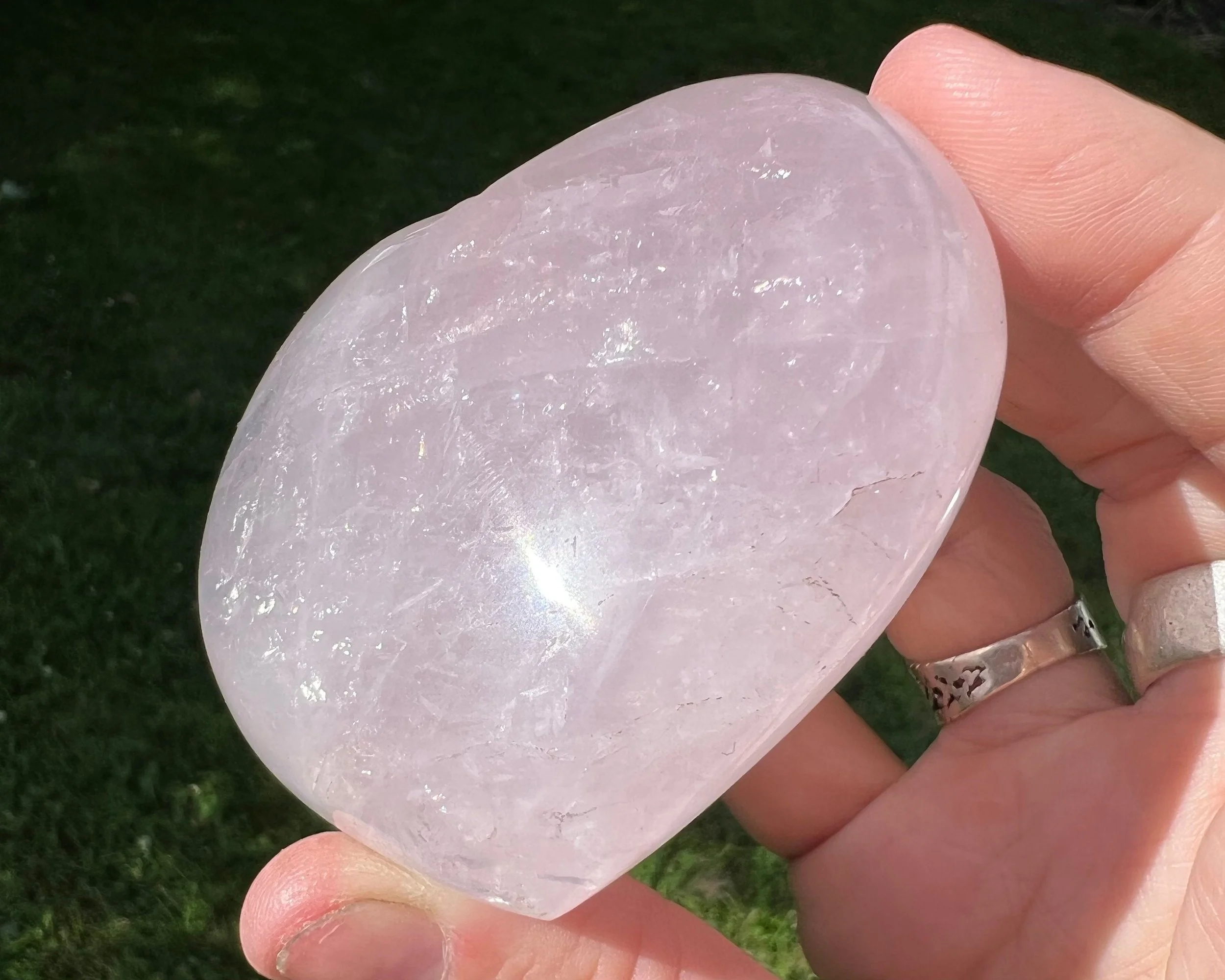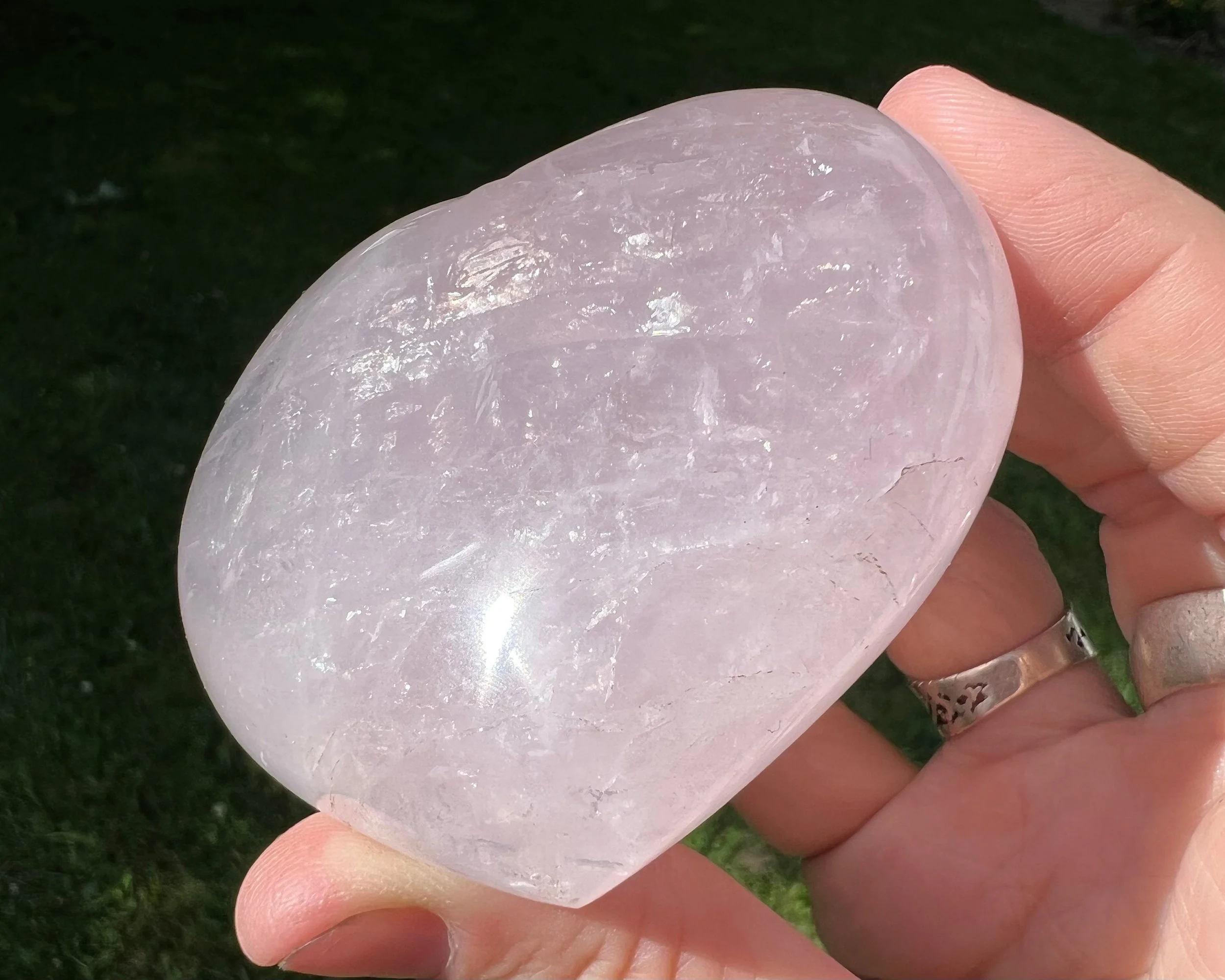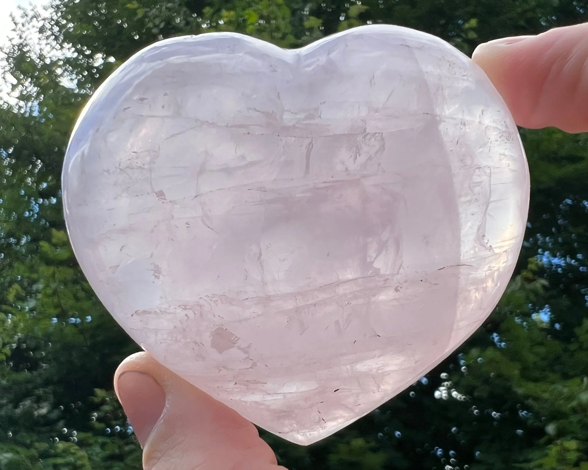 This is a lovely gemstone heart made of natural Star Rose Quartz, a type of rose Quartz with asterism, which means lines appear in bright light inside the stone. It is full of light and rainbows and shimmer. It is translucent. Carved from natural stone and polished. A very lovely crystal heart.