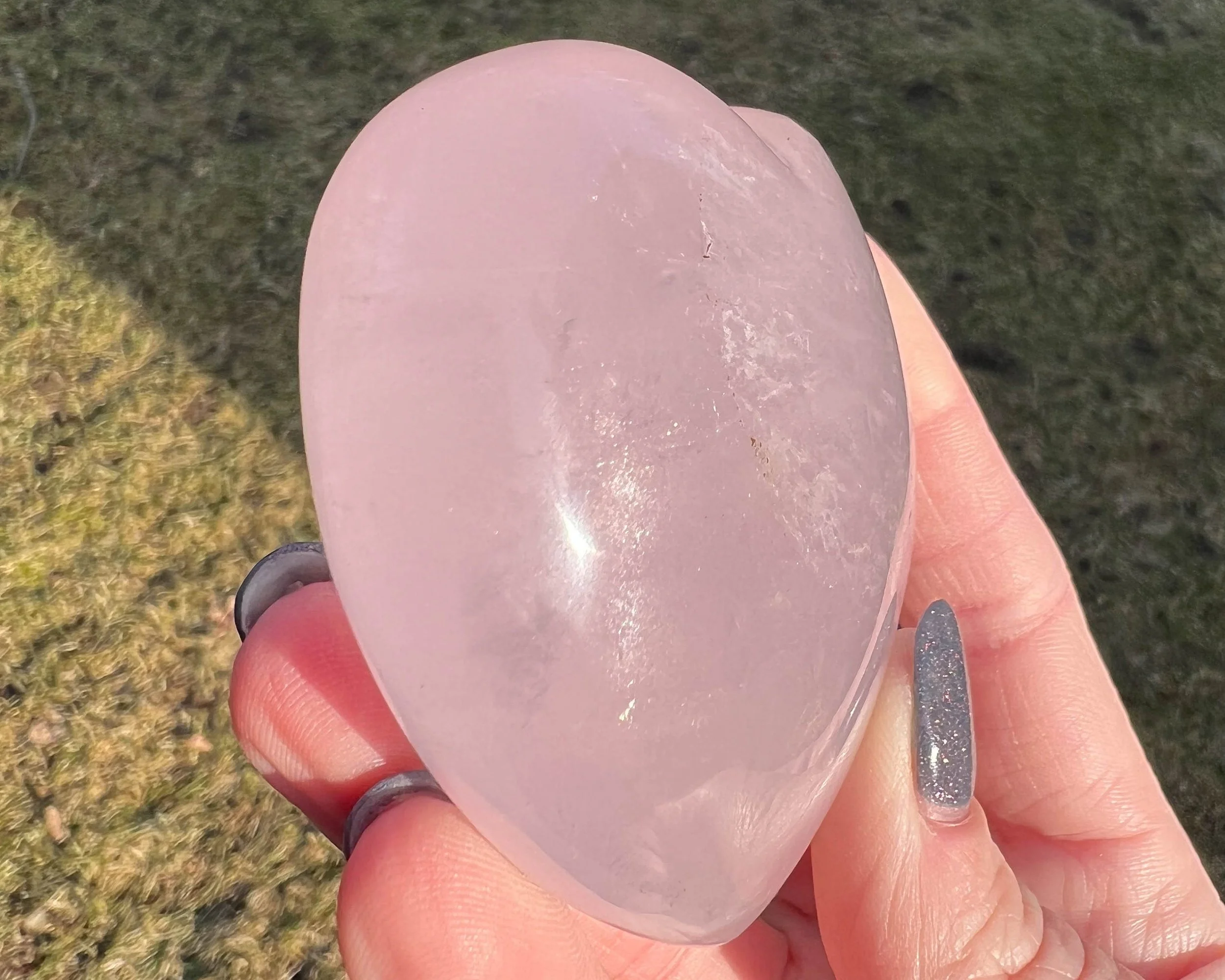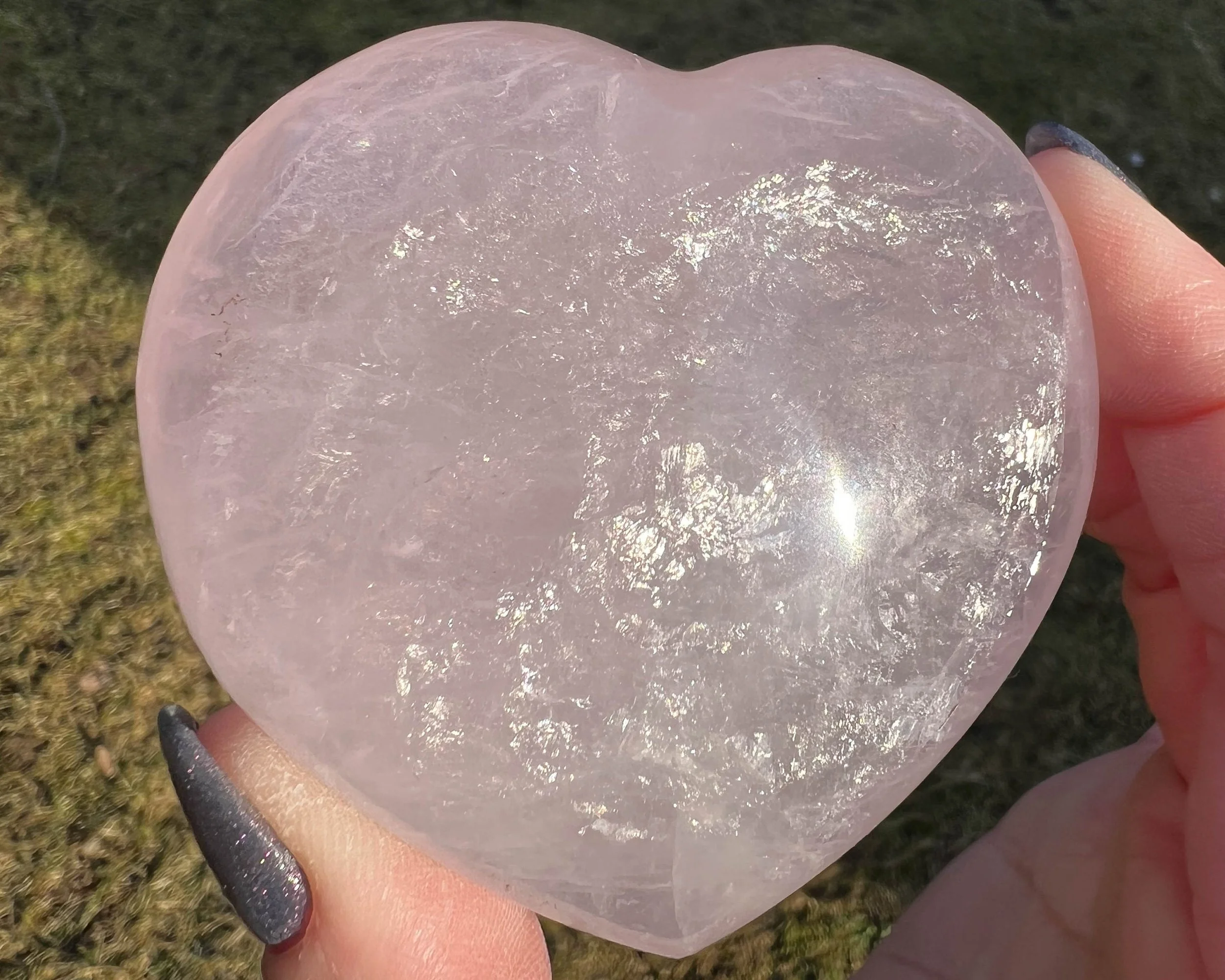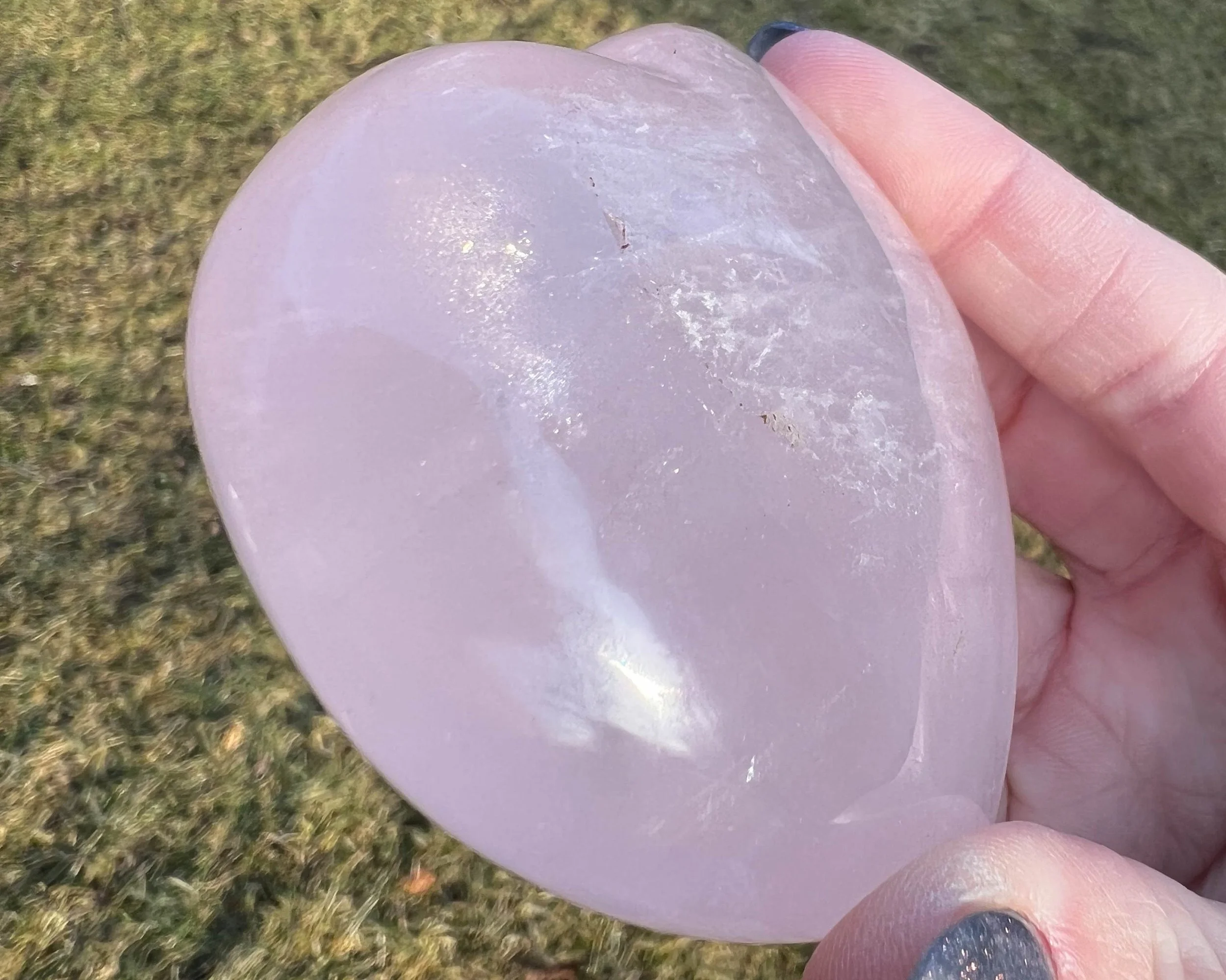 This is a lovely gemstone heart made of natural Star Rose Quartz, a type of rose Quartz with asterism, which means lines appear in bright light inside the stone. This one has more of a shimmer that moves rather than clearly defined lines. It may also be Girasol Quartz, it is translucent and glows nicely when backlit. It is full of light and rainbows and shimmer and sheen. Carved from natural stone and polished. A very lovely crystal heart.