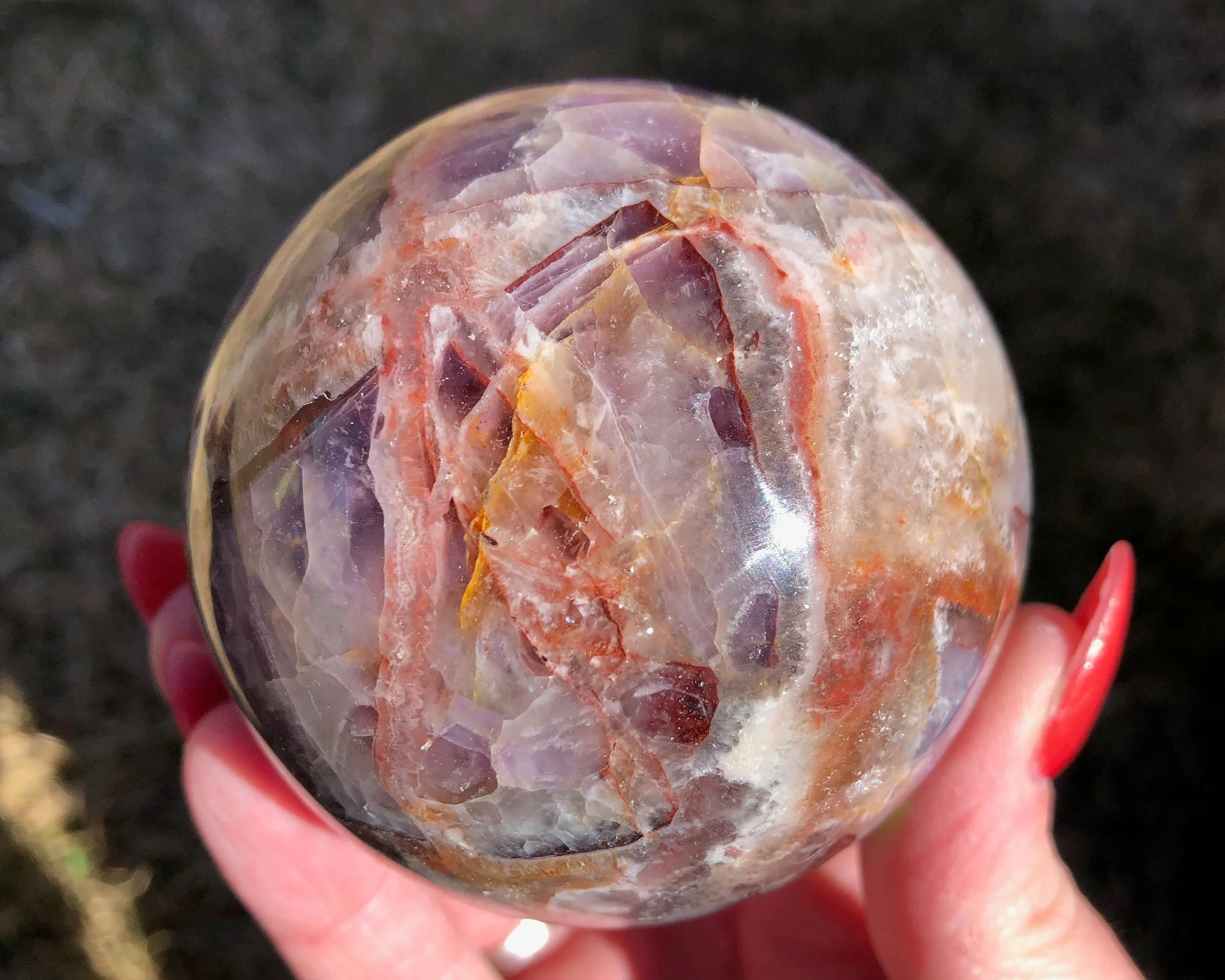 This is a gorgeous natural Chevron Amethyst sphere with banded patterns of deep purple, red hematite, white Quartz and some Agate too. It is from India. This piece has lots of beautiful contrast and nice patterns and inclusions. Tiny baby rainbows too. Such a beauty!