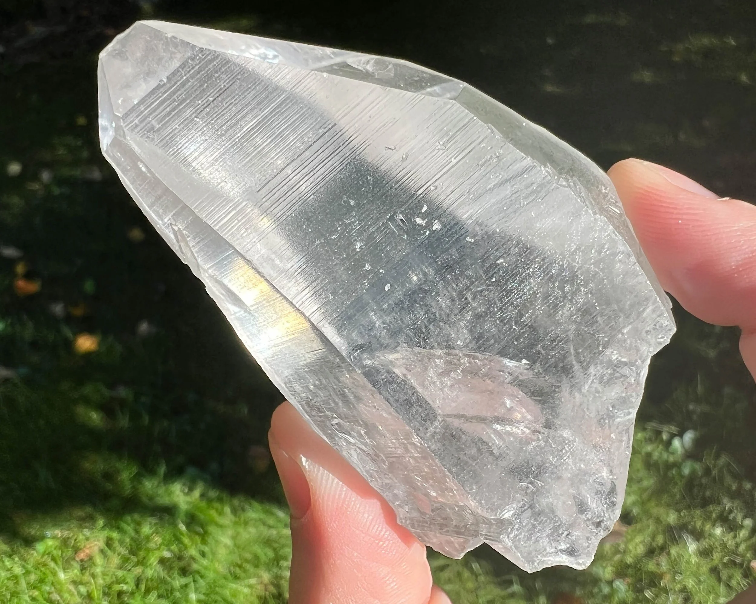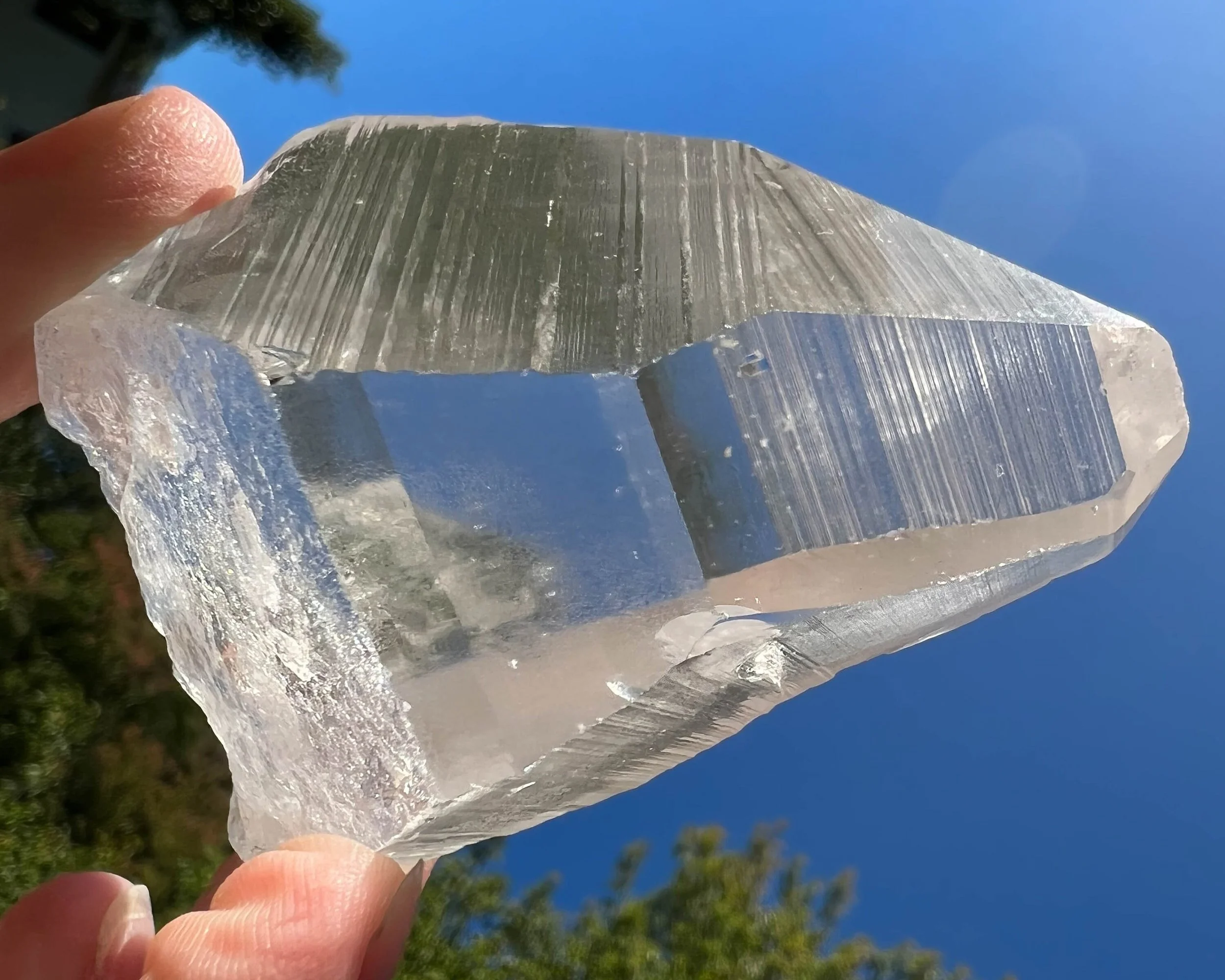 This is a large, gorgeous Lemurian Quartz point from Serra do Cabral in Brazil. It has amazing clarity as well as the "ladder line" striations on the sides that are classic traits of Lemurian Quartz crystals.