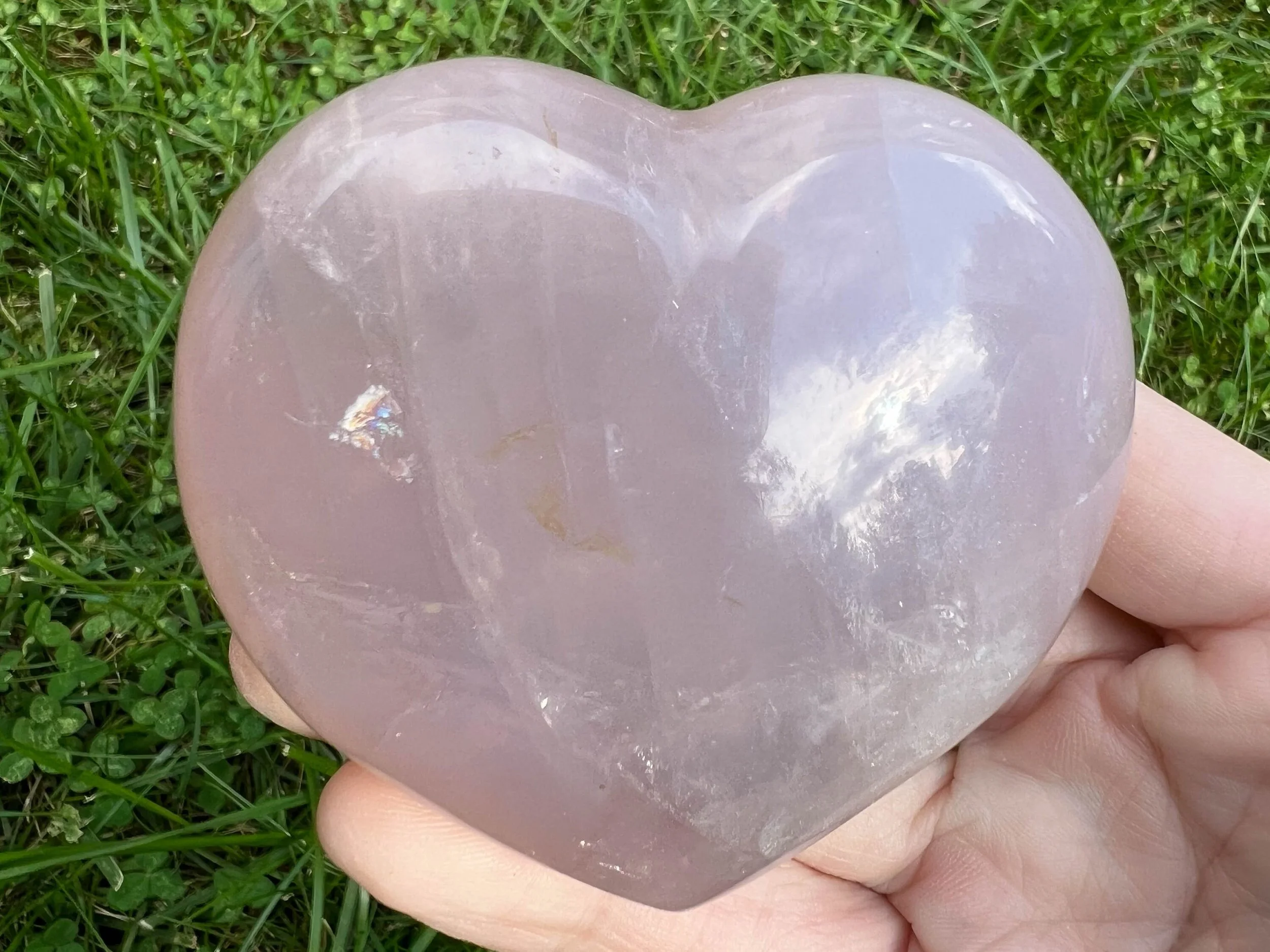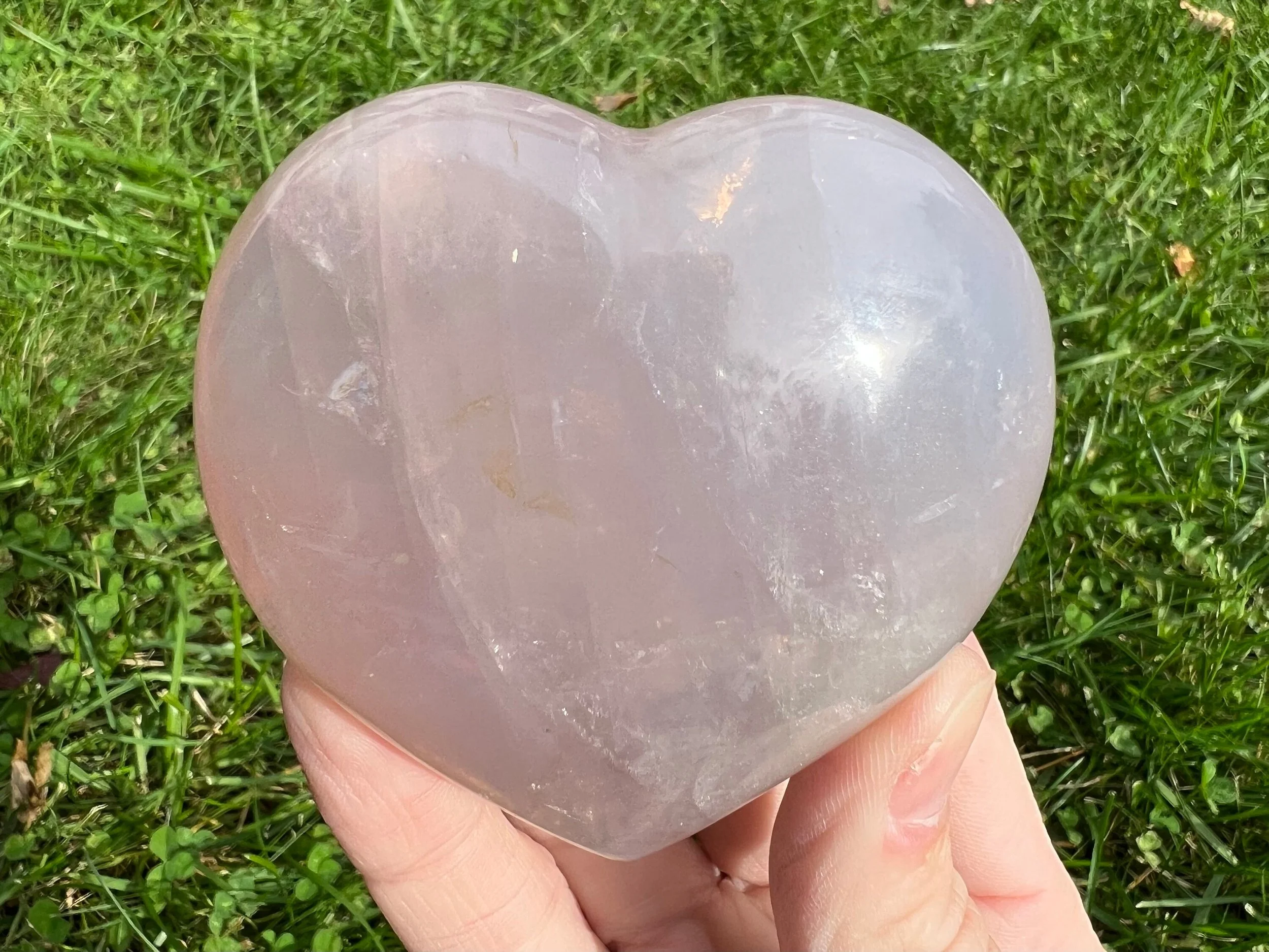 This is a lovely gemstone heart made of natural Star Blue Rose Quartz, which is Rose Quartz that has a blue glow to it, especially in the light. It is also Star Rose Quartz, which has asterism, or lines that move through it in the light caused by an inclusion of nano fibers of a mineral that is similar to dumortierite. It has lots of light and shimmer through it too. This one has pretty subtle star lines in it, mostly only visible along the sides. The sun wasn't really cooperating when I took the video so you're seeing it in diffused light.