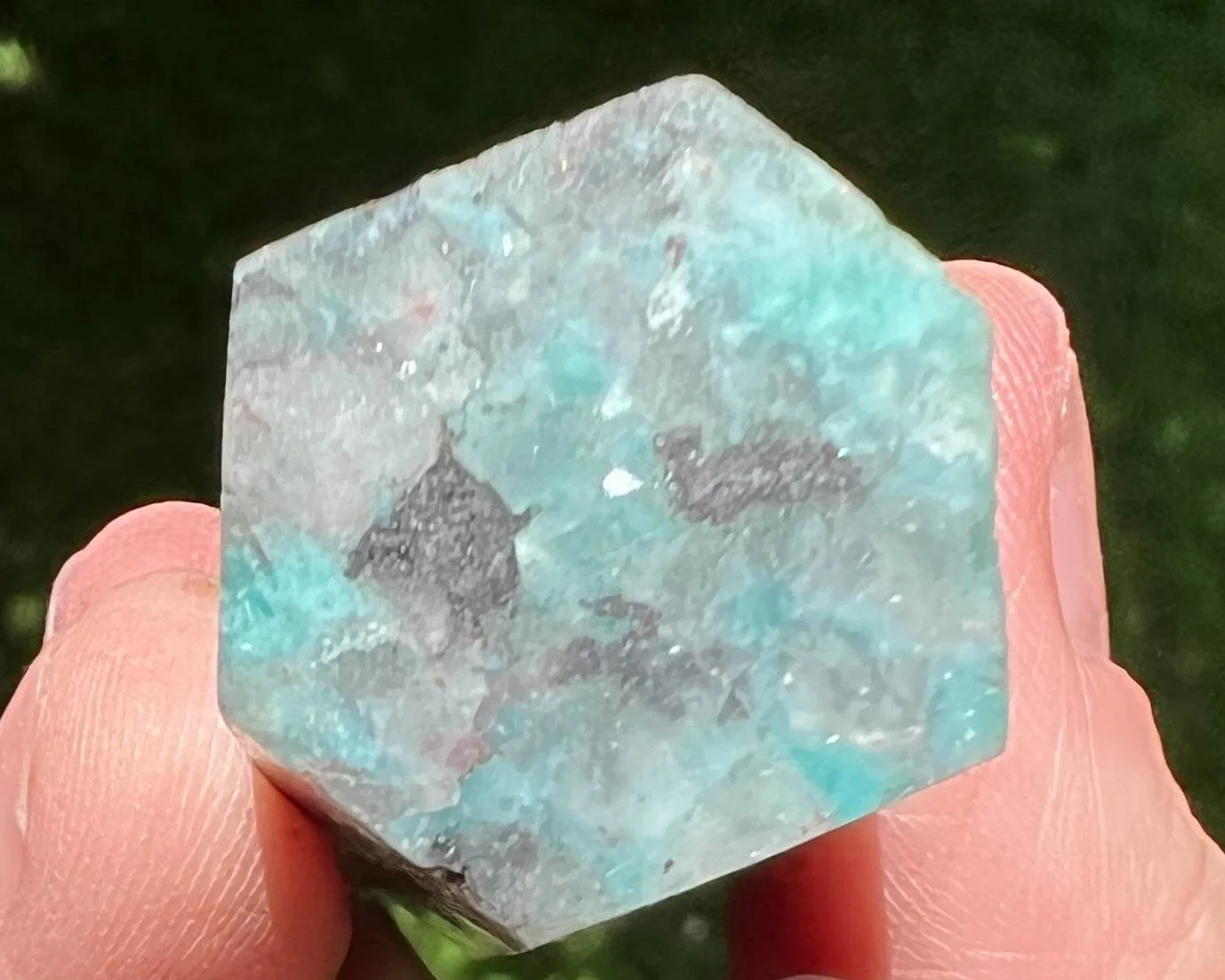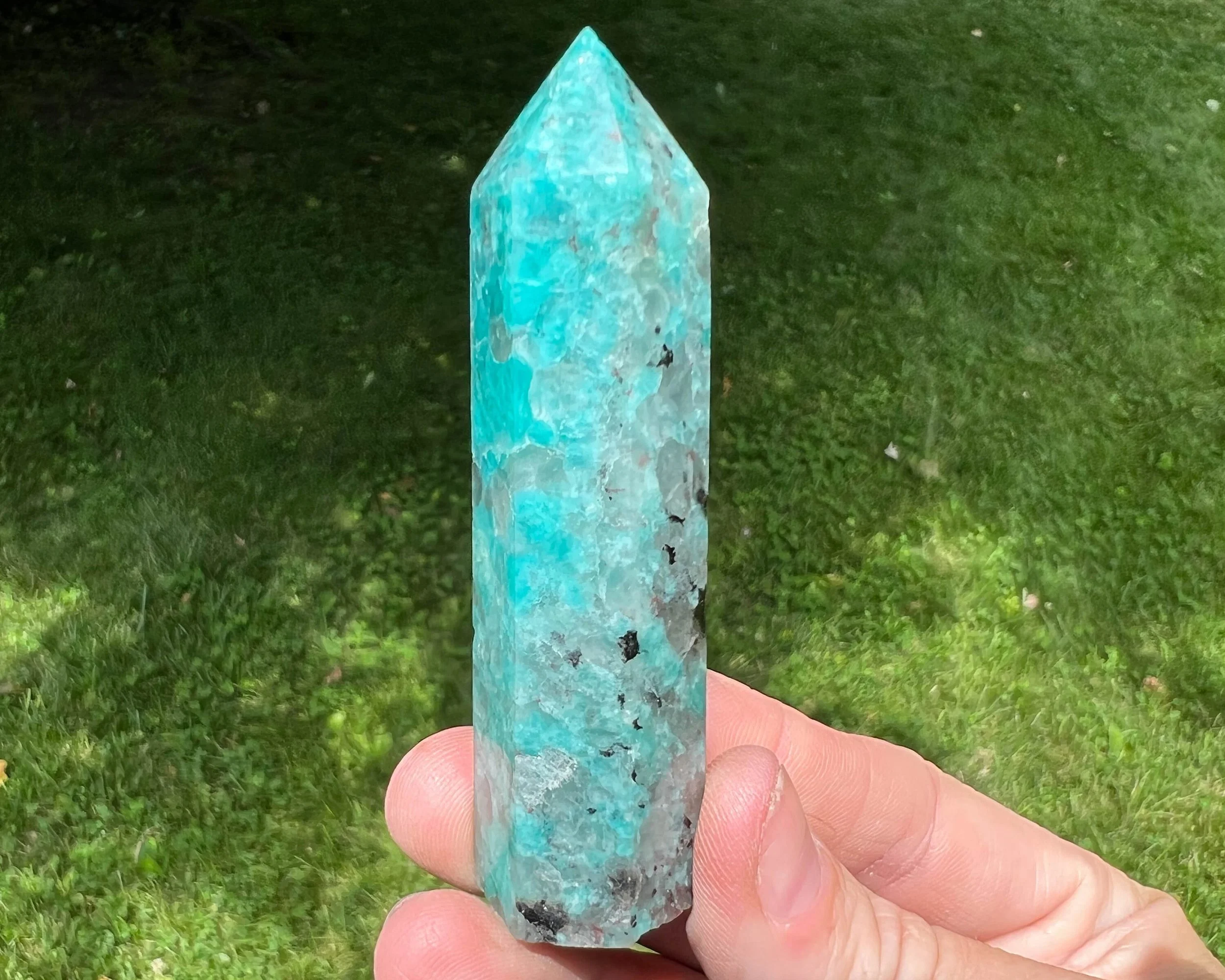 This is a beautiful self standing crystal tower of vibrant blue Amazonite with Smoky Quartz and Black Tourmaline. It has bright blue greens Amazonite with light and dark gray translucent Smoky Quartz with contrasting darker black. There may be some other minerals in there in small amounts too. Very pretty polished, self standing crystal point. Bright and a little sparkly too.