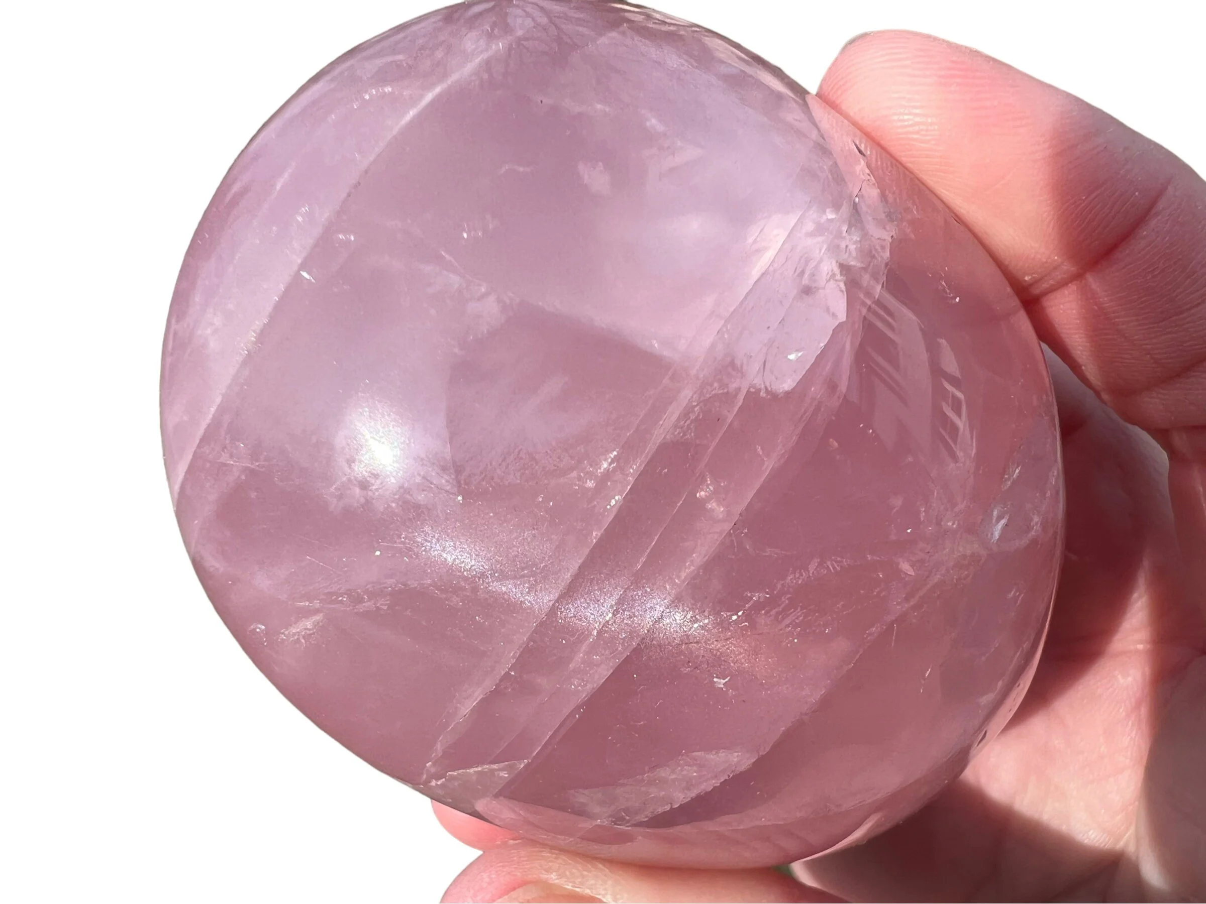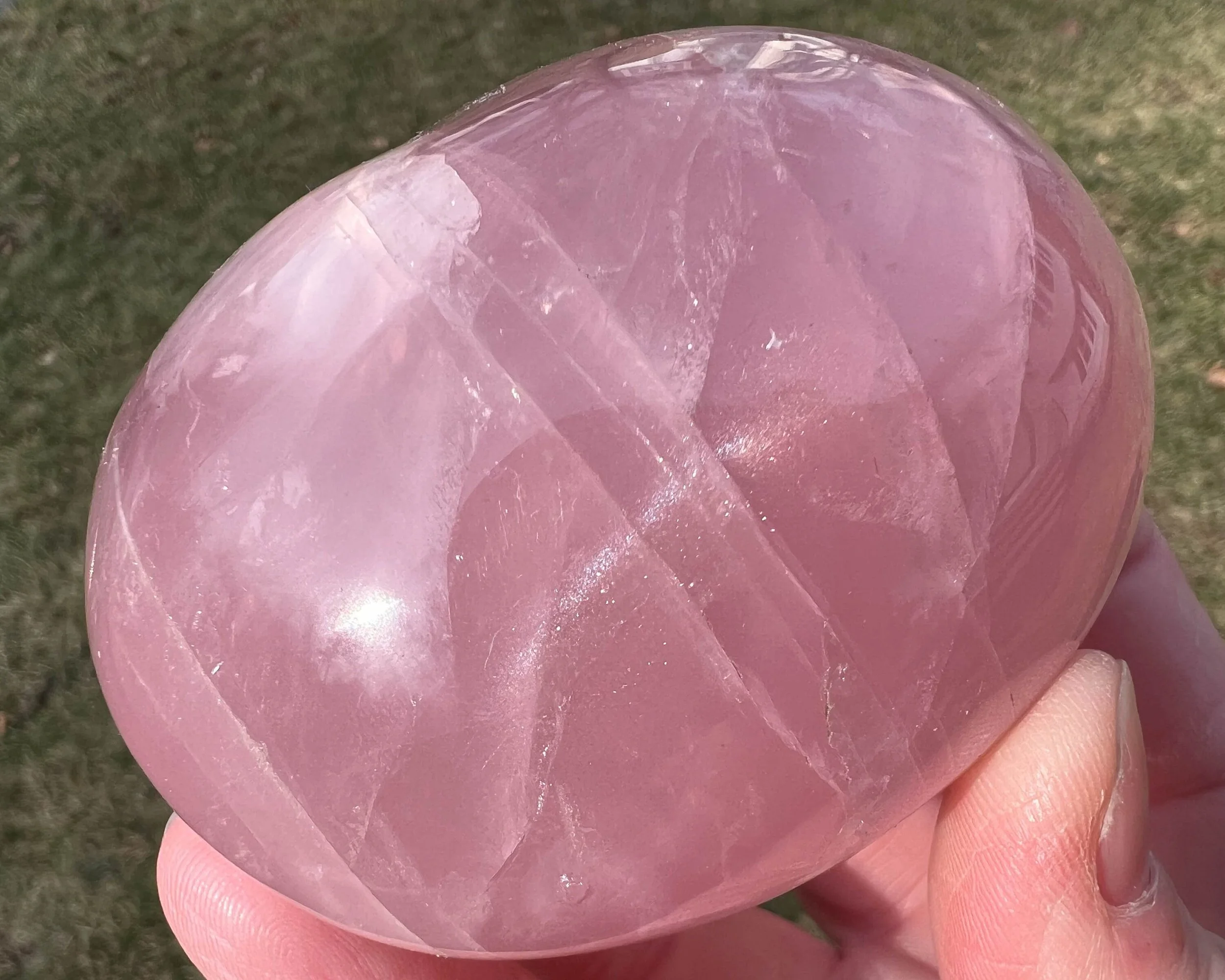 This is a beautiful large palm stone of Star Rose Quartz <3 It has asterism, meaning it has lines that move around in it which meet up in stars - or asterisks - especially in strong light or sunlight! This happens in spheres but you can still see the lines moving around in palm stones and other shapes.