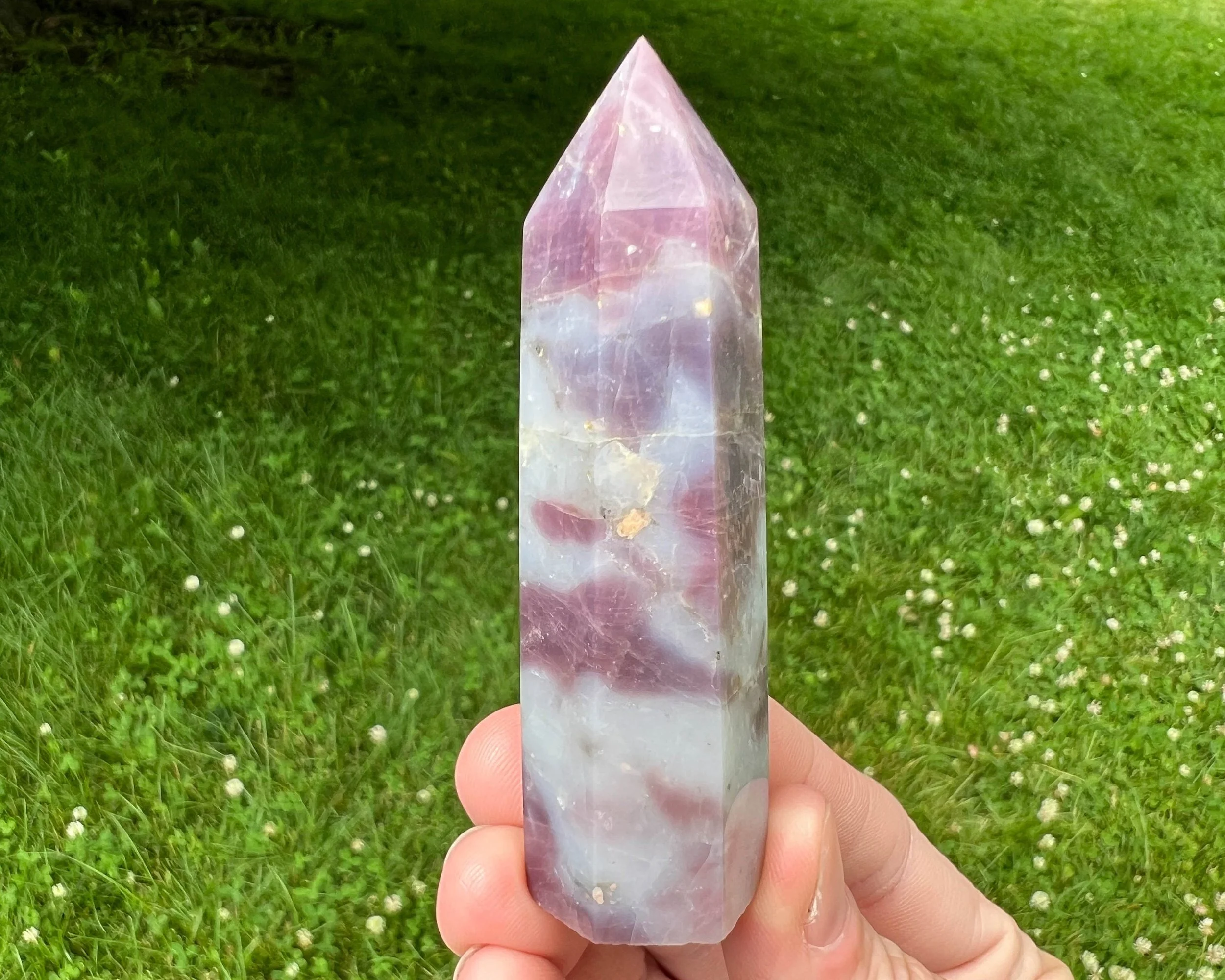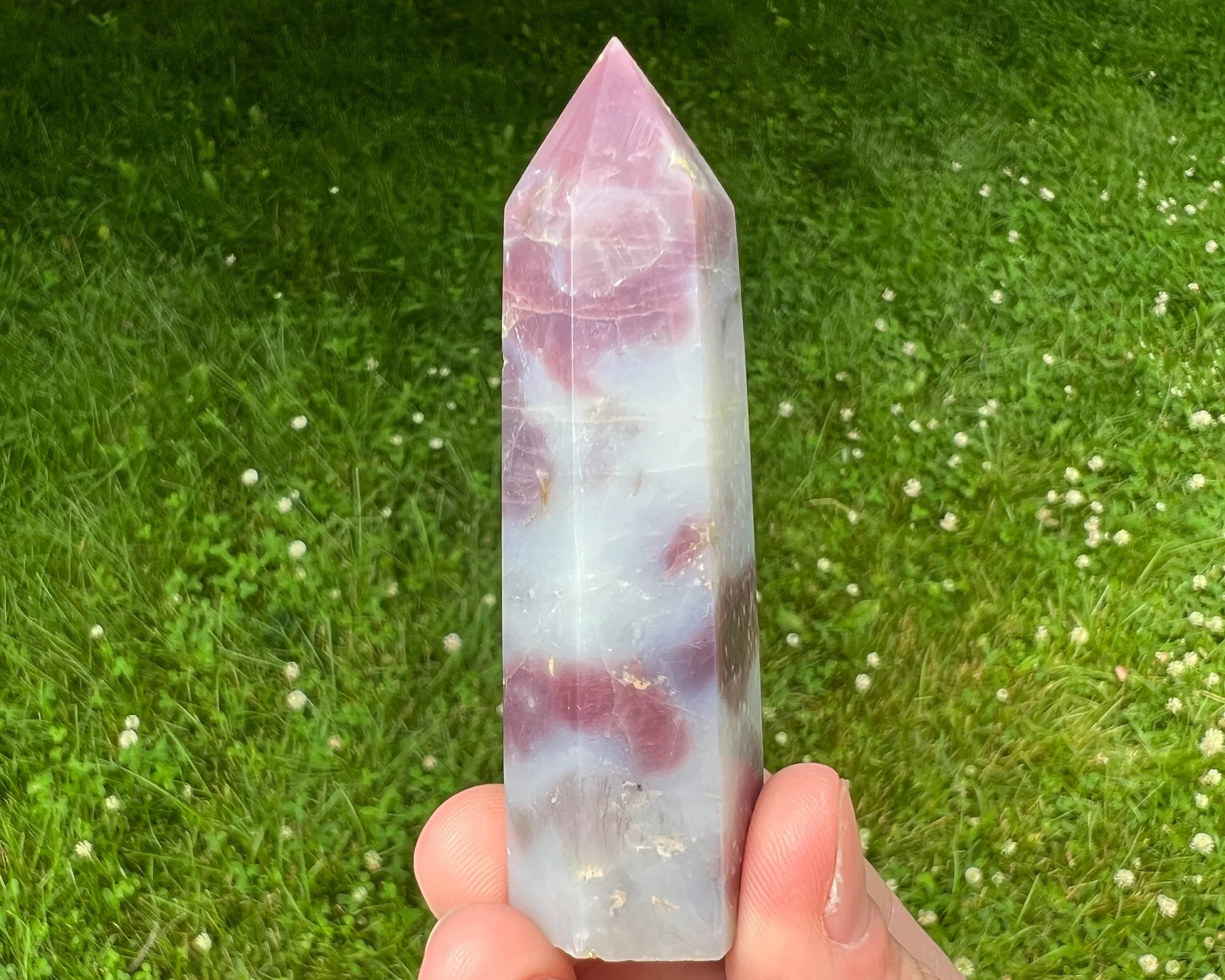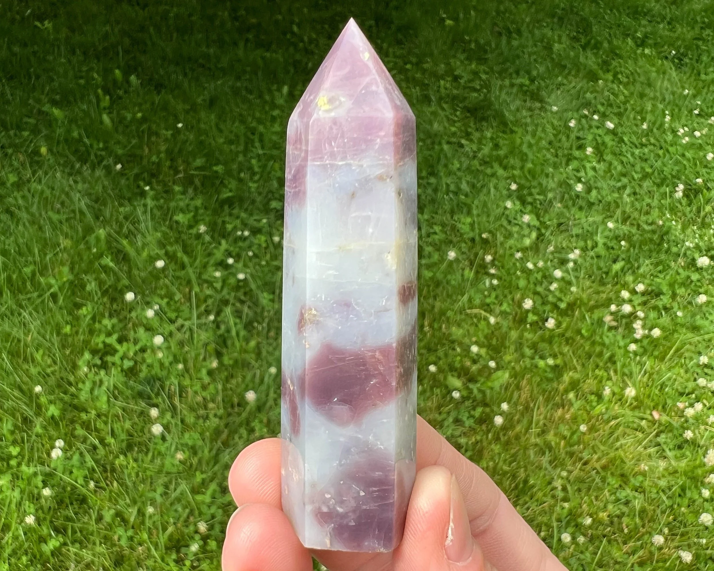 This is a Star Lavender Rose Quartz tower or point with the "lavender" coloring of purple and dark pink. The translucent, darker parts almost seem to have a glow to them. It is also Star Rose Quartz with asterism, aka lines that move through it in light. The lighter parts appear almost swirly. These beauties are really full of light and movement and patterns inside! Not like any other Rose Quartz I've ever seen!