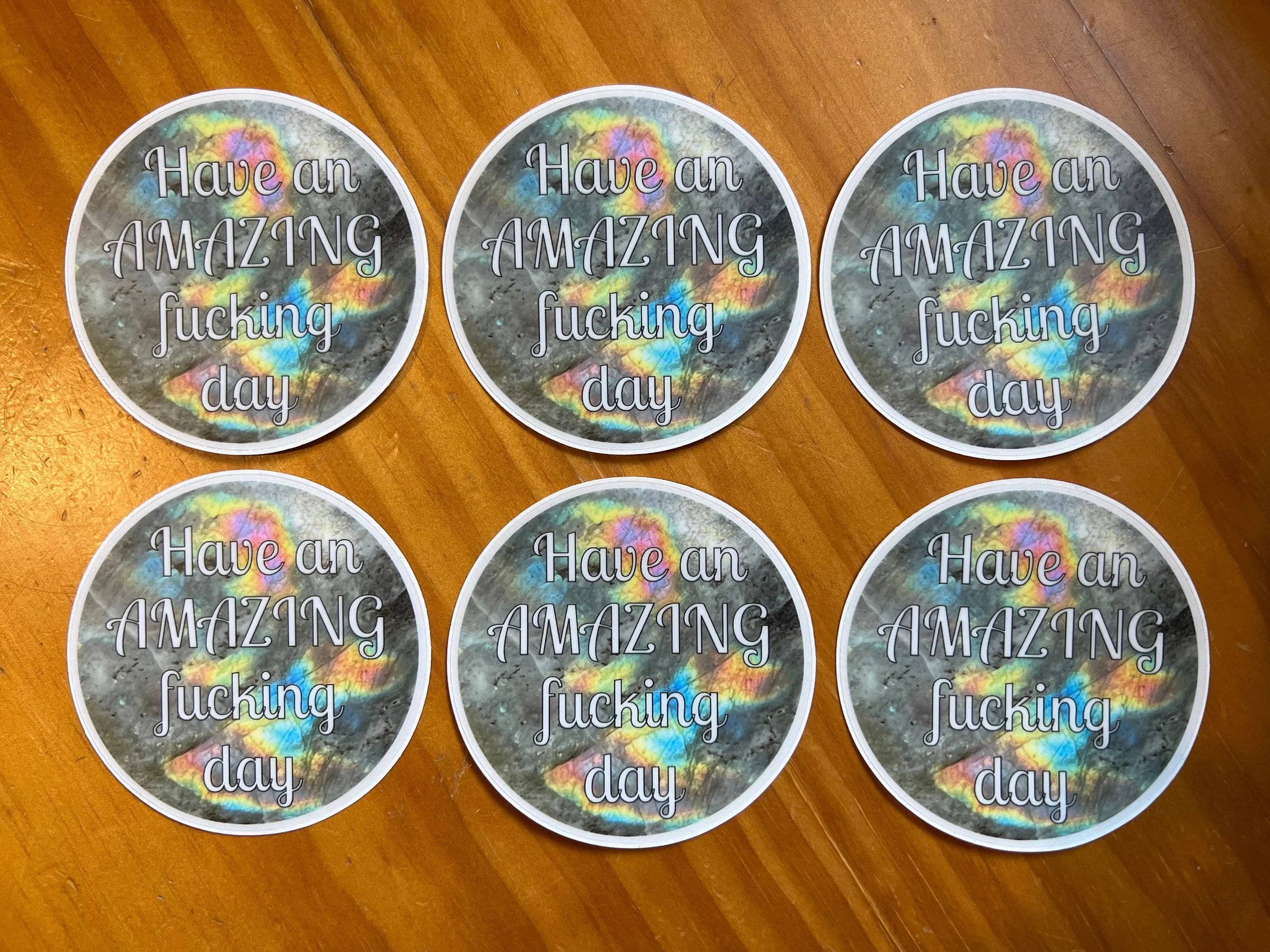 These round circle stickers say "have an AMAZING fucking day" and yes that's got a swear in it, I know. If you don't like swears feel free to pass along to the stuff without em.