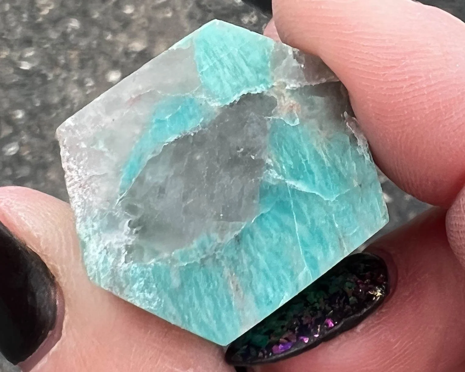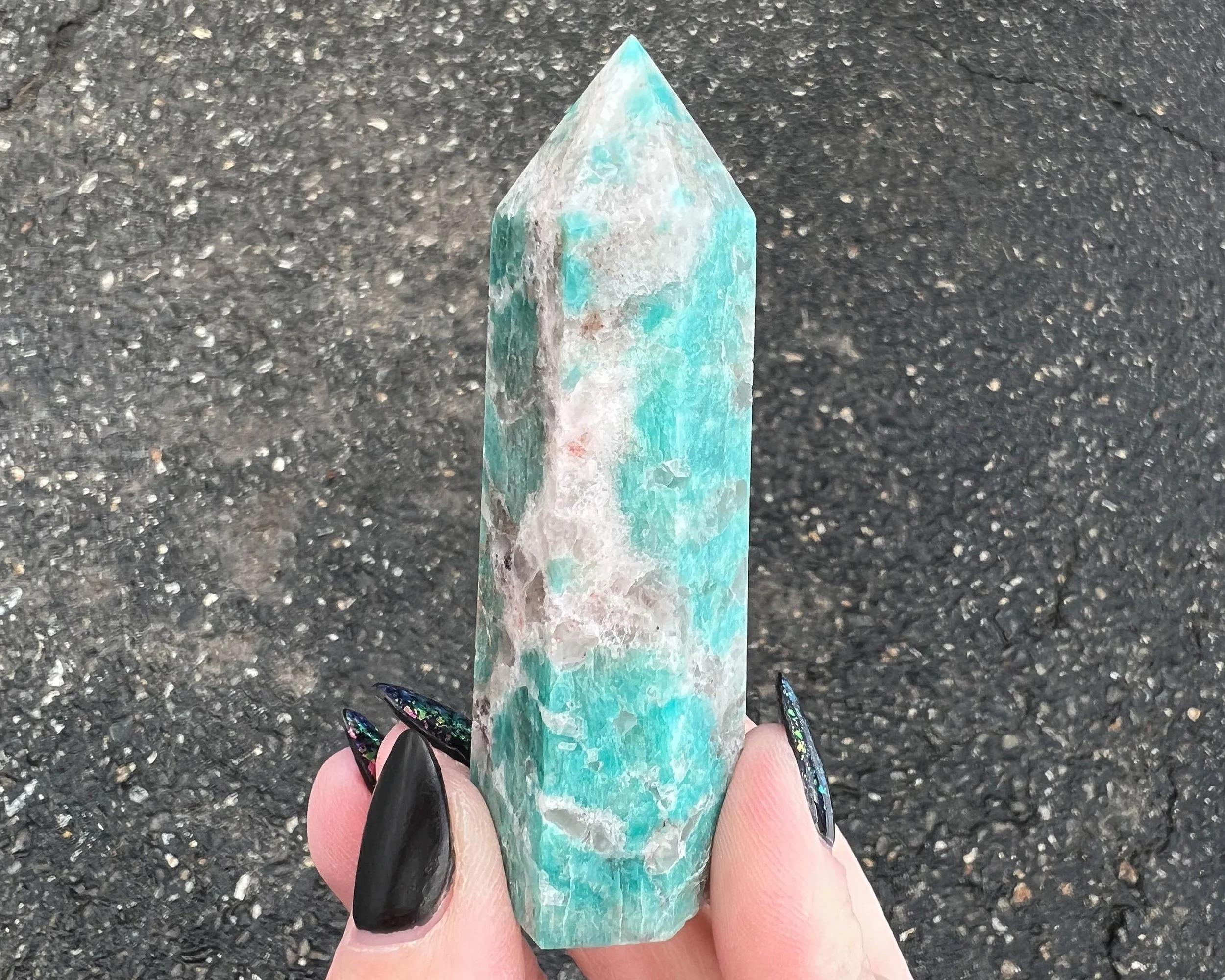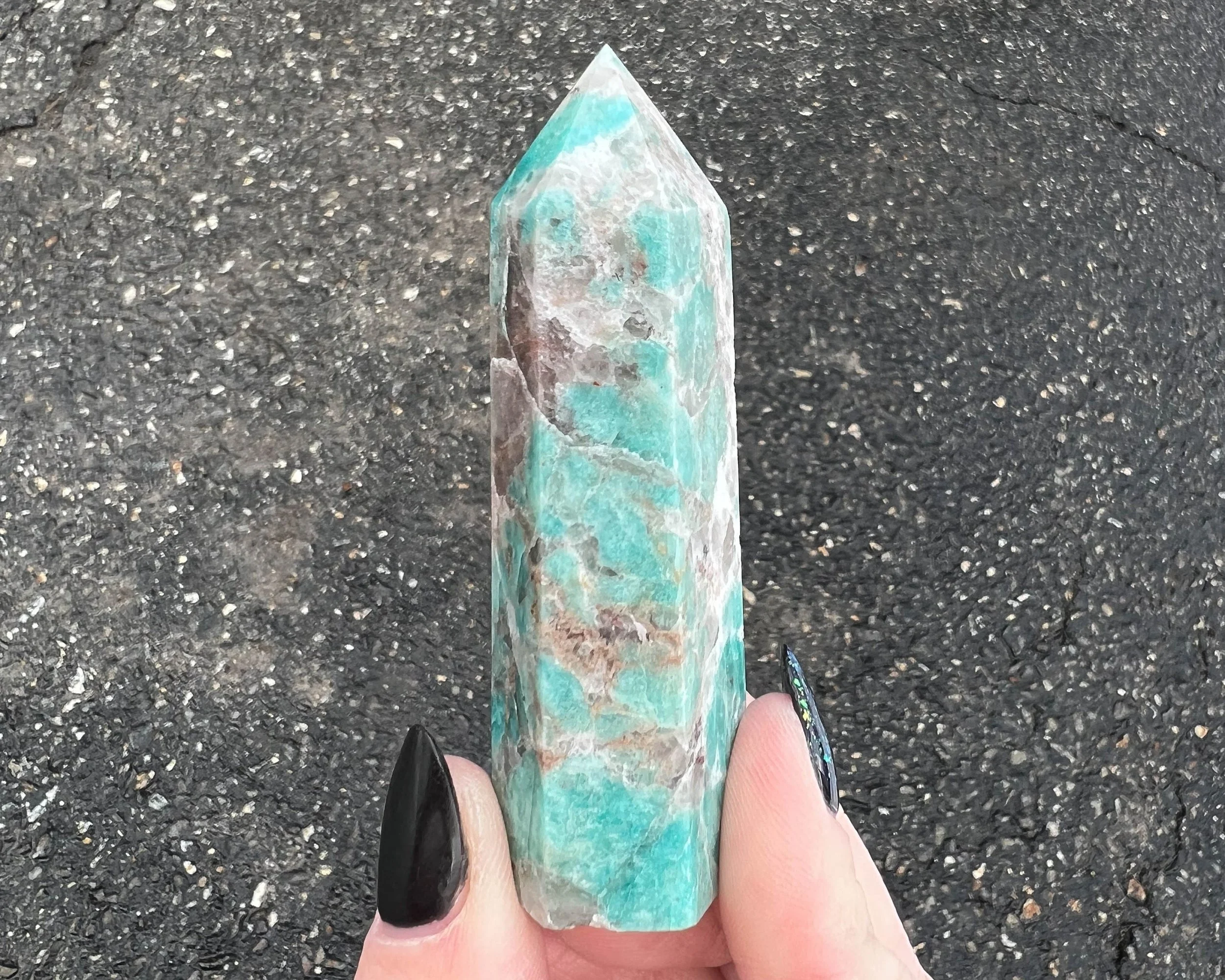 This is a beautiful and vibrant tower of vibrant Amazonite with Smoky Quartz. It has bright blue greens Amazonite with light gray translucent Smoky Quartz. There may be some other minerals in there in small amounts too. Very pretty polished, self standing crystal point.