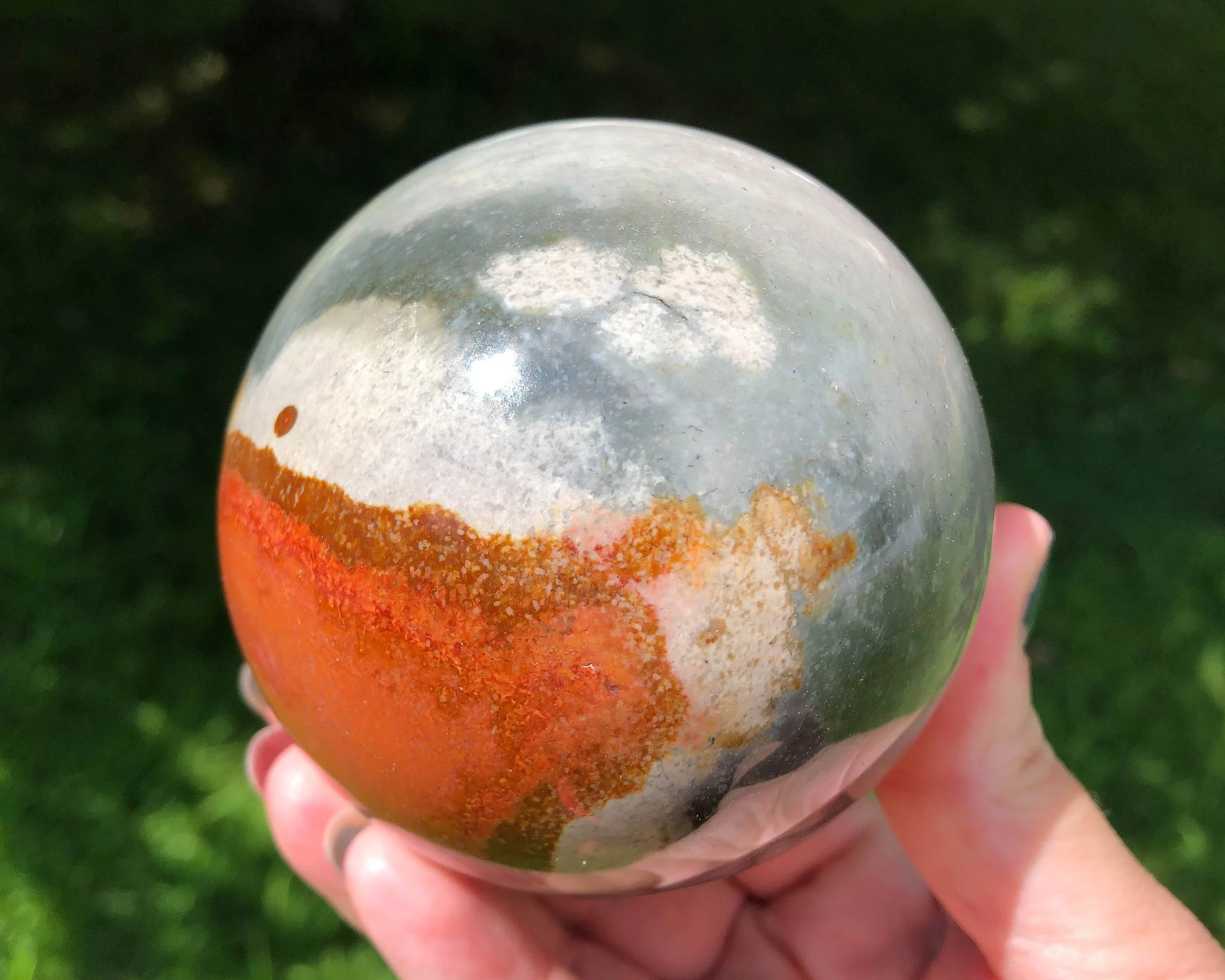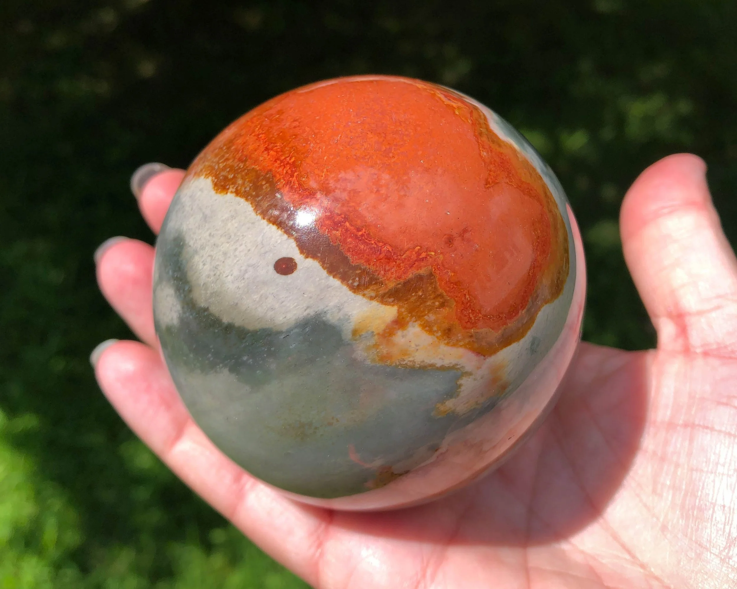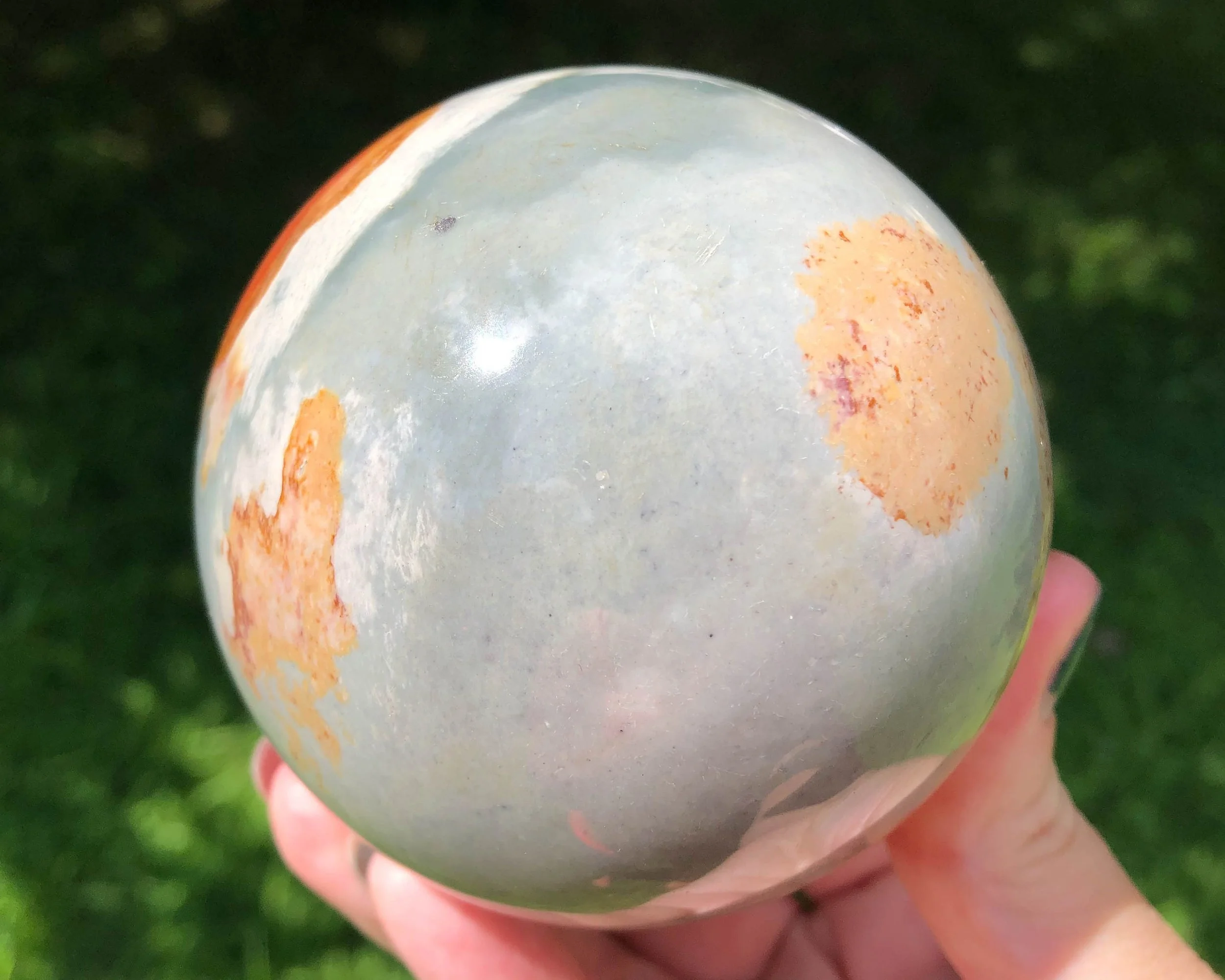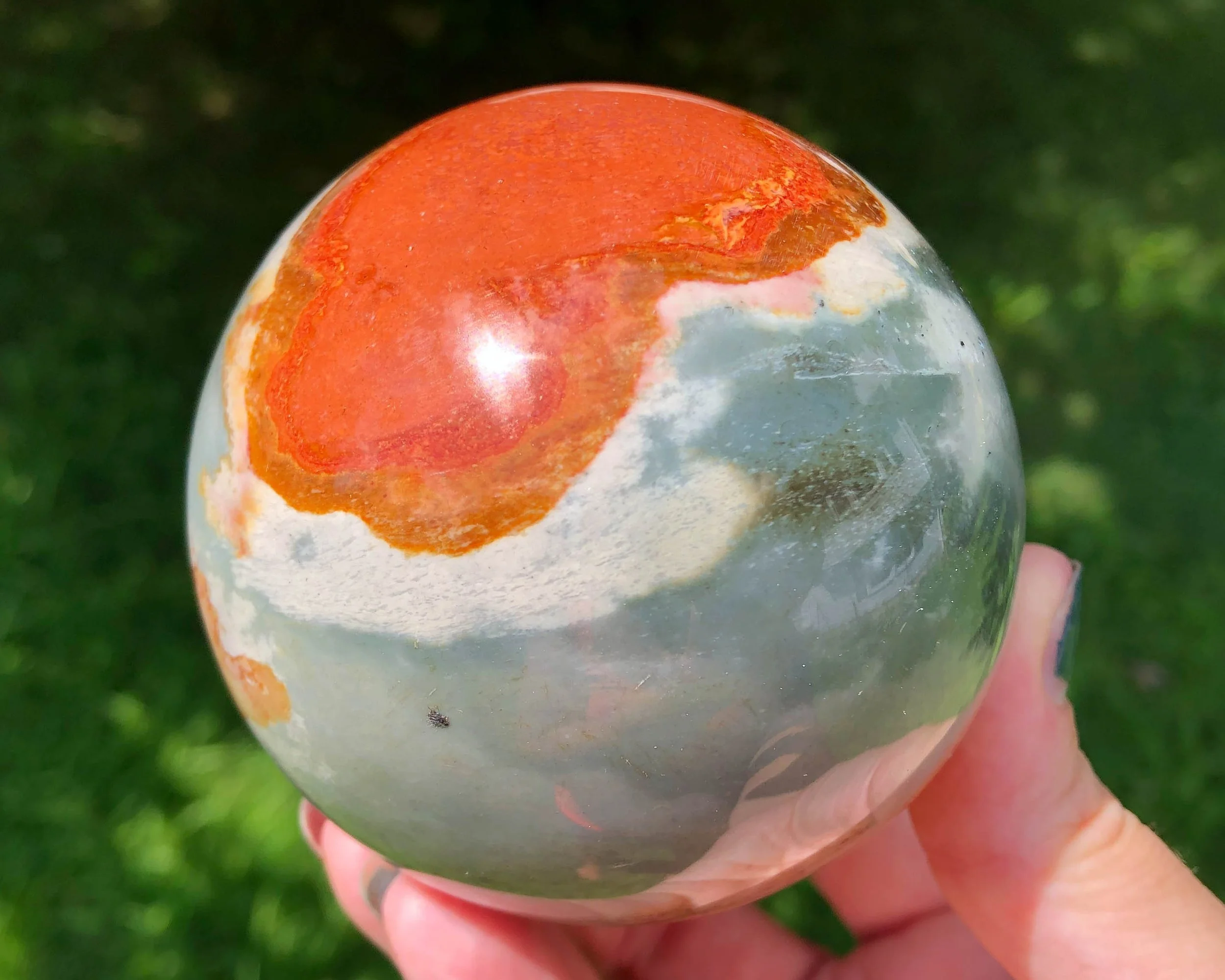 This is a beautiful, colorful sphere of Polychrome Jasper, also known as Desert Jasper. It has warm reds and pinks with deep enduring blues :) A very pretty sphere <3
