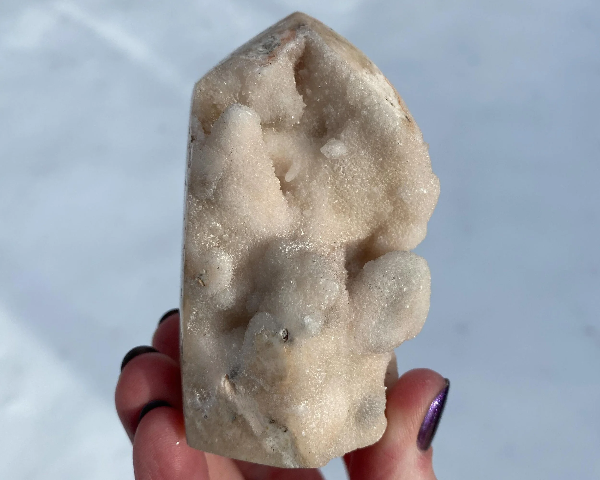 This is a wonderful tower carved from sparkly druzy Quartz covering either Chalcedony or Agate or perhaps both. It is lumpy and bumpy and full of funky caves. It is mostly white, mostly natural with some polished spots to shape it into a point. Very cool self standing piece.