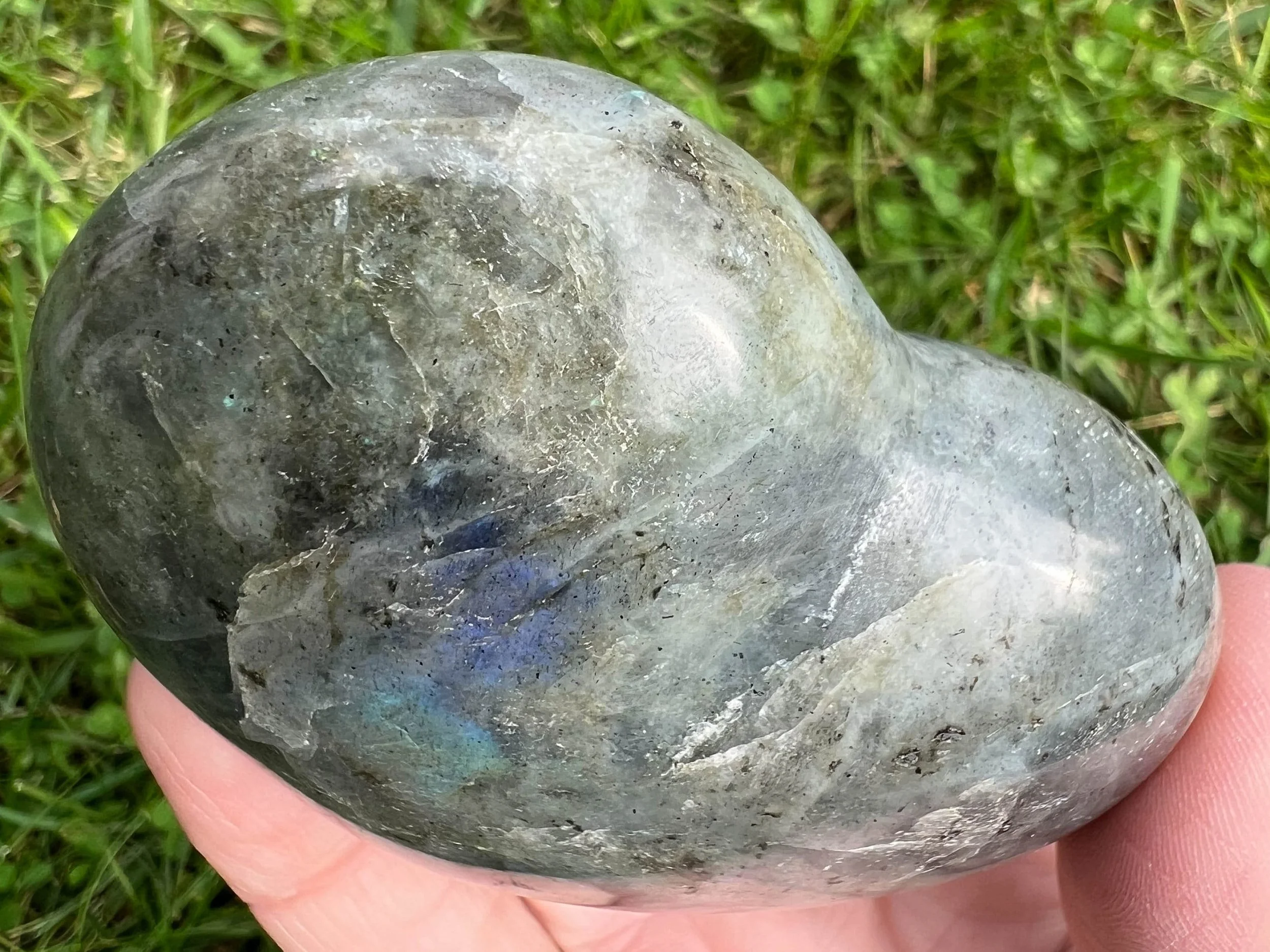 This gorgeous flashy Labradorite heart has beautiful purple and pink flash, with bright teals, blues, orange, green and yellow - All the rainbow fire in it, and the other side has little bits of blue and yellow. It is really pretty and definitely better in person! It has a really great shimmer / schiller that runs throughout the entire thing. A beautiful crystal heart. This is a natural stone carved and polished into a heart rounded on both sides.