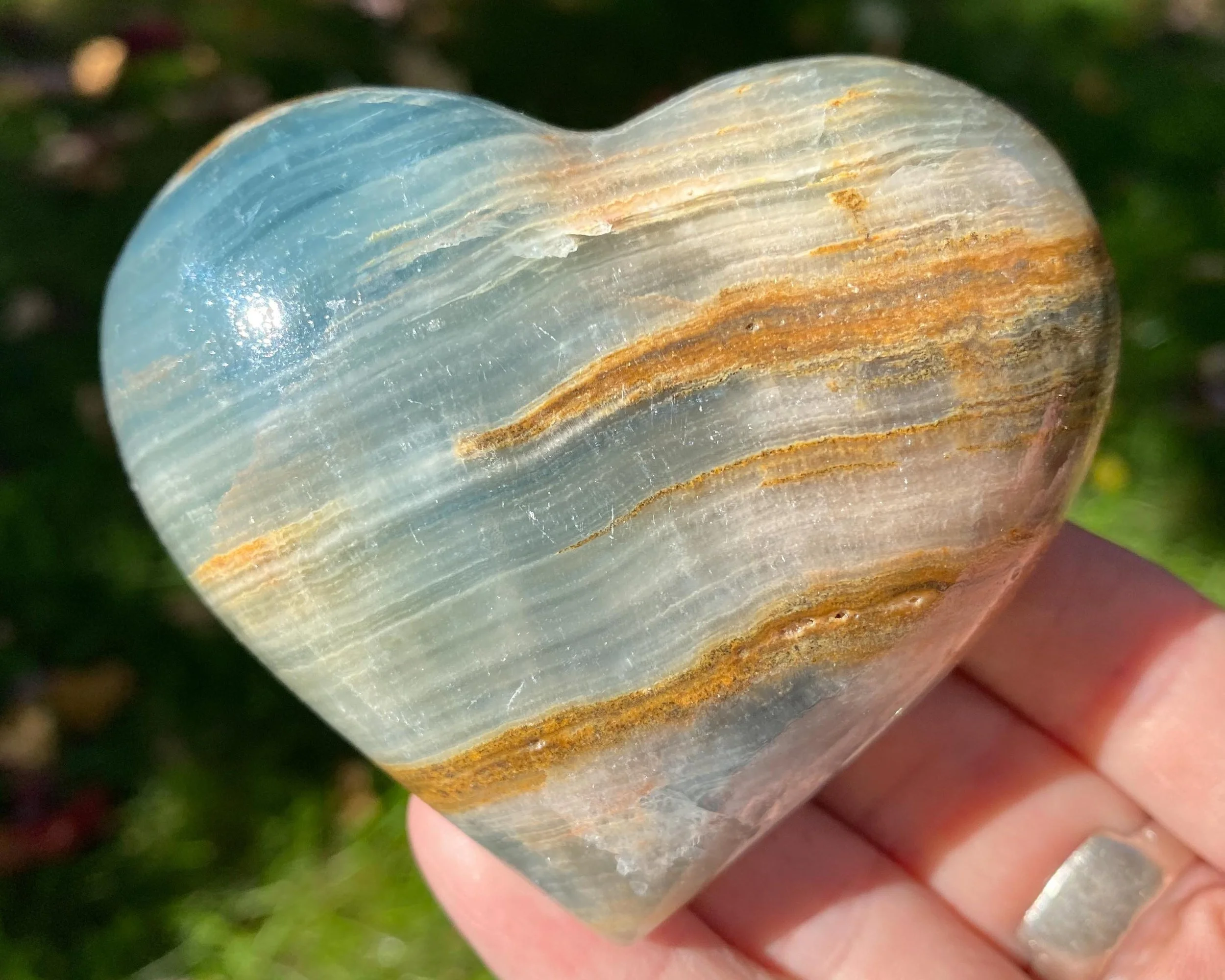 This is a heart carved from dreamy blue "Aquatine Lemurian" Calcite from Argentina. It has a gorgeous deep blue color. It is a rare and exquisite material.