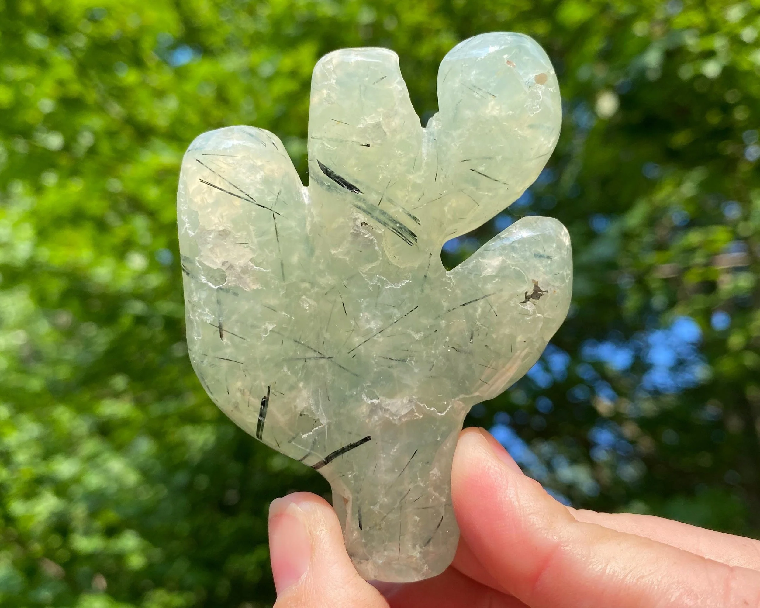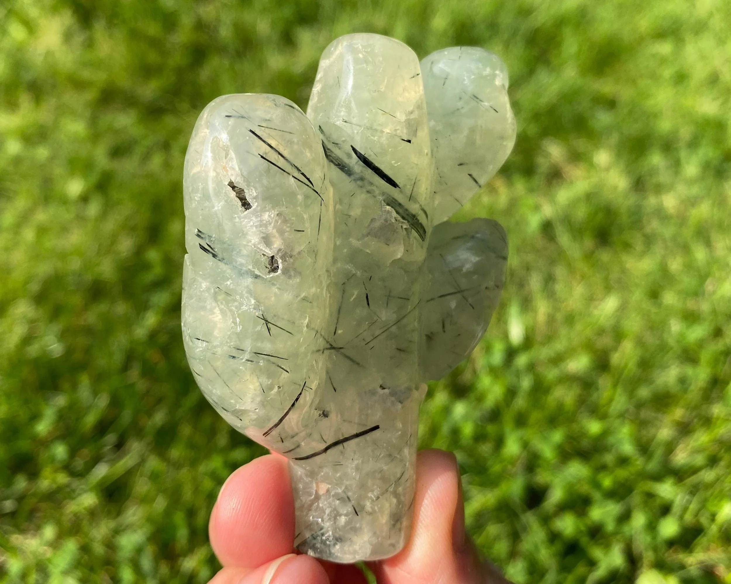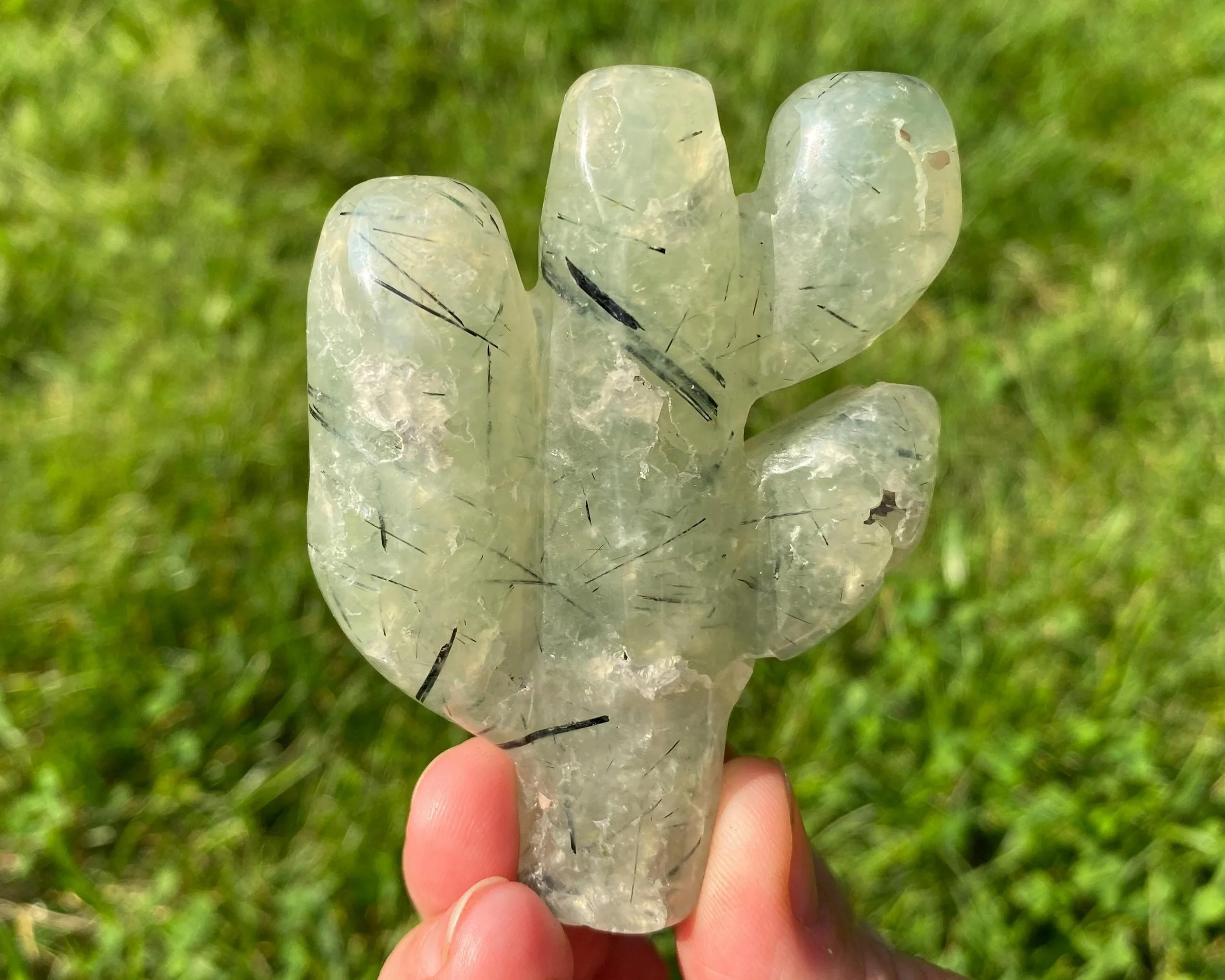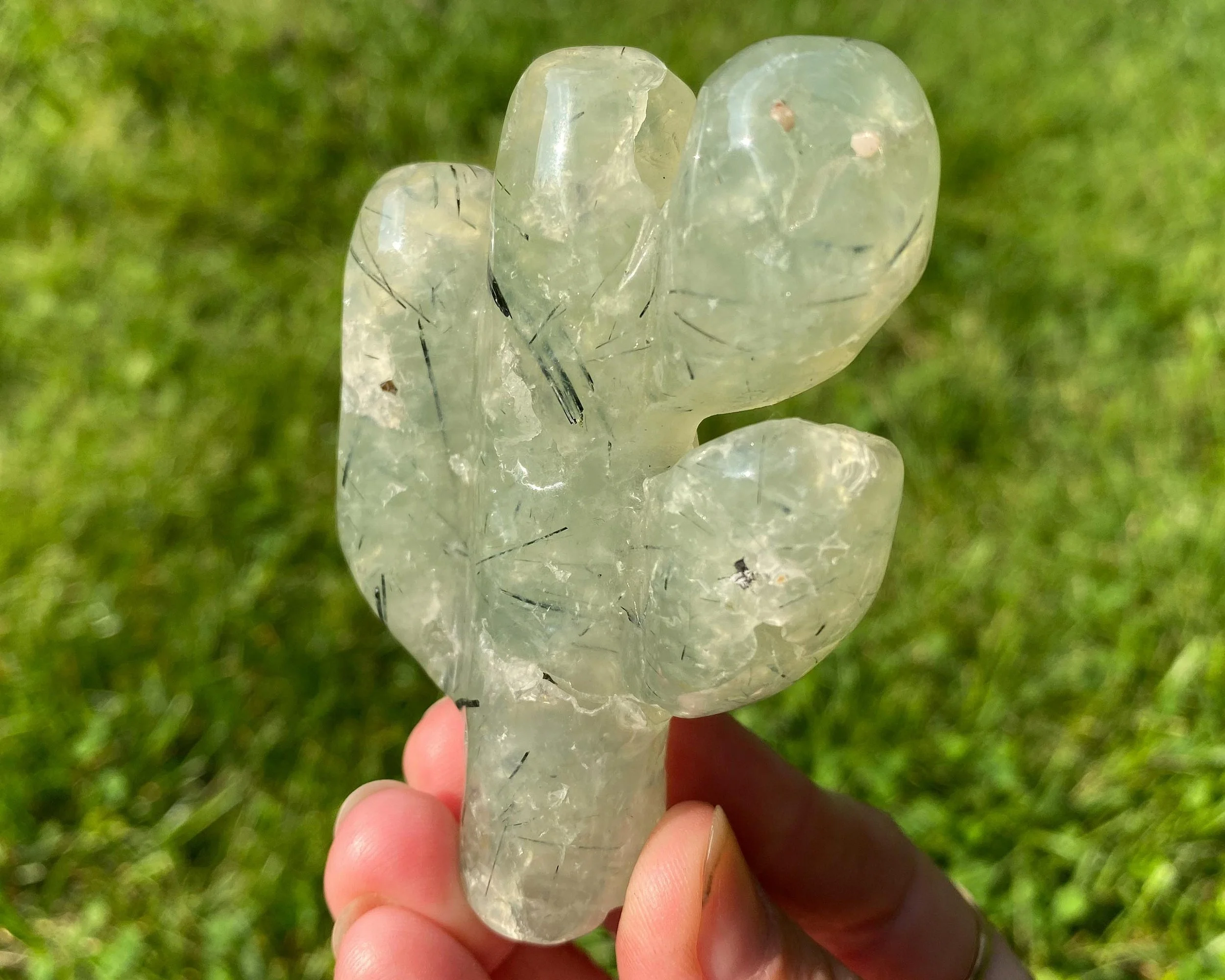 This is a Saguaro cactus carved from beautiful green Prehnite with Epidote inclusions. These are self standing, polished pieces. Some may have small rough spots or holes that are natural characteristics of the stone. These are great for any cactus or desert lover <3