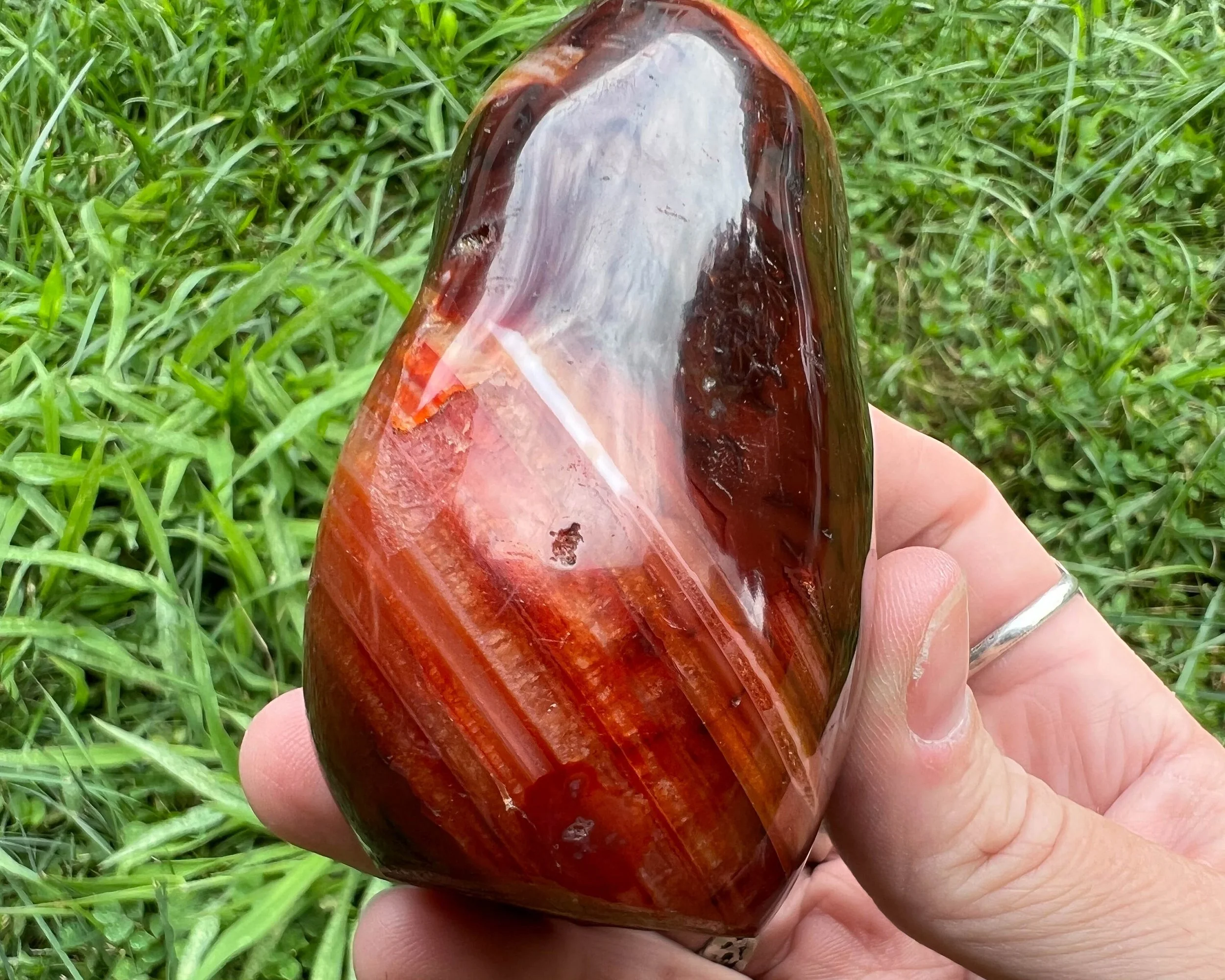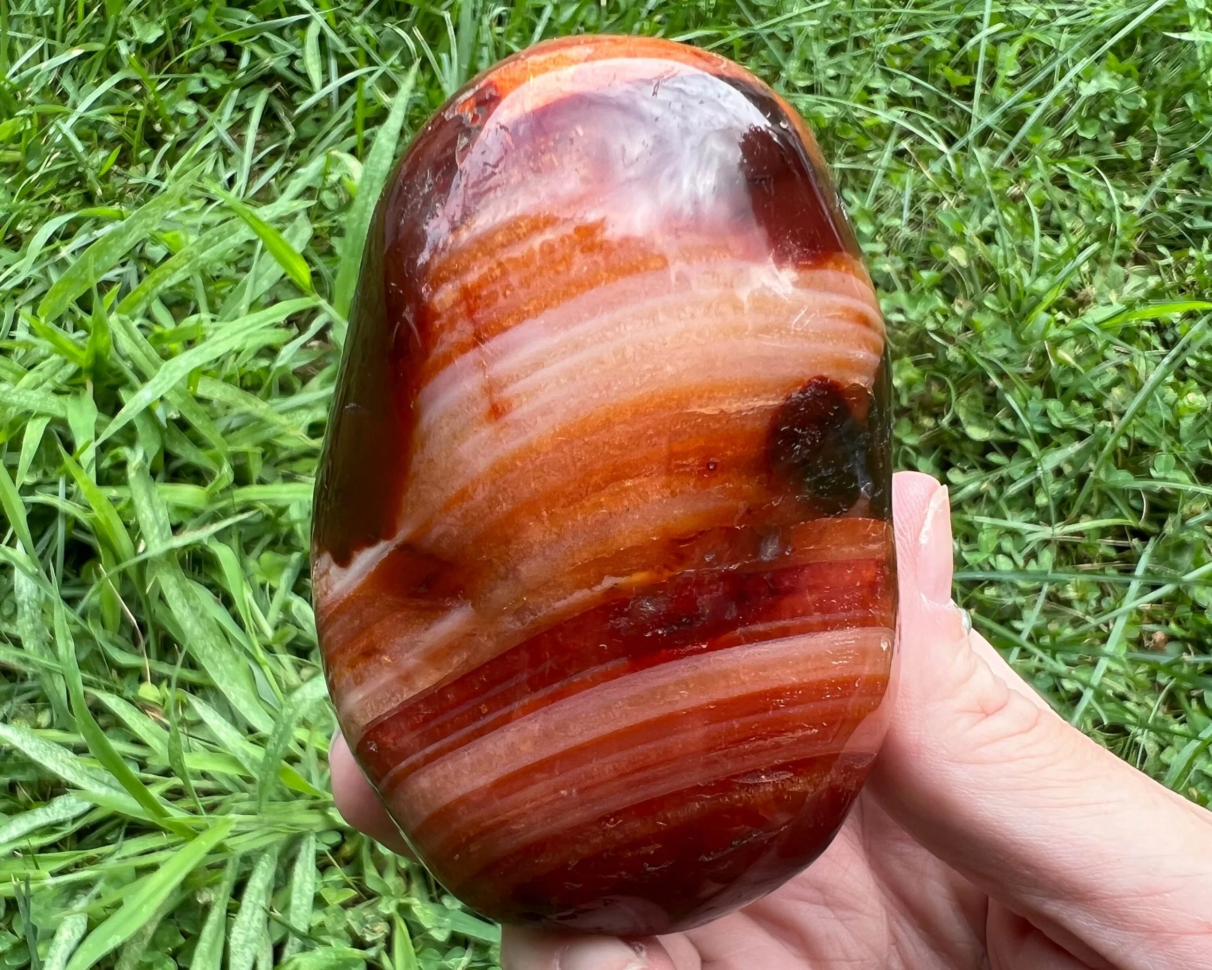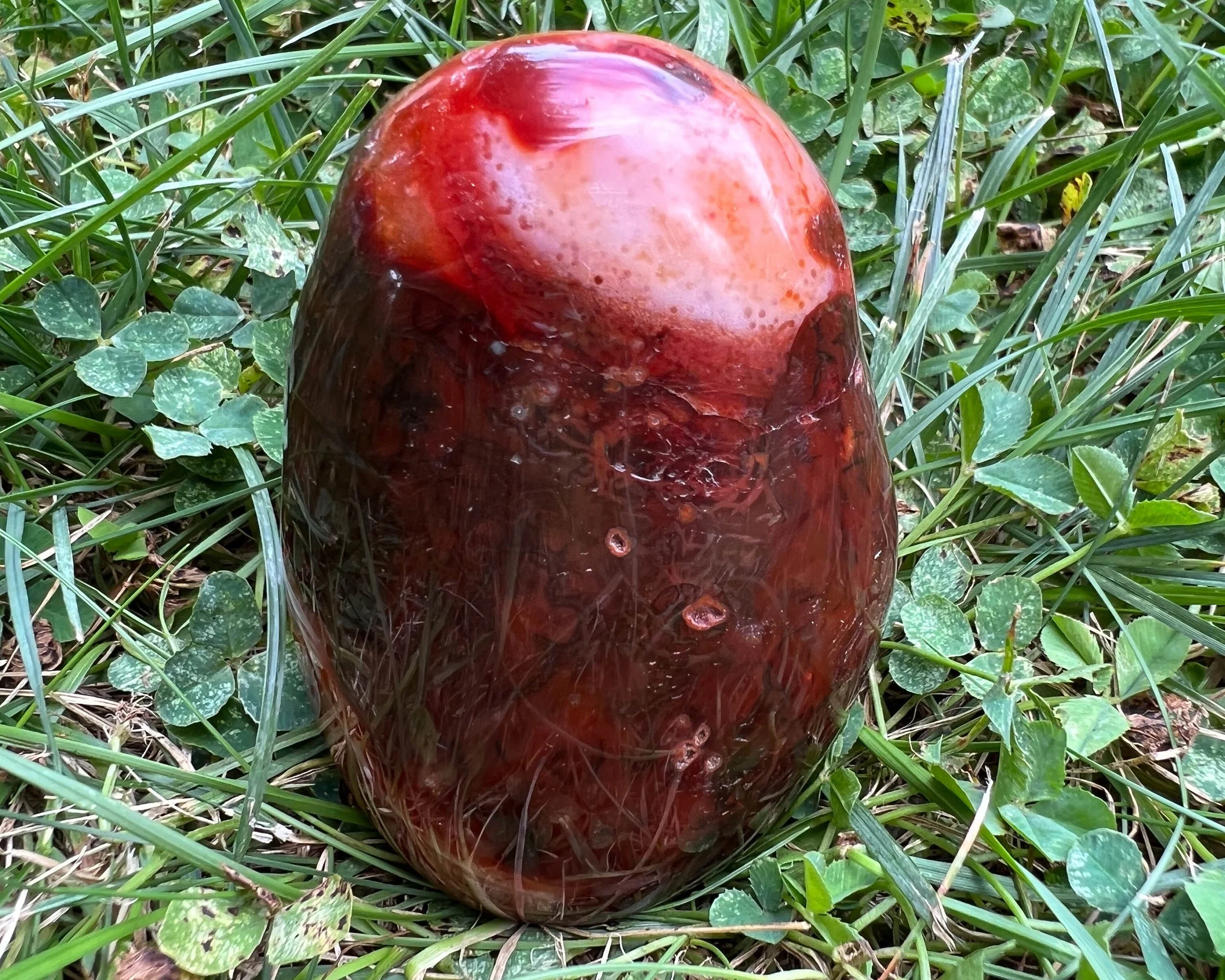 This is a self-standing Carnelian Agate freeform display piece with beautiful coloring that has beautiful dark and bright reds, warm vibrant oranges, and contrasting translucent clear / white. It has lovely banding, funky vein-like patterns and tiny polka dots too :)