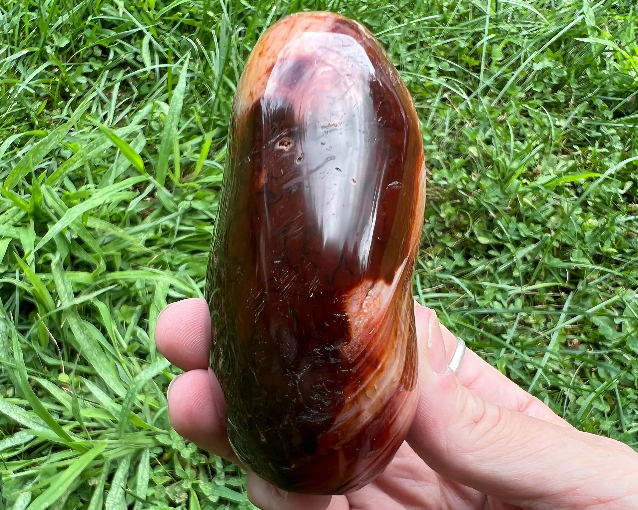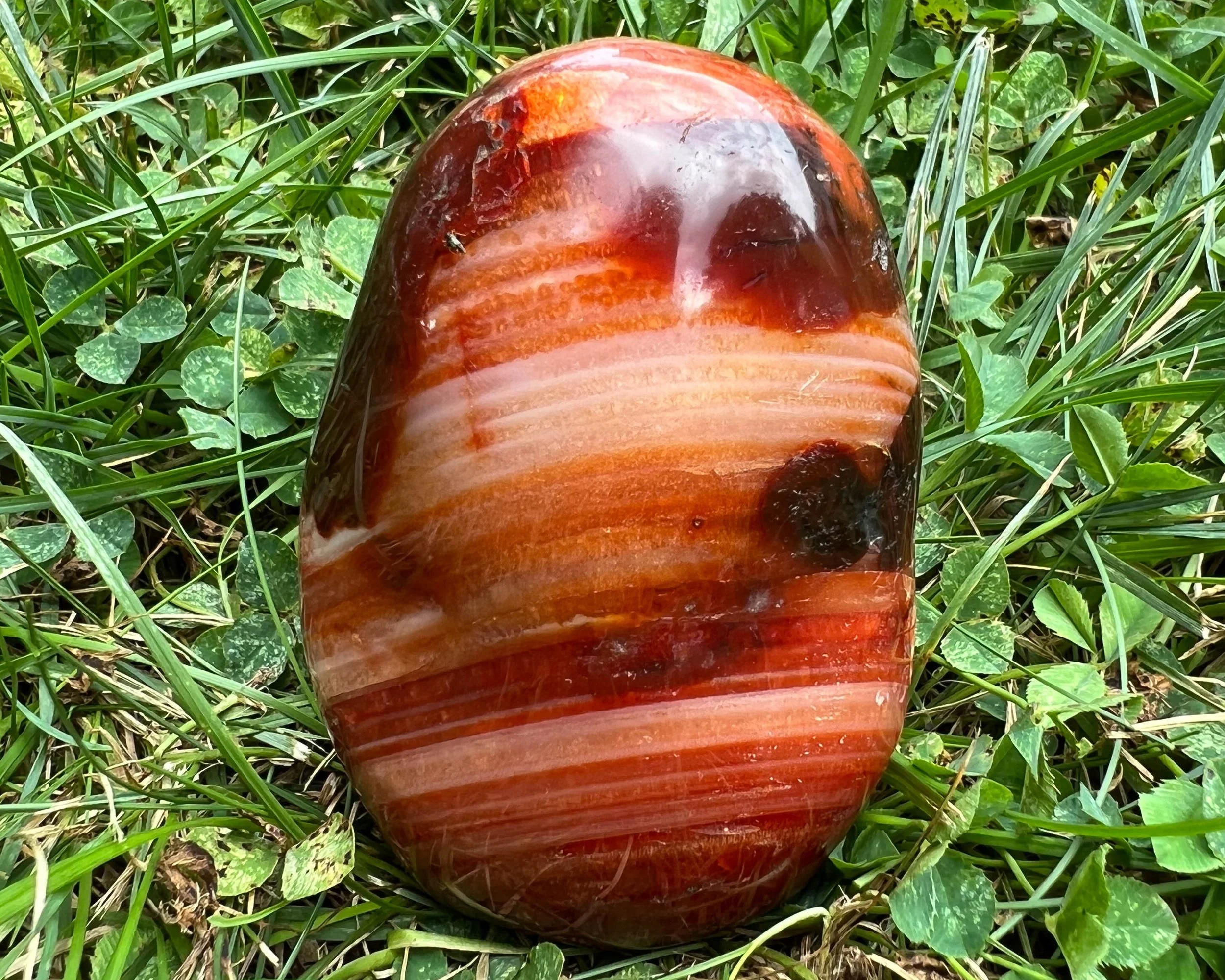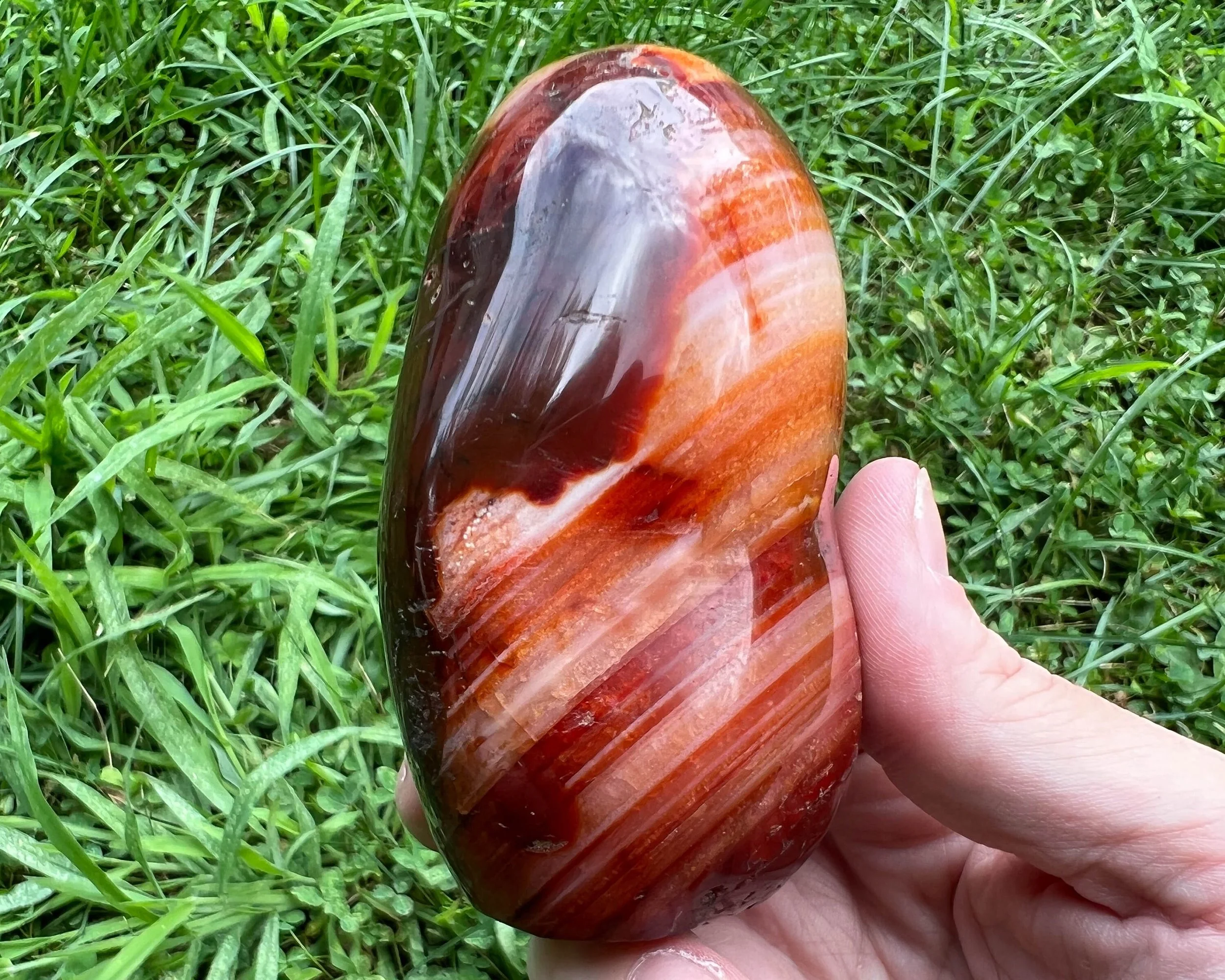 This is a self-standing Carnelian Agate freeform display piece with beautiful coloring that has beautiful dark and bright reds, warm vibrant oranges, and contrasting translucent clear / white. It has lovely banding, funky vein-like patterns and tiny polka dots too :)