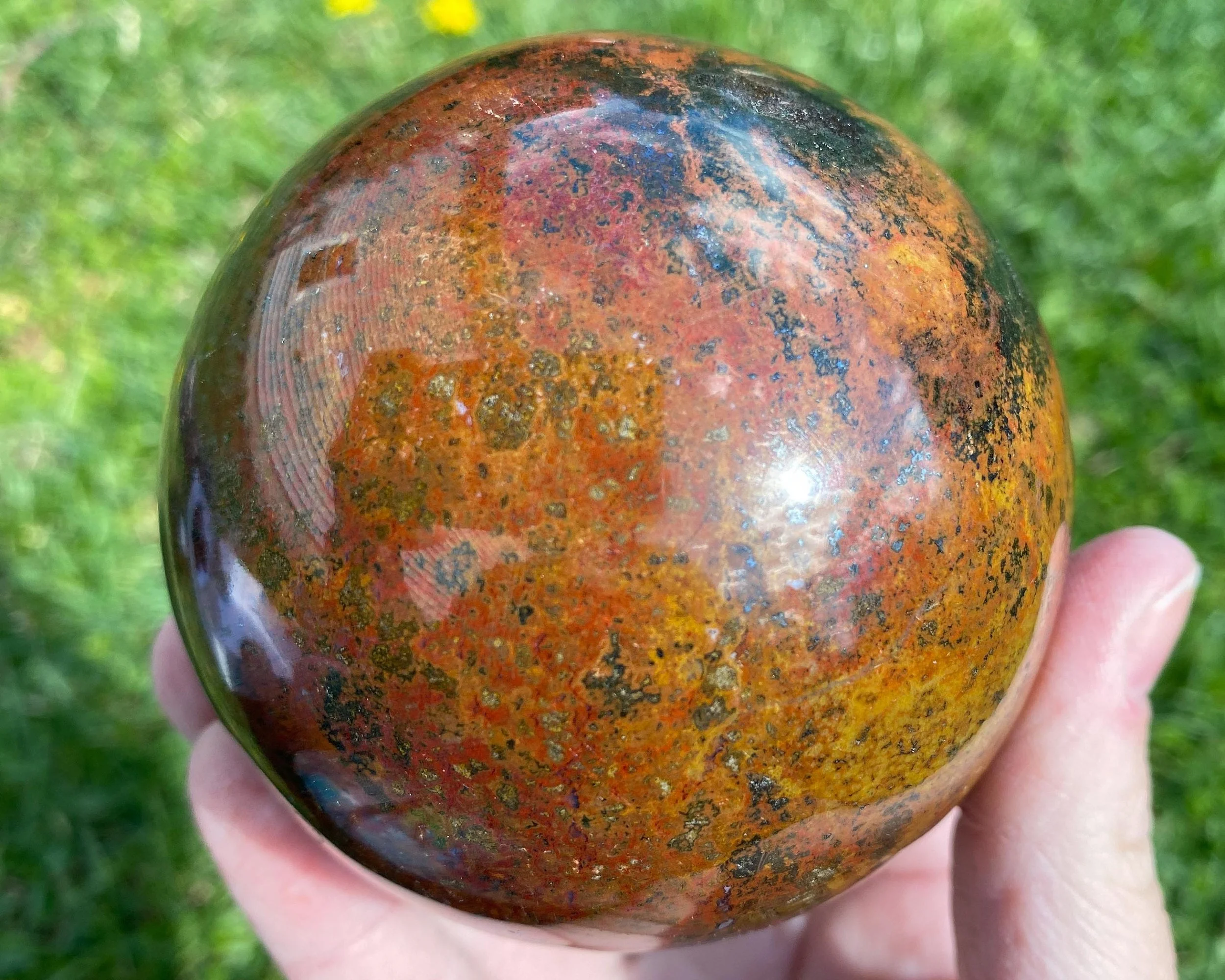 This is a magnificent sphere of Ocean Jasper! It has beautiful coloring of deepreds and pinks with greens, oranges, yellows and purples all around. Very lovely and aesthetic. <3