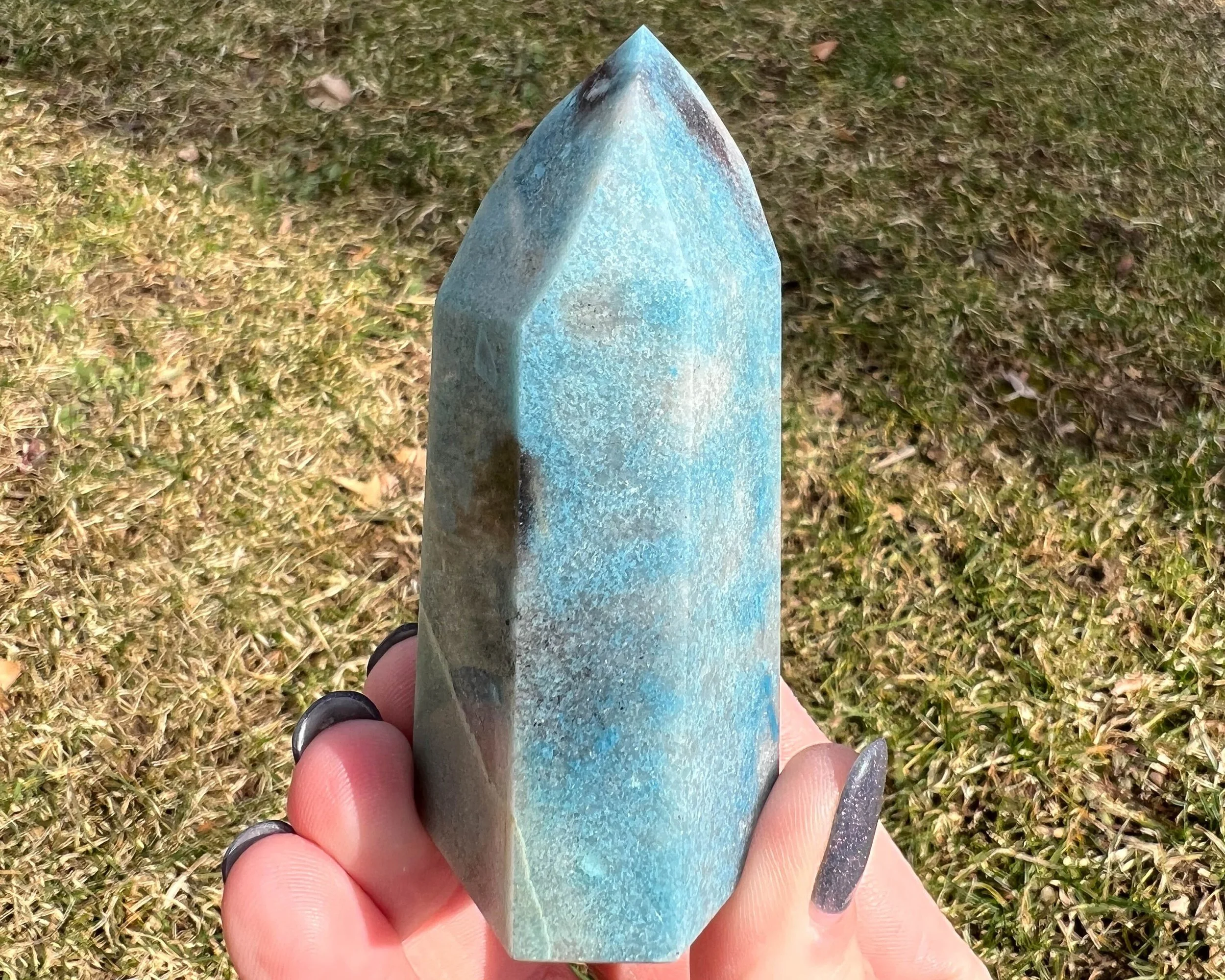 This is a beautiful crystal tower of natural Trolleite with blue, black and gray coloring. It is a polished and self standing point. It has beautiful patterns and is even a bit sparkly. <3