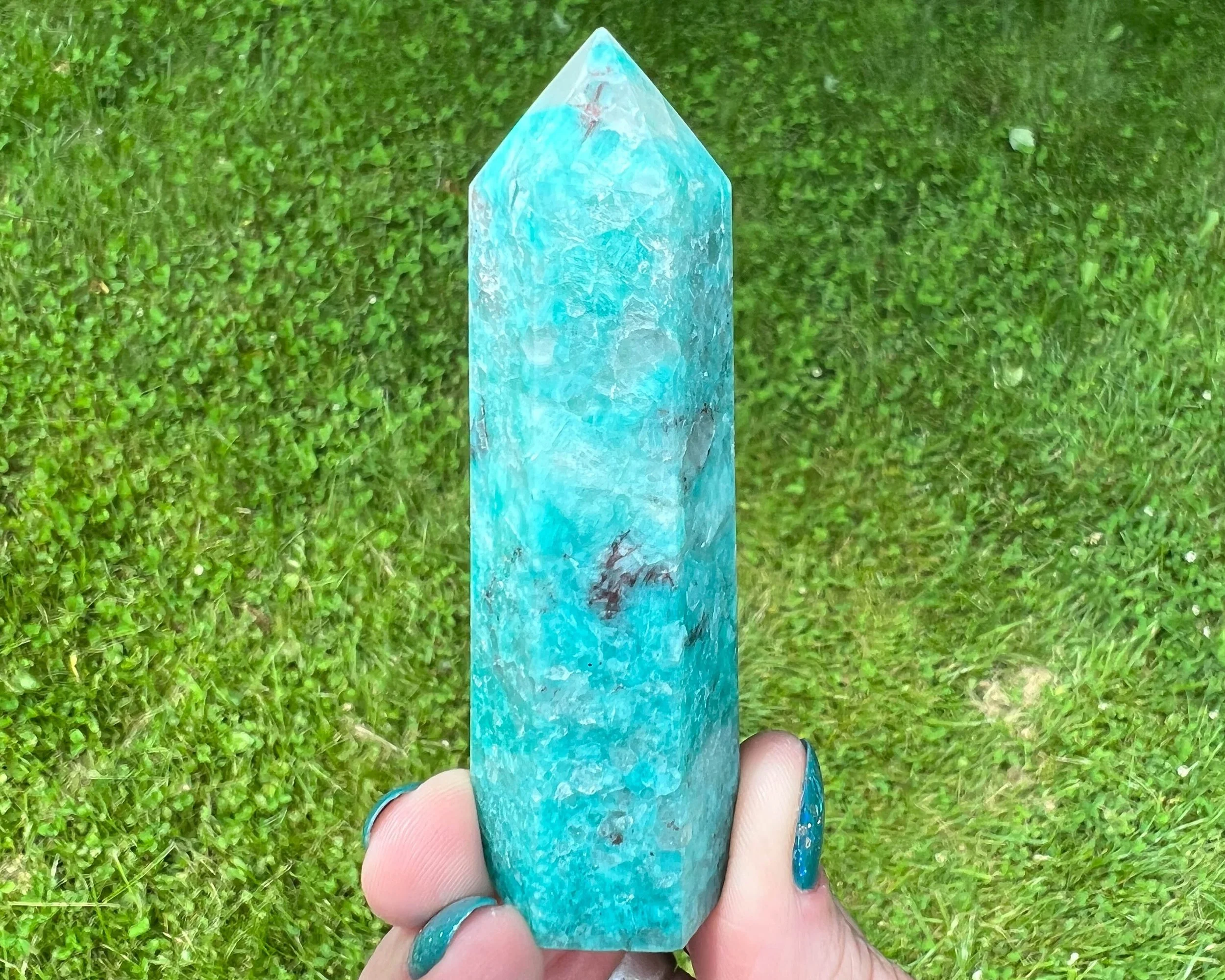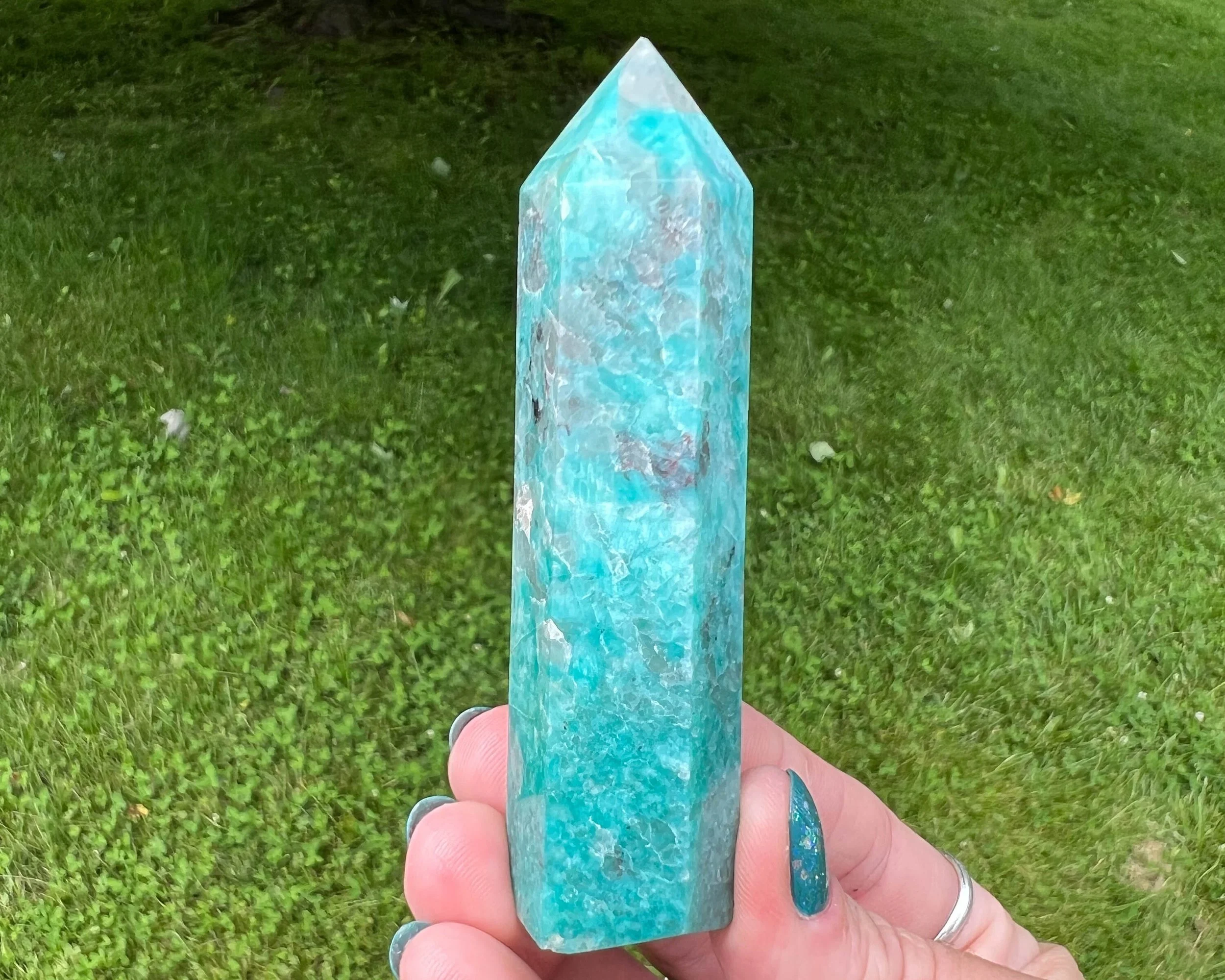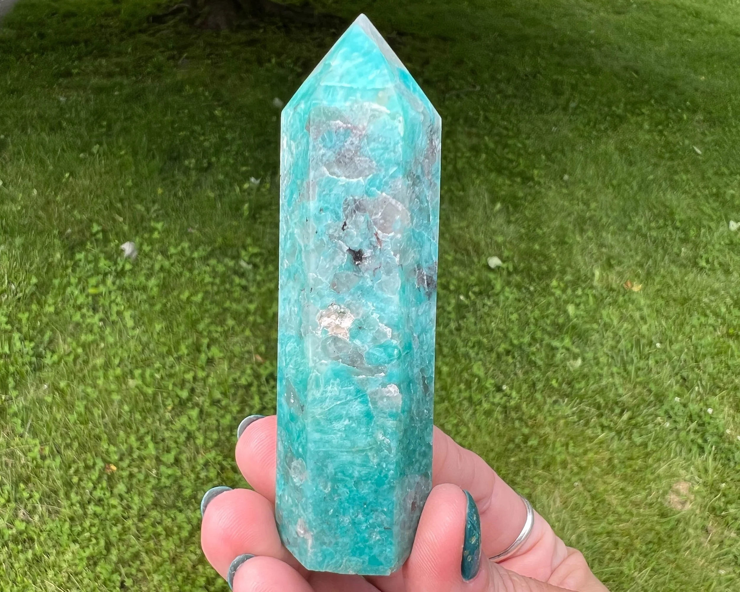 This is a beautiful self standing crystal tower of vibrant Amazonite with Smoky Quartz. It has bright blue greens Amazonite with light and dark gray translucent Smoky Quartz. There may be some other minerals in there in small amounts too. Very pretty polished, self standing crystal point. Bright and a little sparkly too.