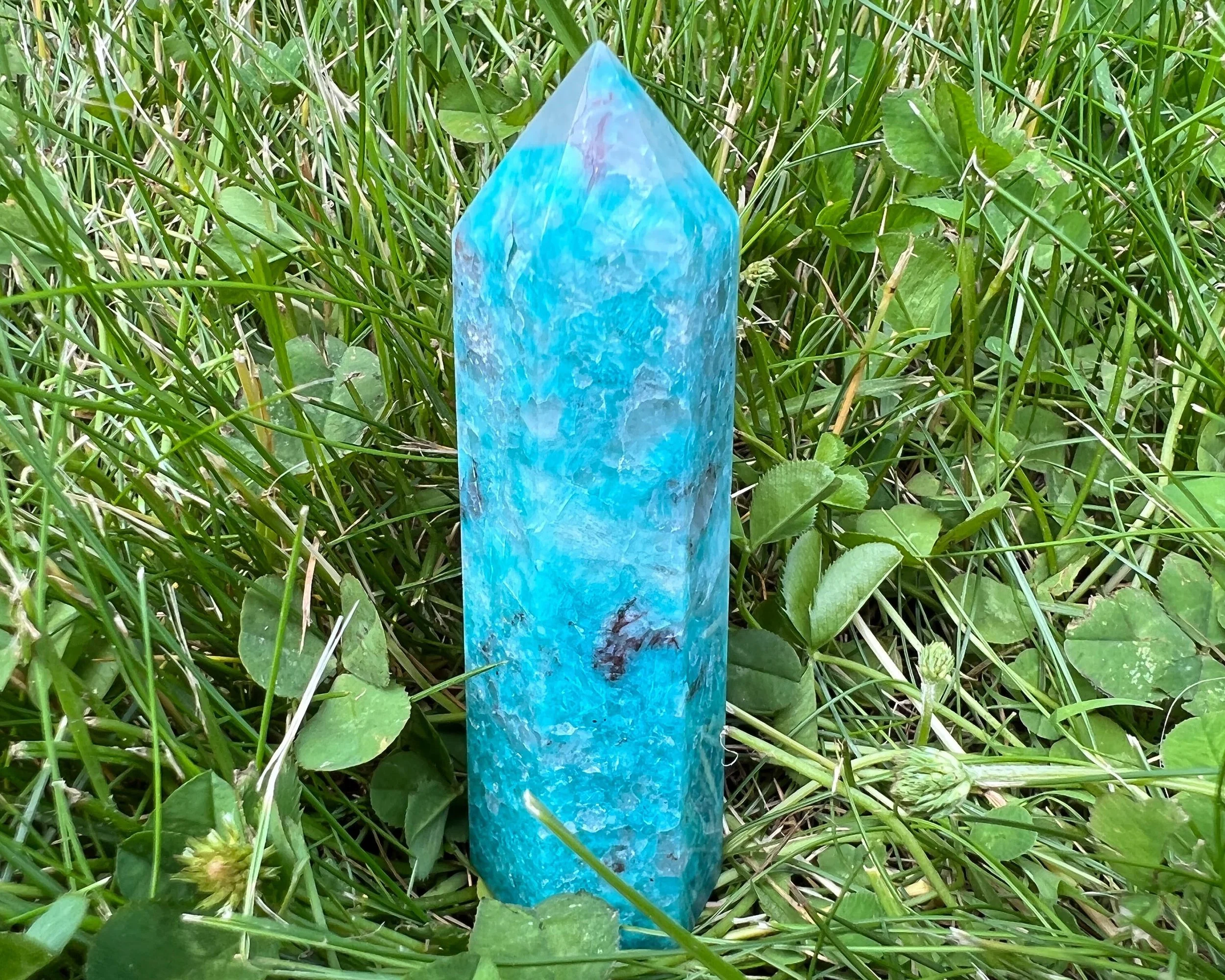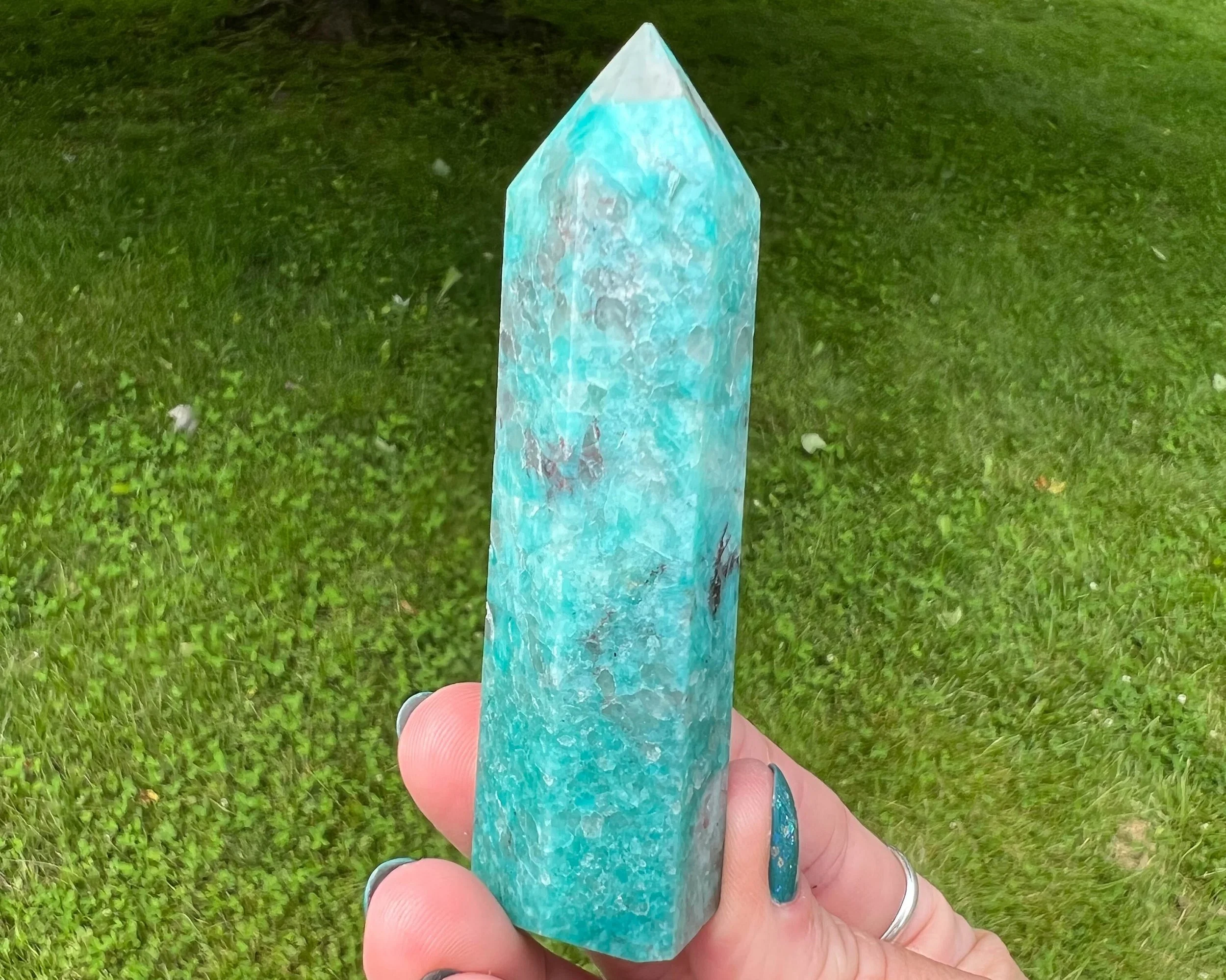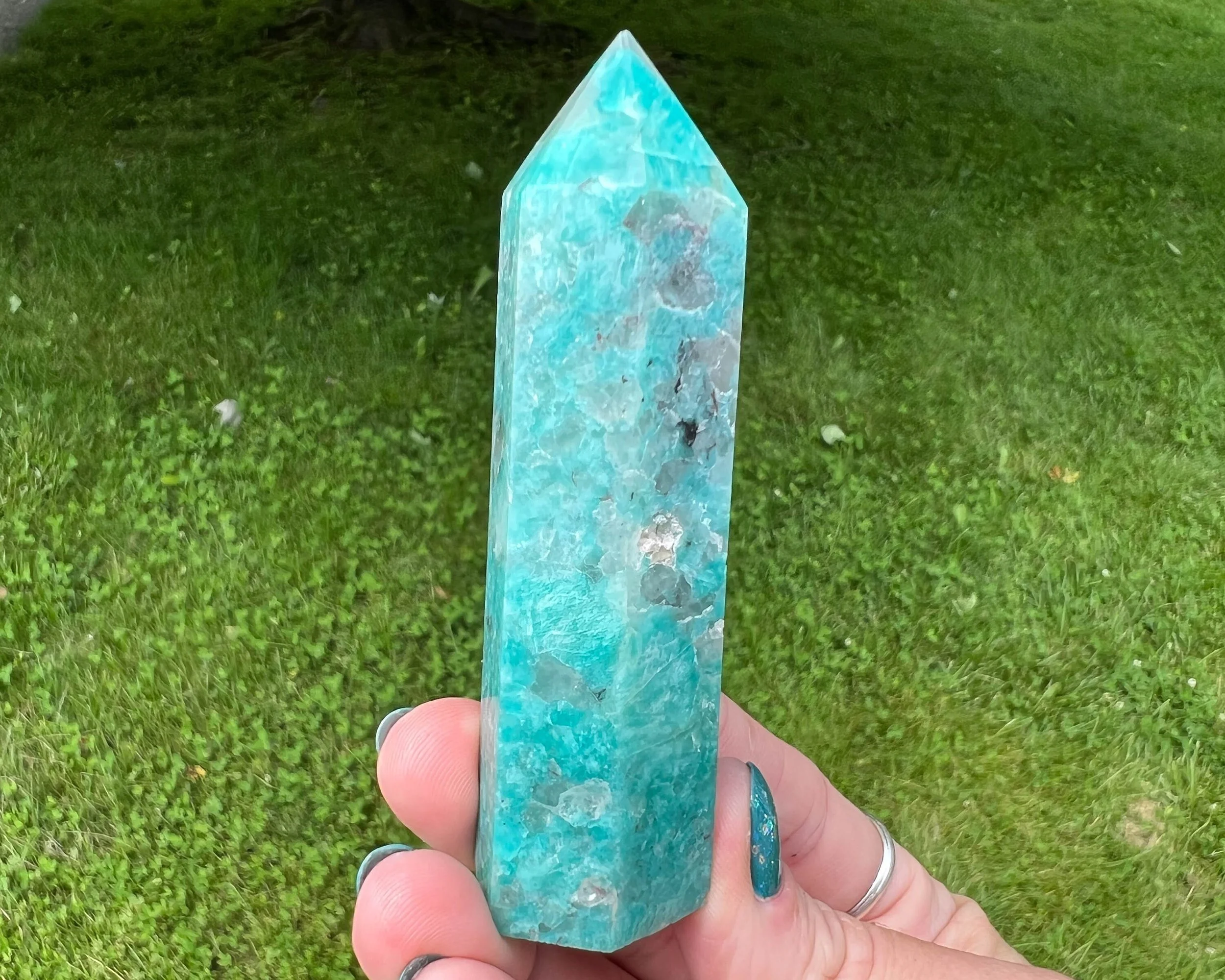 This is a beautiful self standing crystal tower of vibrant Amazonite with Smoky Quartz. It has bright blue greens Amazonite with light and dark gray translucent Smoky Quartz. There may be some other minerals in there in small amounts too. Very pretty polished, self standing crystal point. Bright and a little sparkly too.