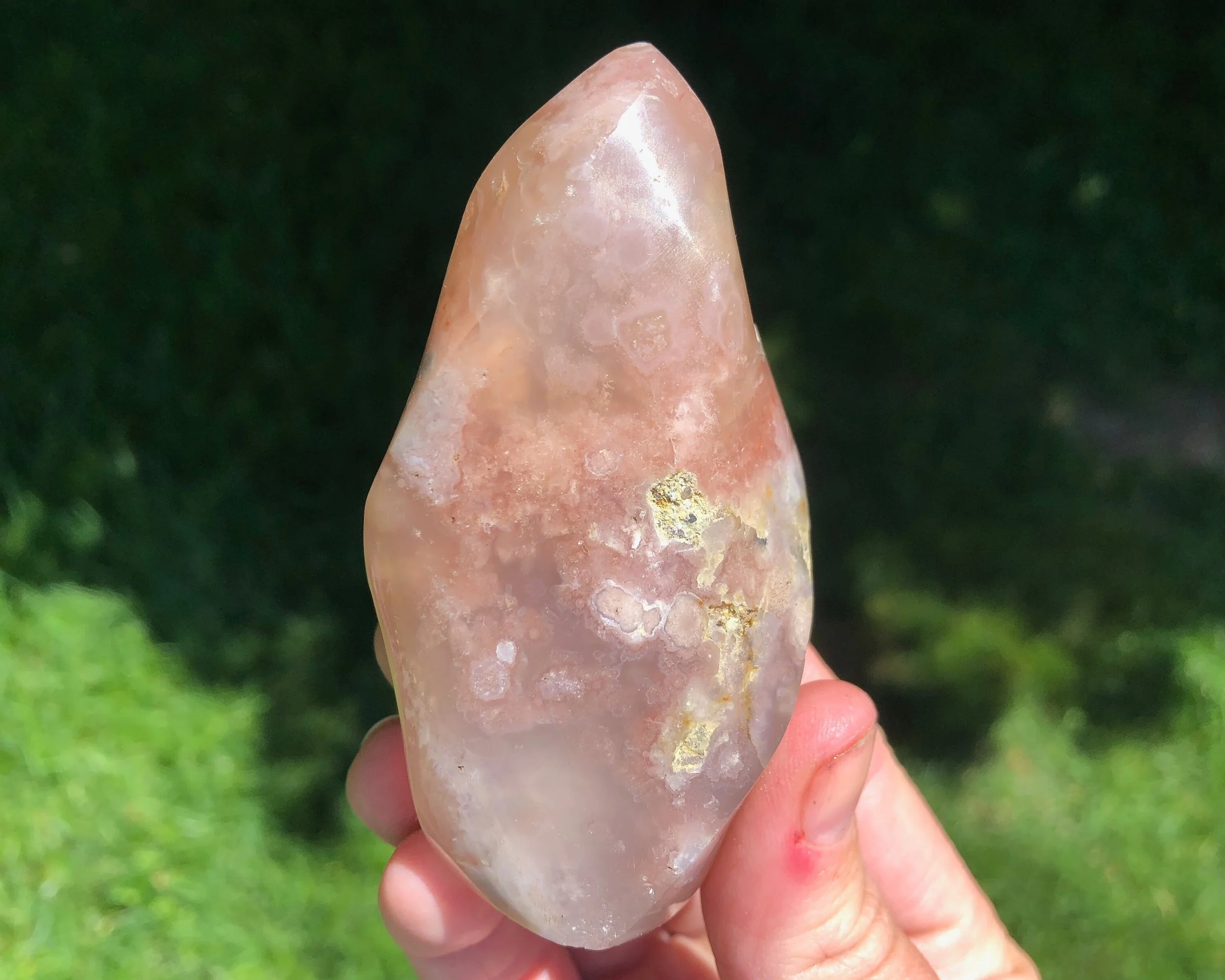 This is a lovely Flower Agate flame, with Agate 'eyes' that have a lovely flower shape around them and pretty plumes in the depths of the stone. It has nice coloring of light pink 'flowers' with a deep pink and gray background. There is some banding too, a very pretty overall piece :) <3