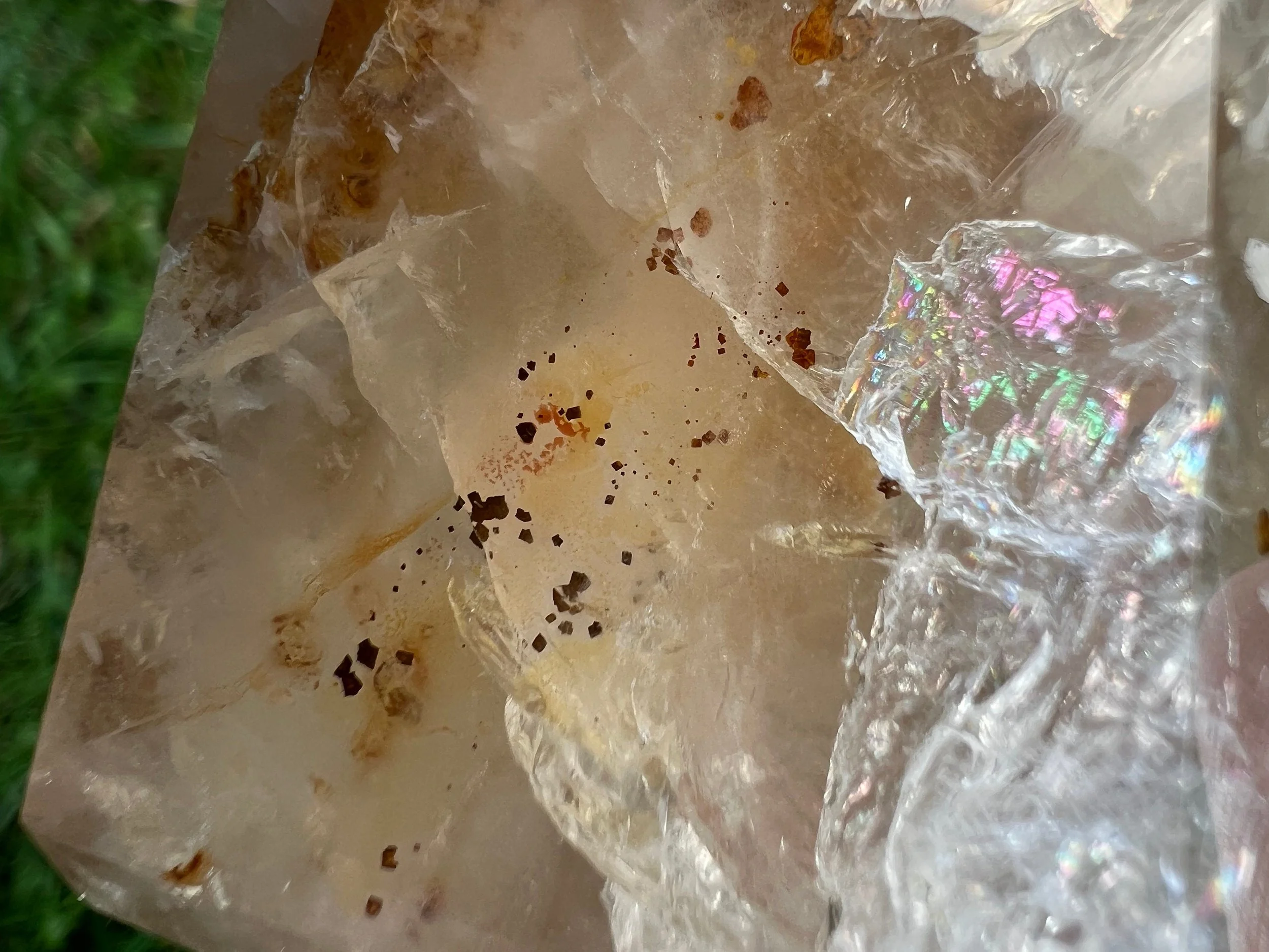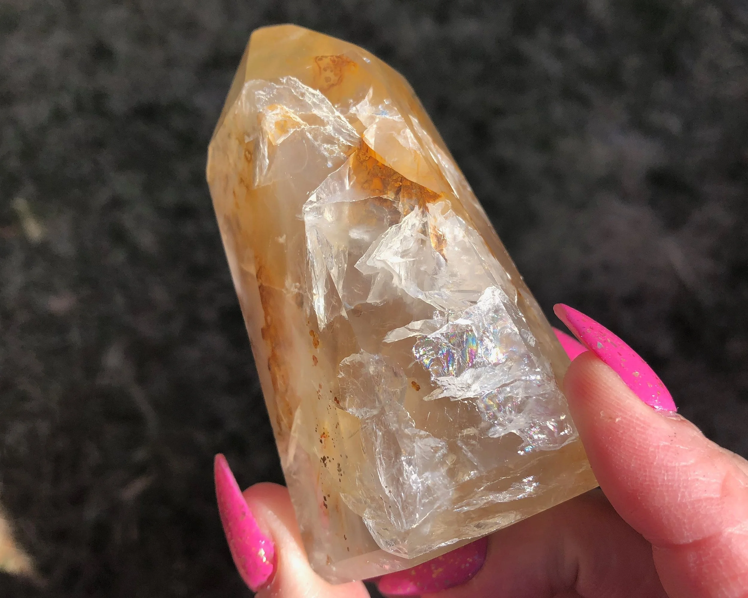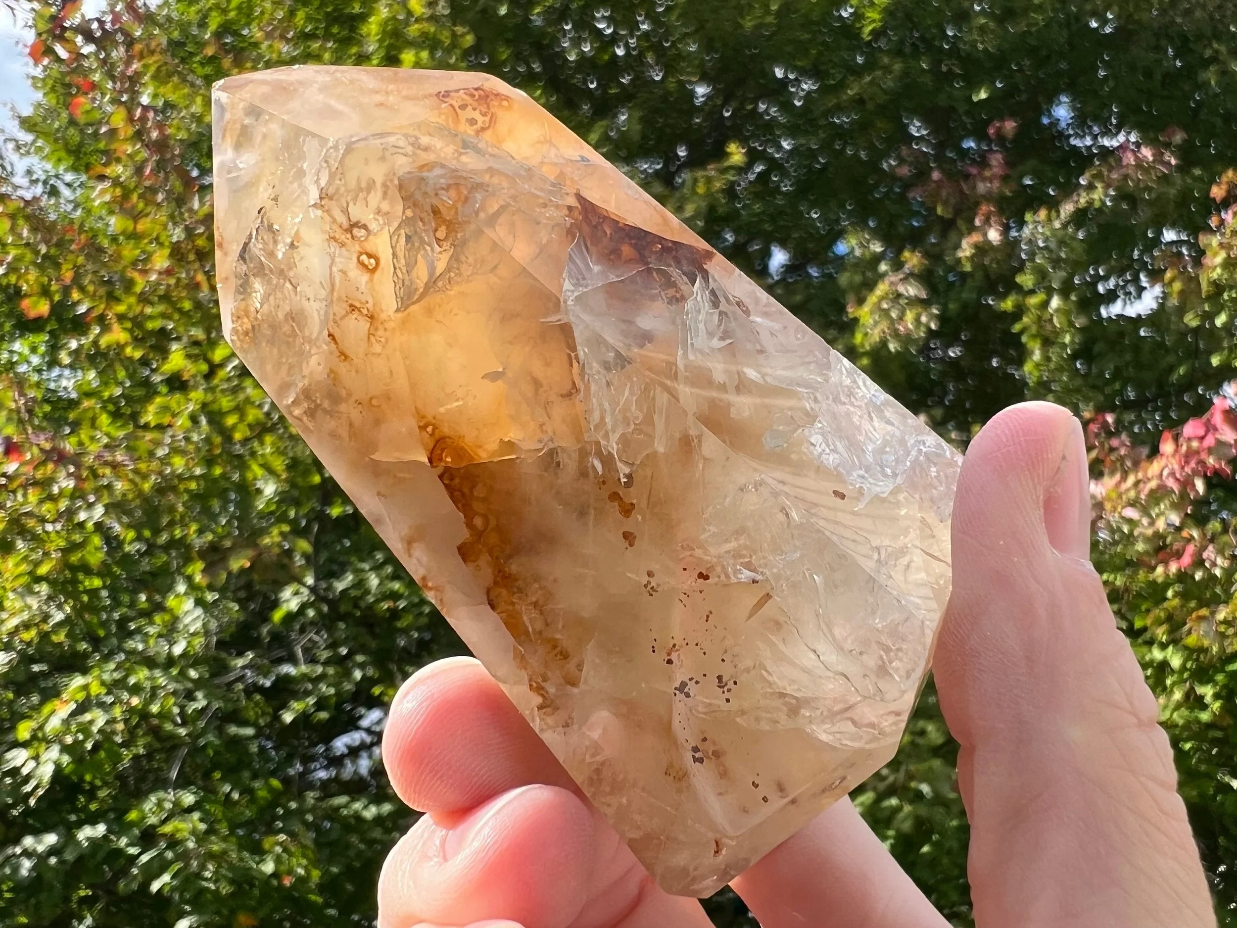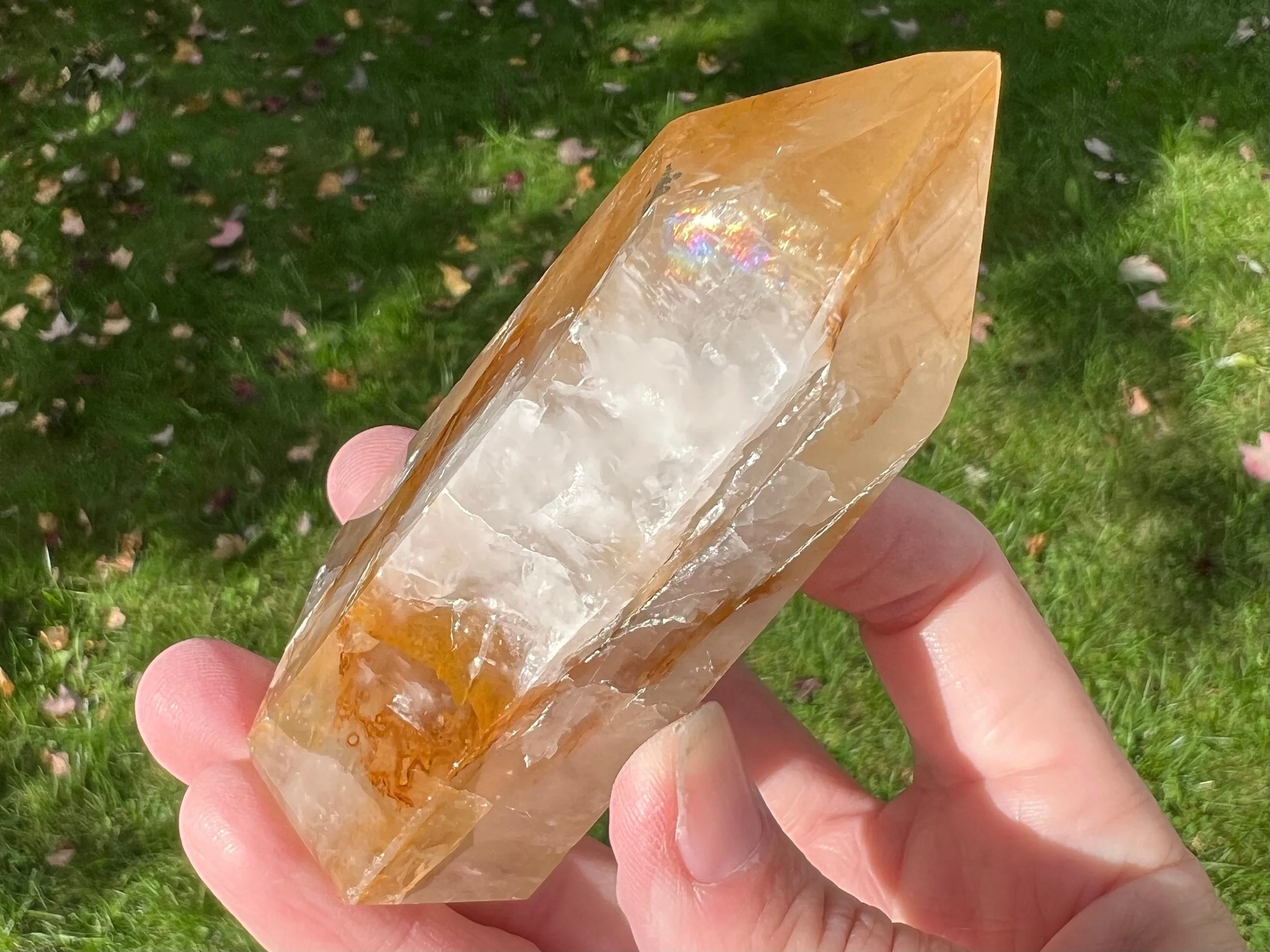 This is a beautiful polished Quartz point with Hematite inclusions that give it glowing, golden yellow, red and orange colors. It is completely polished to a nice gloss all the way around and in the sunlight this babe is just GORGEOUS.