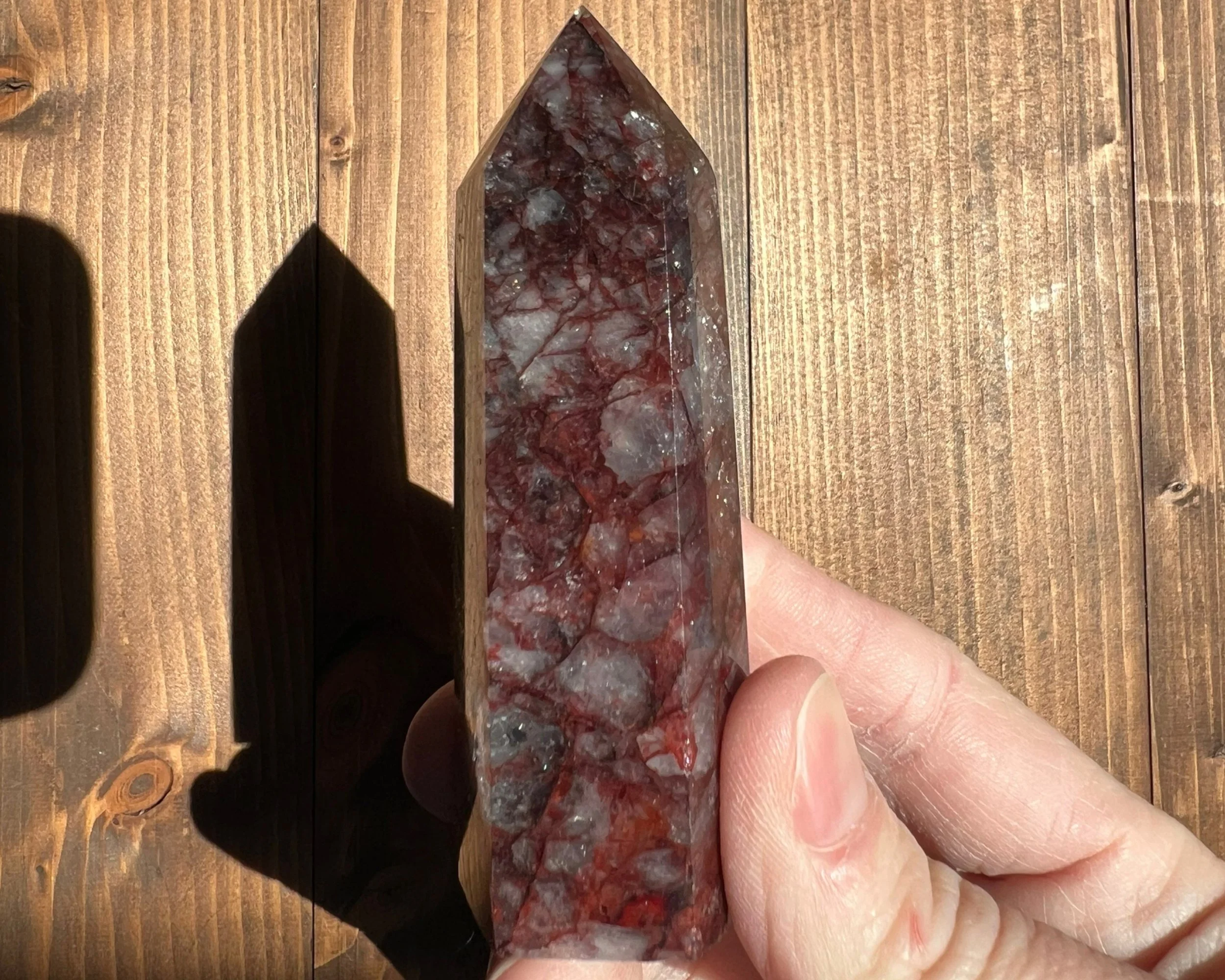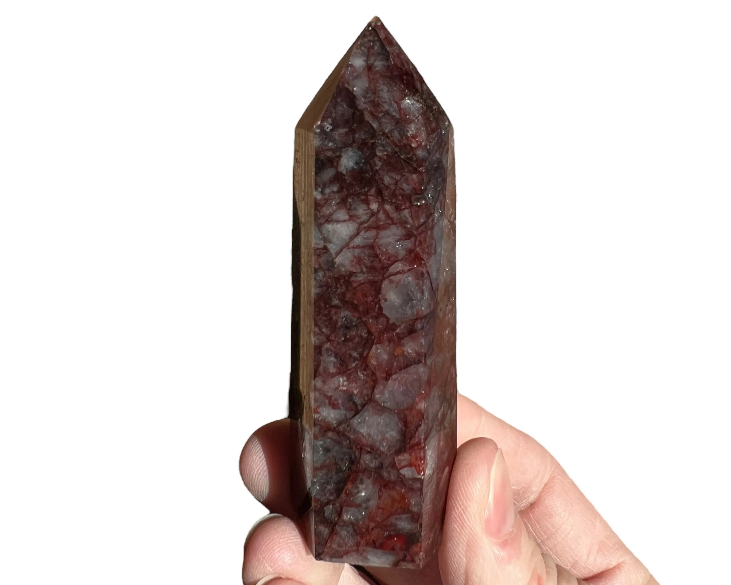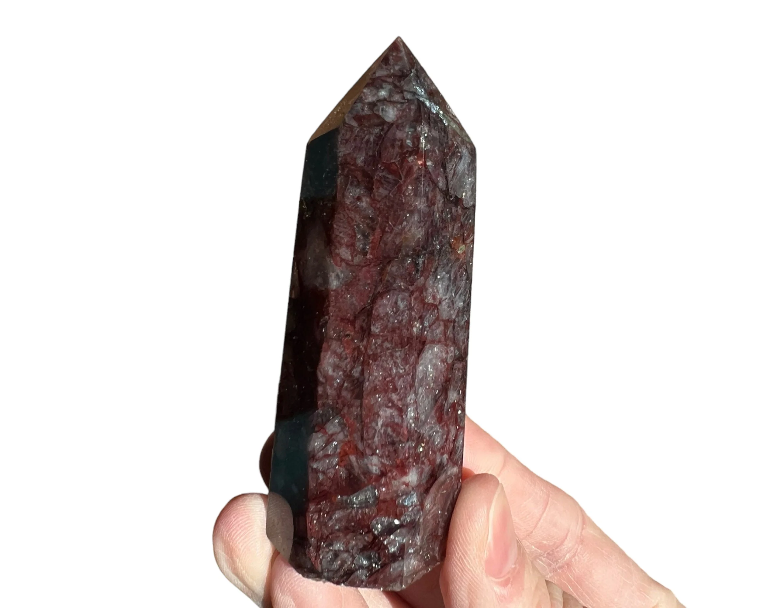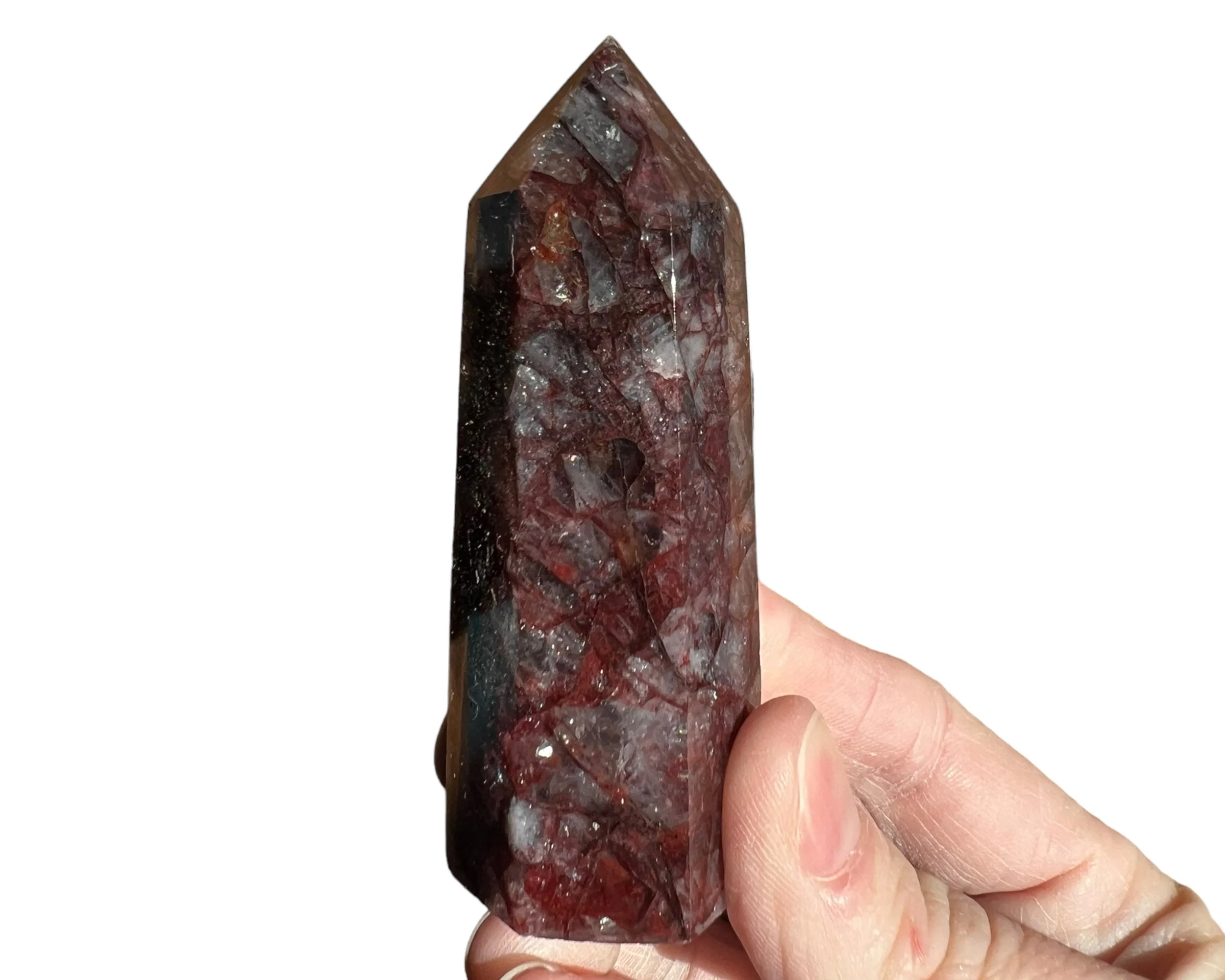 This is a beautiful dark red Hematoid Quartz tower, also called Fire Quartz. Dark and bright red Hematite in Quartz cut and polished into a self standing point. The clear to white parts of the translucent Quartz almost have a glow to them in sunlight. It is also full of little rainbows :)