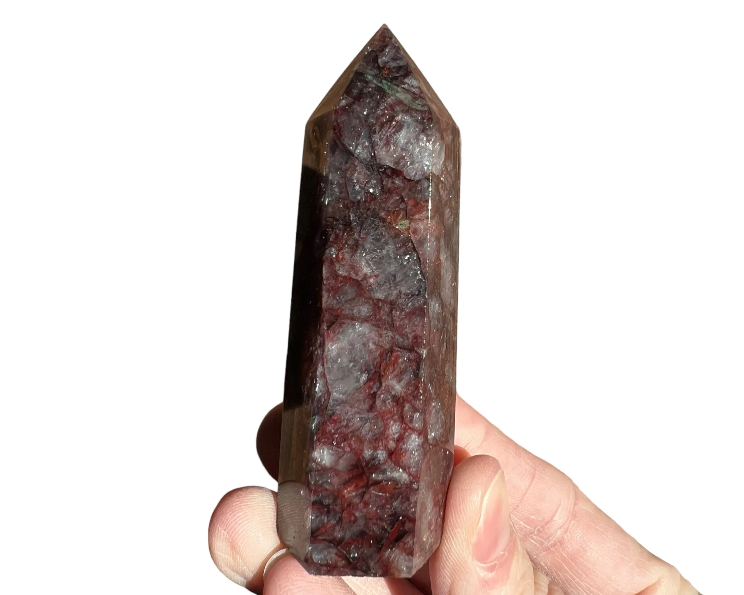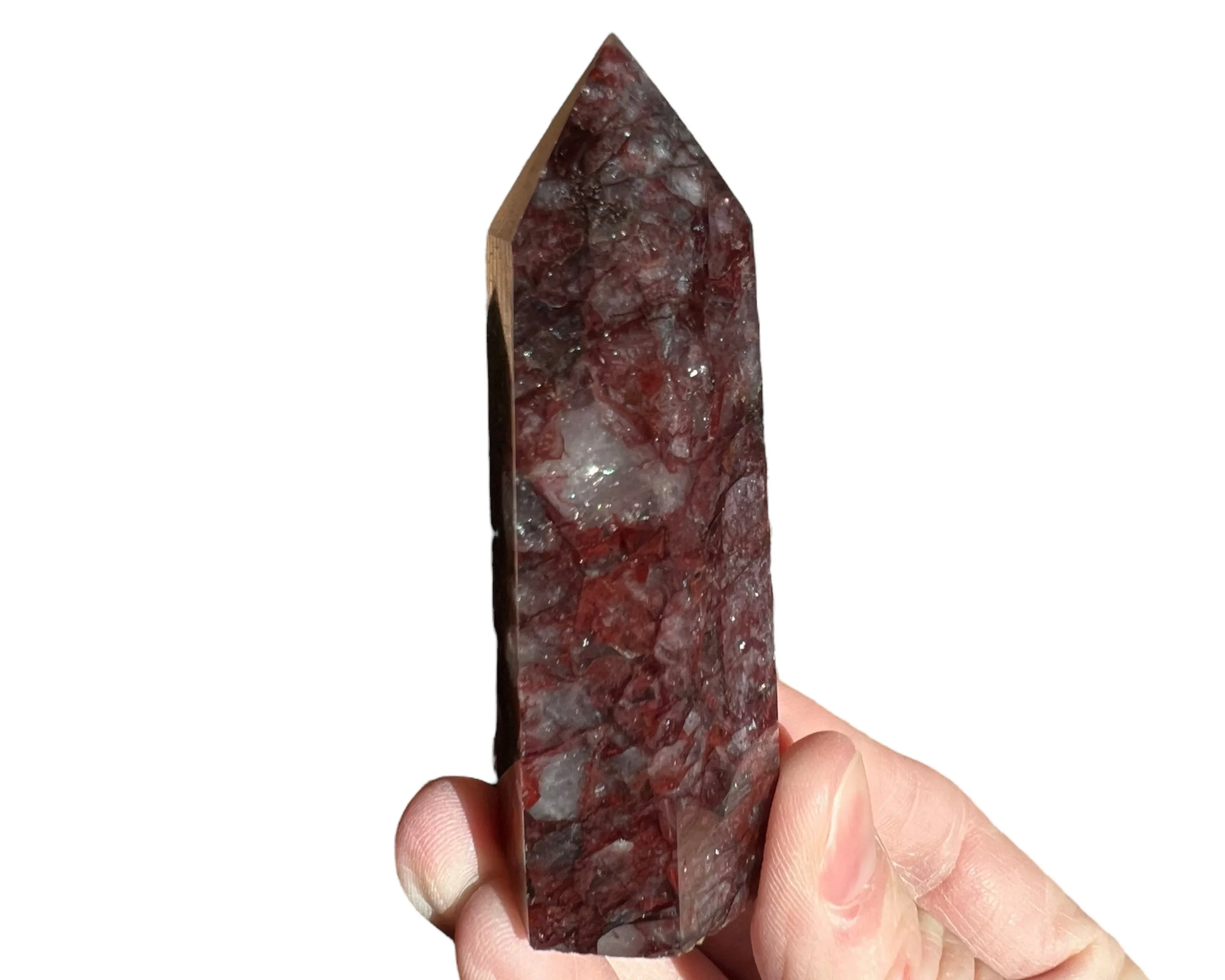 This is a beautiful dark red Hematoid Quartz tower, also called Fire Quartz. Dark and bright red Hematite in Quartz cut and polished into a self standing point. The clear to white parts of the translucent Quartz almost have a glow to them in sunlight. It is also full of little rainbows :)