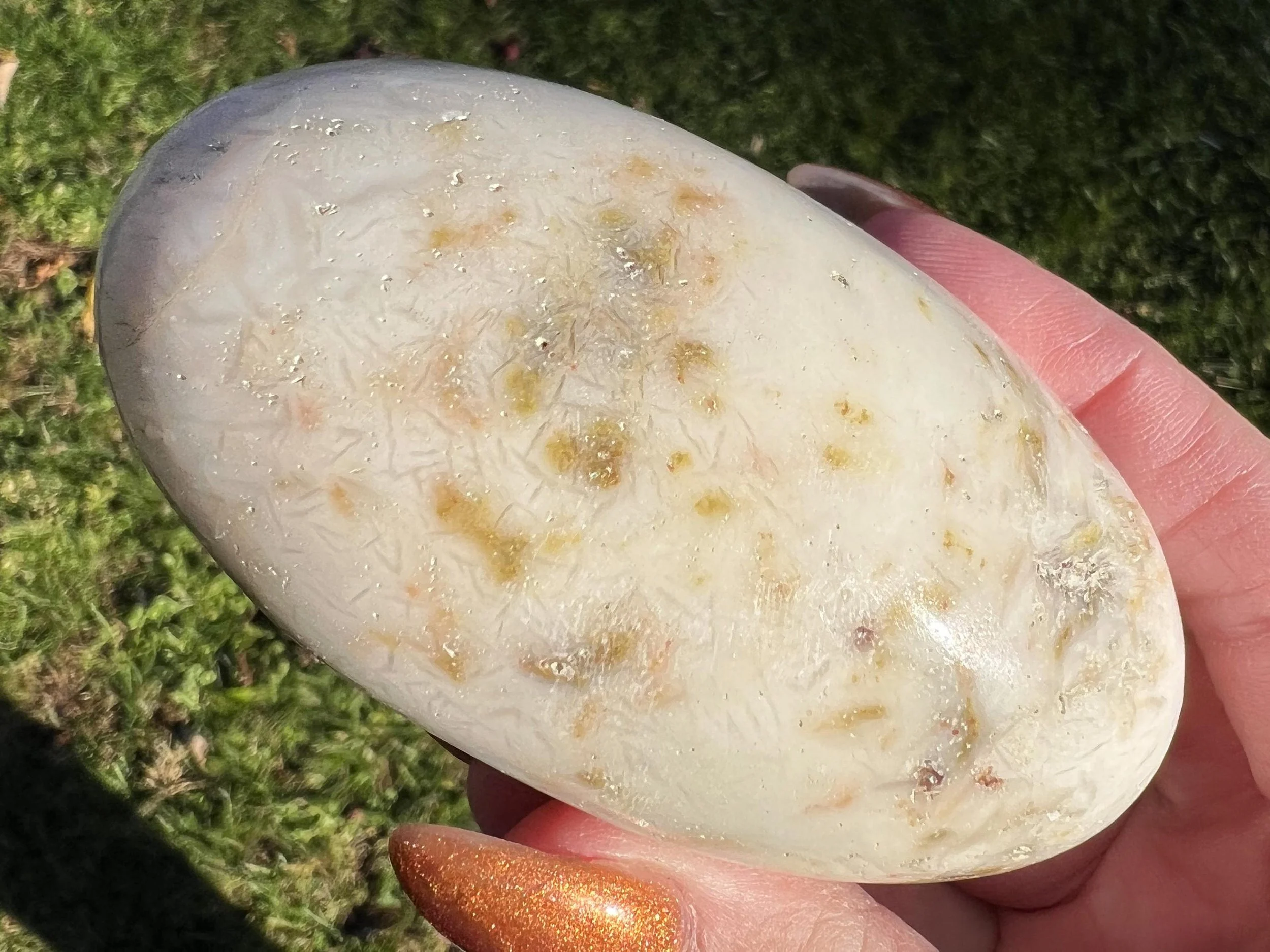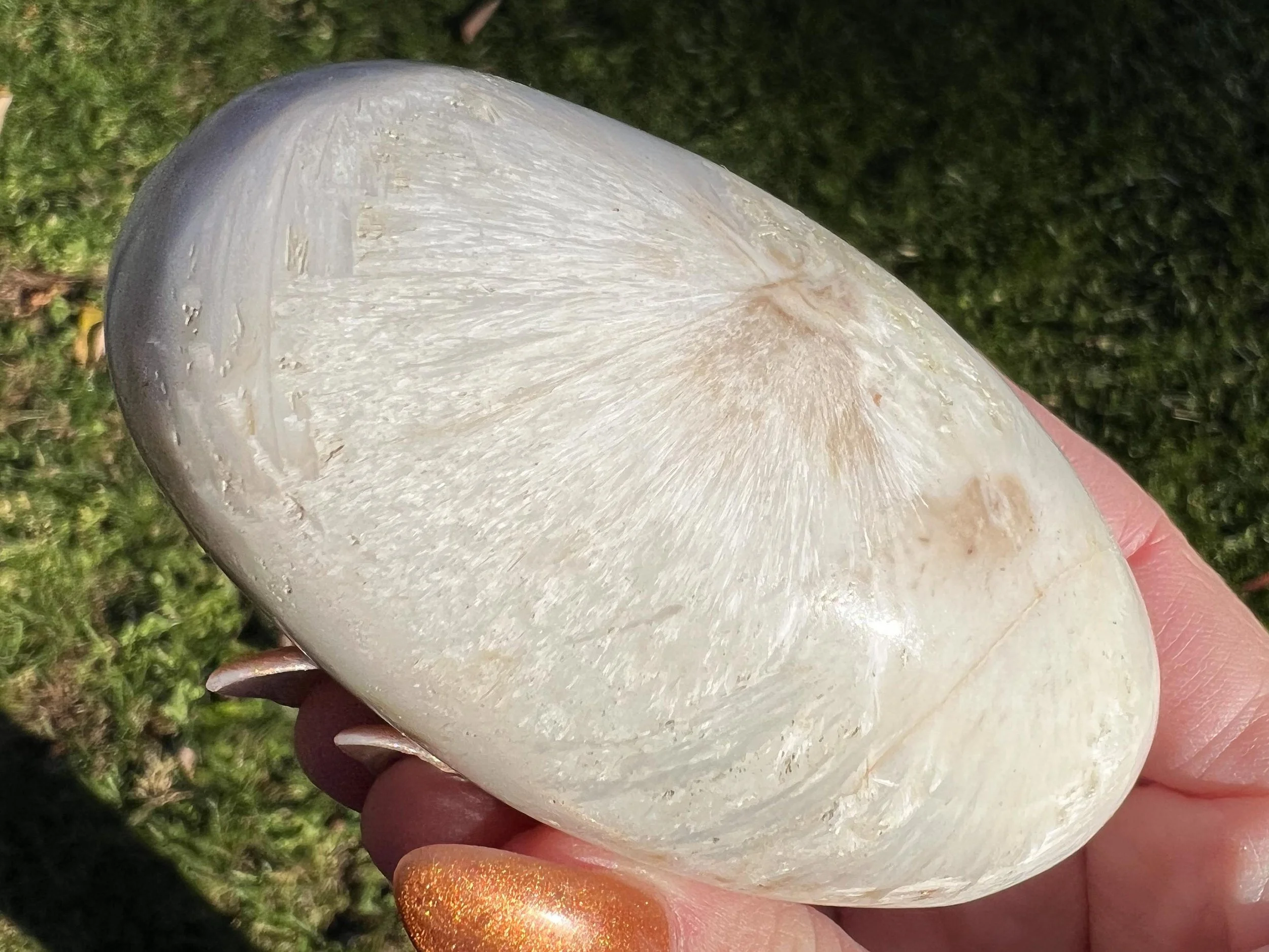 This is a gorgeous Shiva Lingam carved from chatoyant Scolecite. It has a beautiful sheen that moves along the lines as they meet in one spot and radiate outward, creating a funky and beautiful pattern. A really wonderful and pretty Shiva from India <3