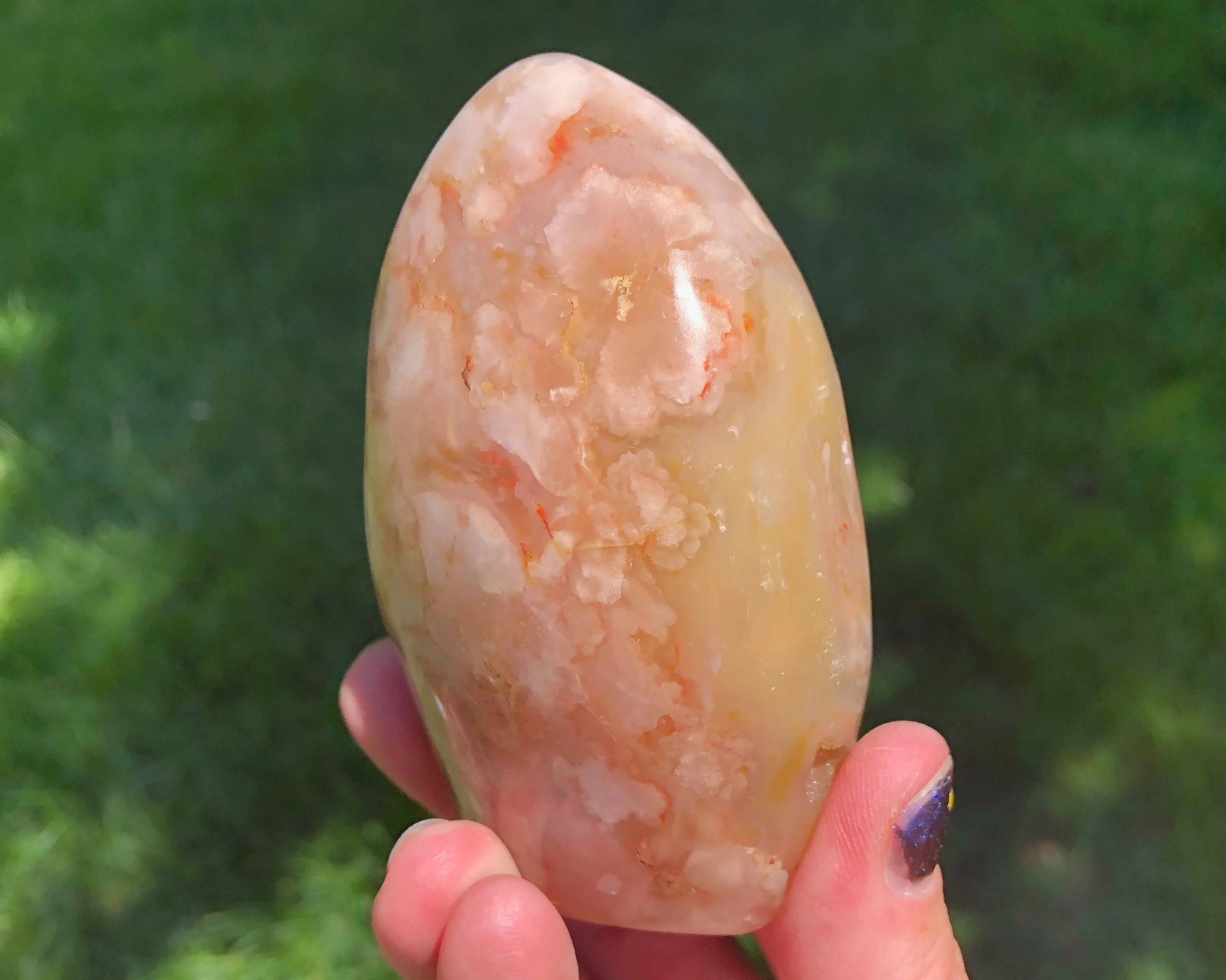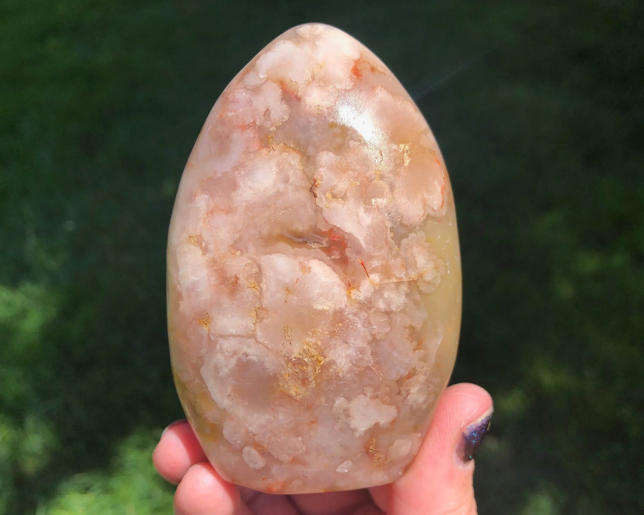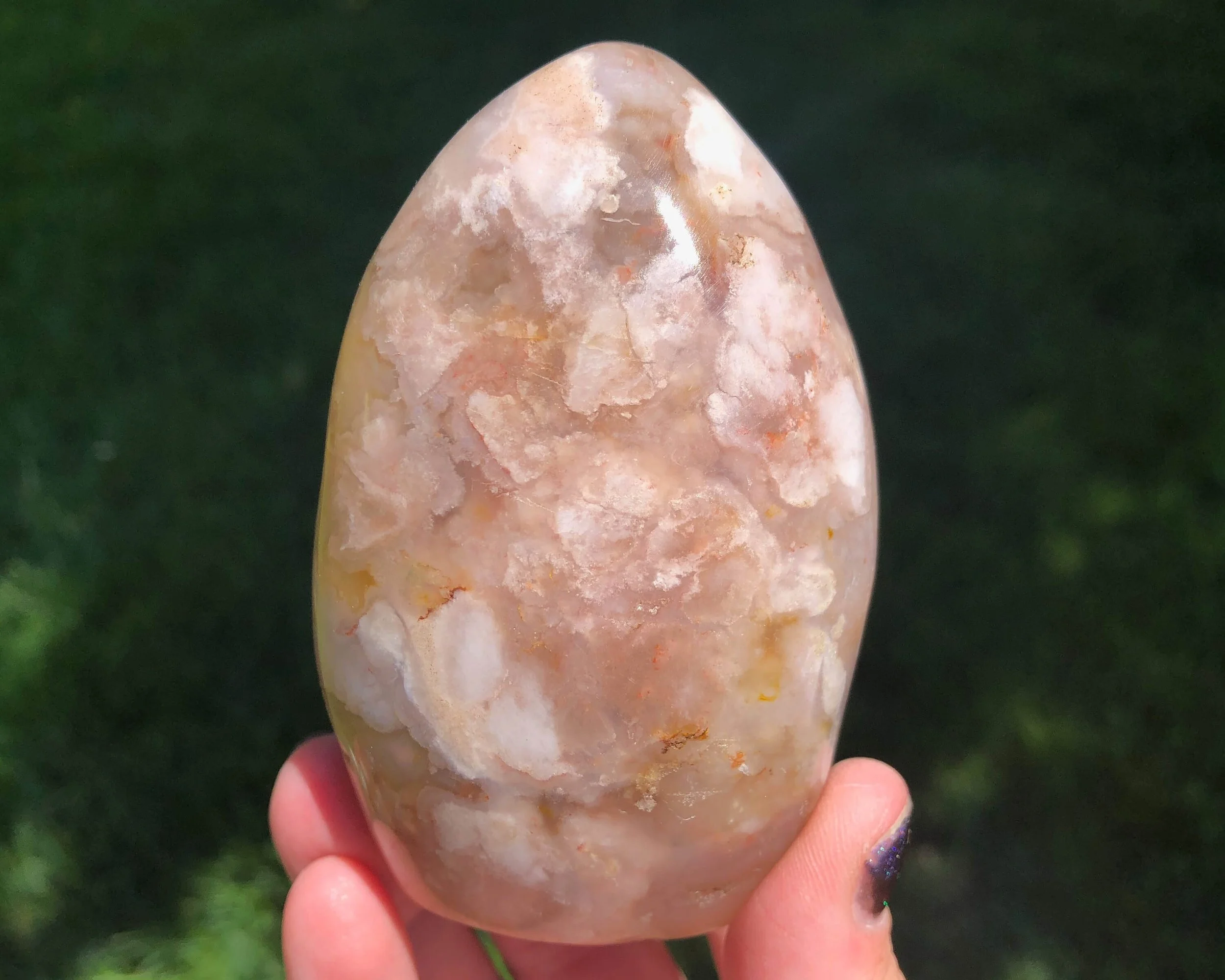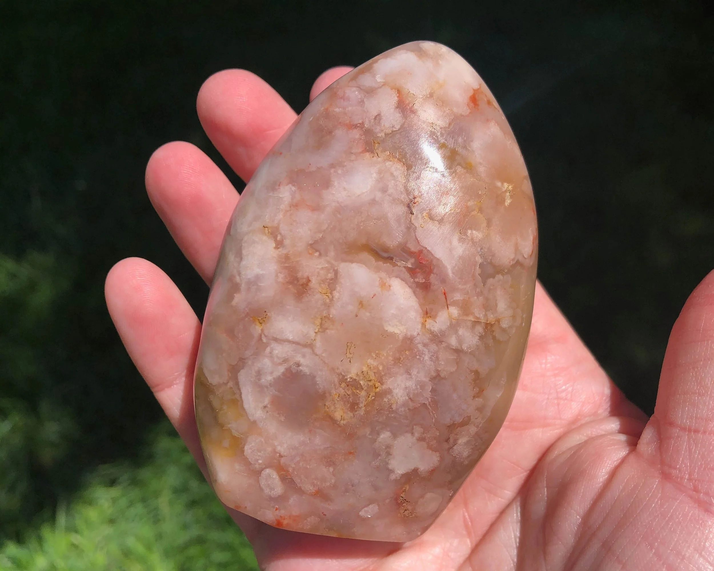 This is a lovely Flower Agate display piece, with Agate 'eyes' that have a lovely flower shape around them and pretty plumes in the depths of the stone. It has nice coloring of light pink 'flowers' with a deep pink and gray background. There is some banding too, a very pretty overall piece :) <3