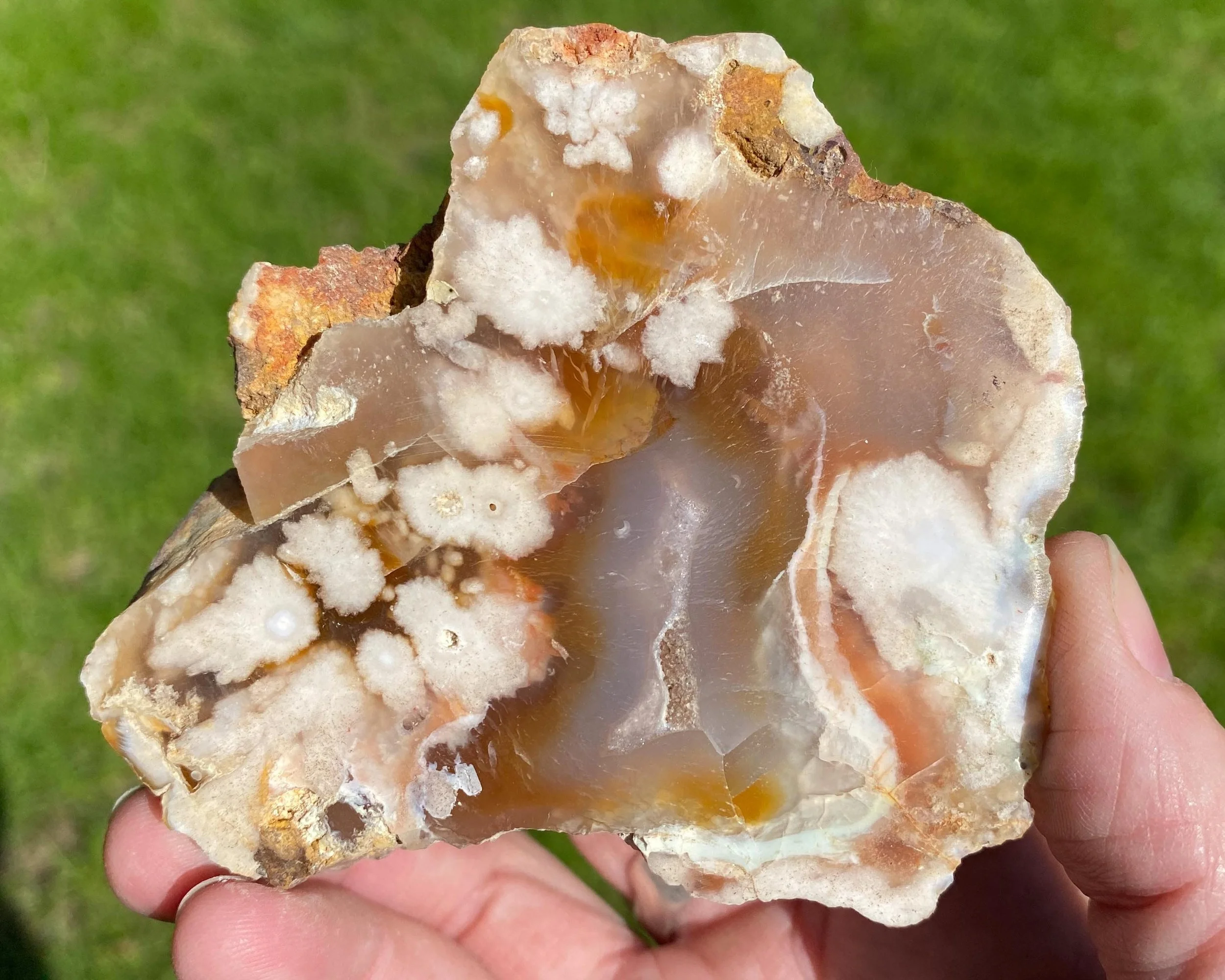 This is a lovely Flower Agate display piece, with lovely flower shapes and pretty plumes in the depths of the stone. It has nice coloring of light pink 'flowers' with a deep pink and gray background. There is some banding. It is polished on top and rough on the back. :) <3