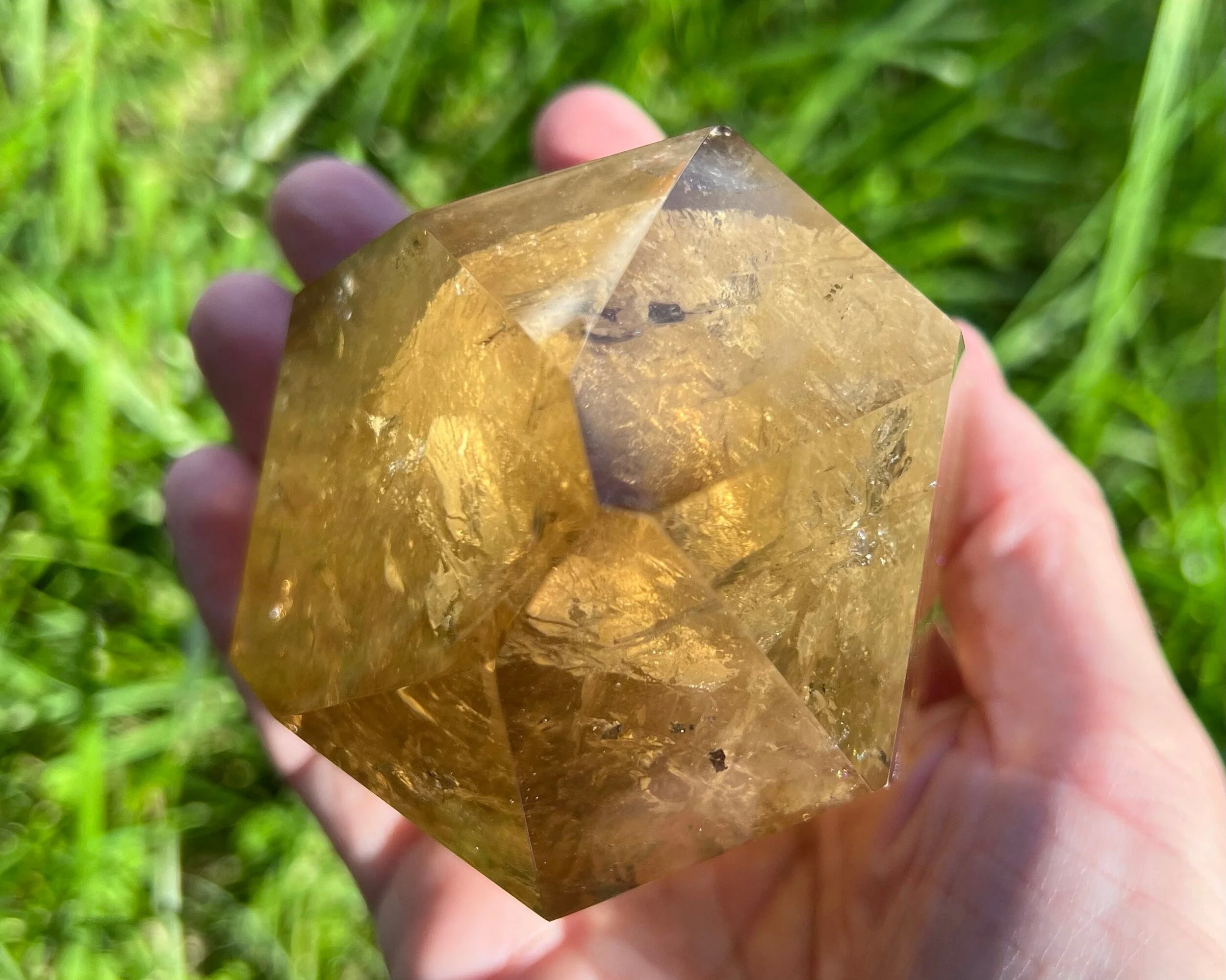 This is a natural Smoky Citrine crystal with a nice deep honeys yellow coloring and some nice vibrant rainbows all over - there are way more and they're way better than the photos show. It is cut and polished, self standing and glows in the sunlight with a deep warmth.