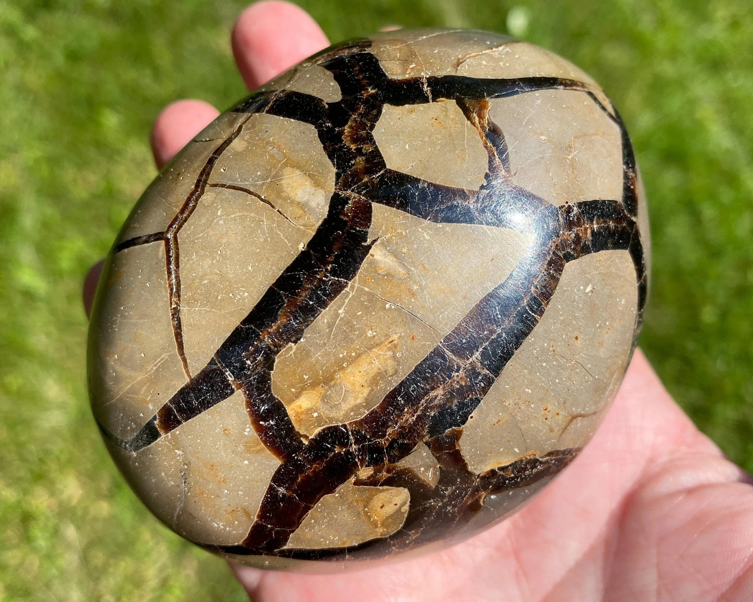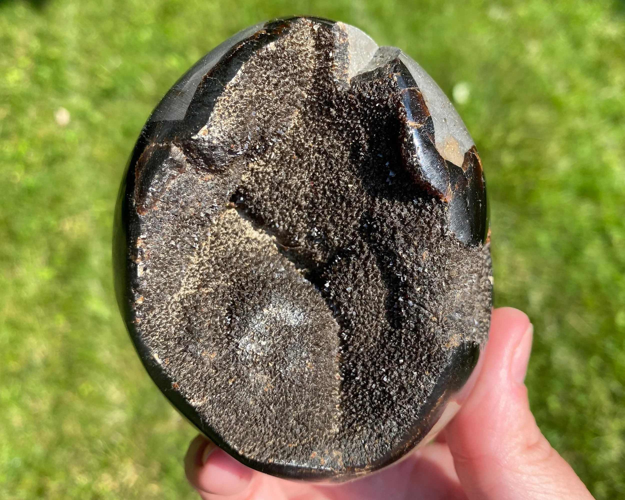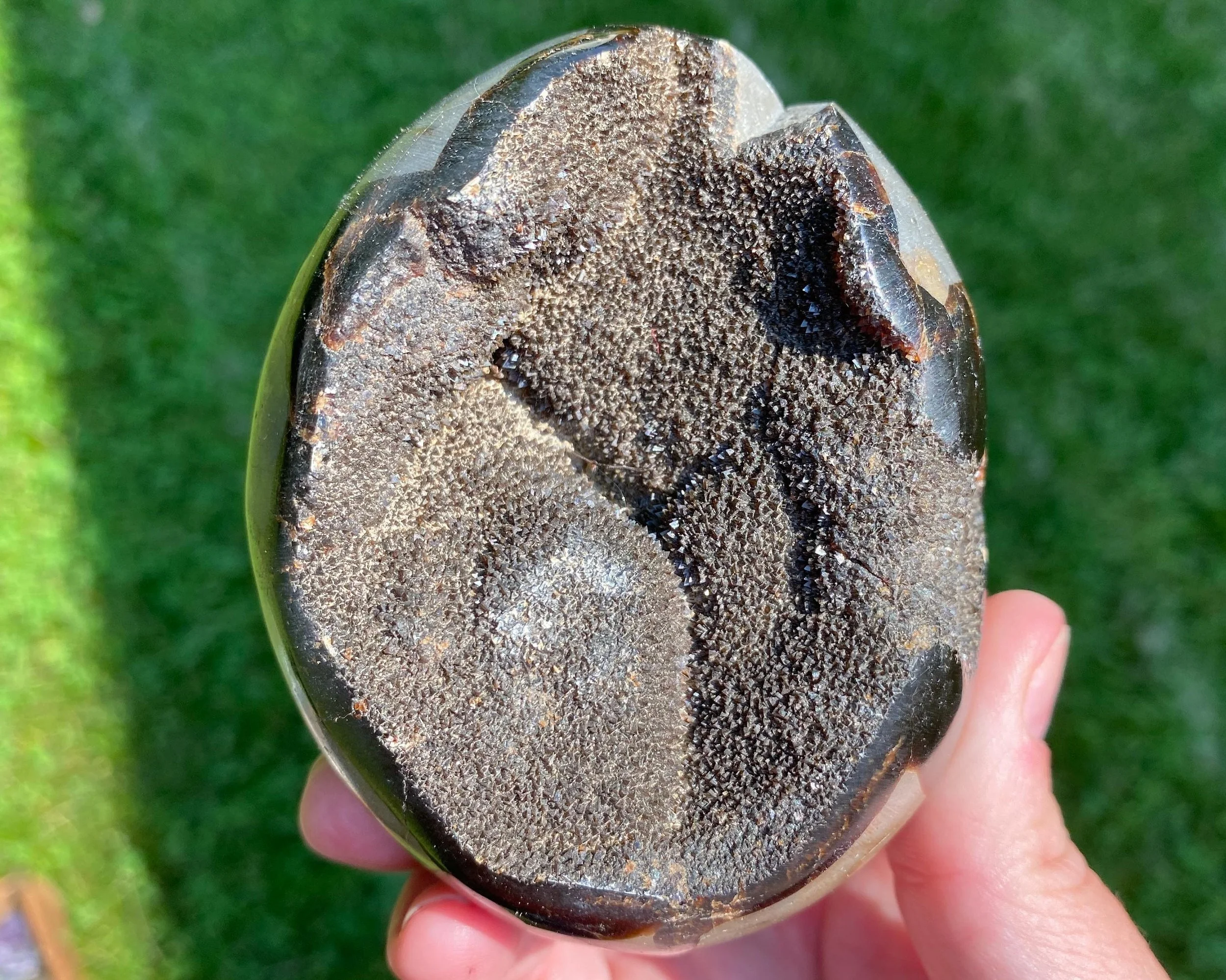 This is a beautiful egg made of natural Septarian Stone with the inside coated in sparkling druzy crystals :) This one is a little more oval than egg shaped but it sits nicely flat on its backside. Great for displaying!