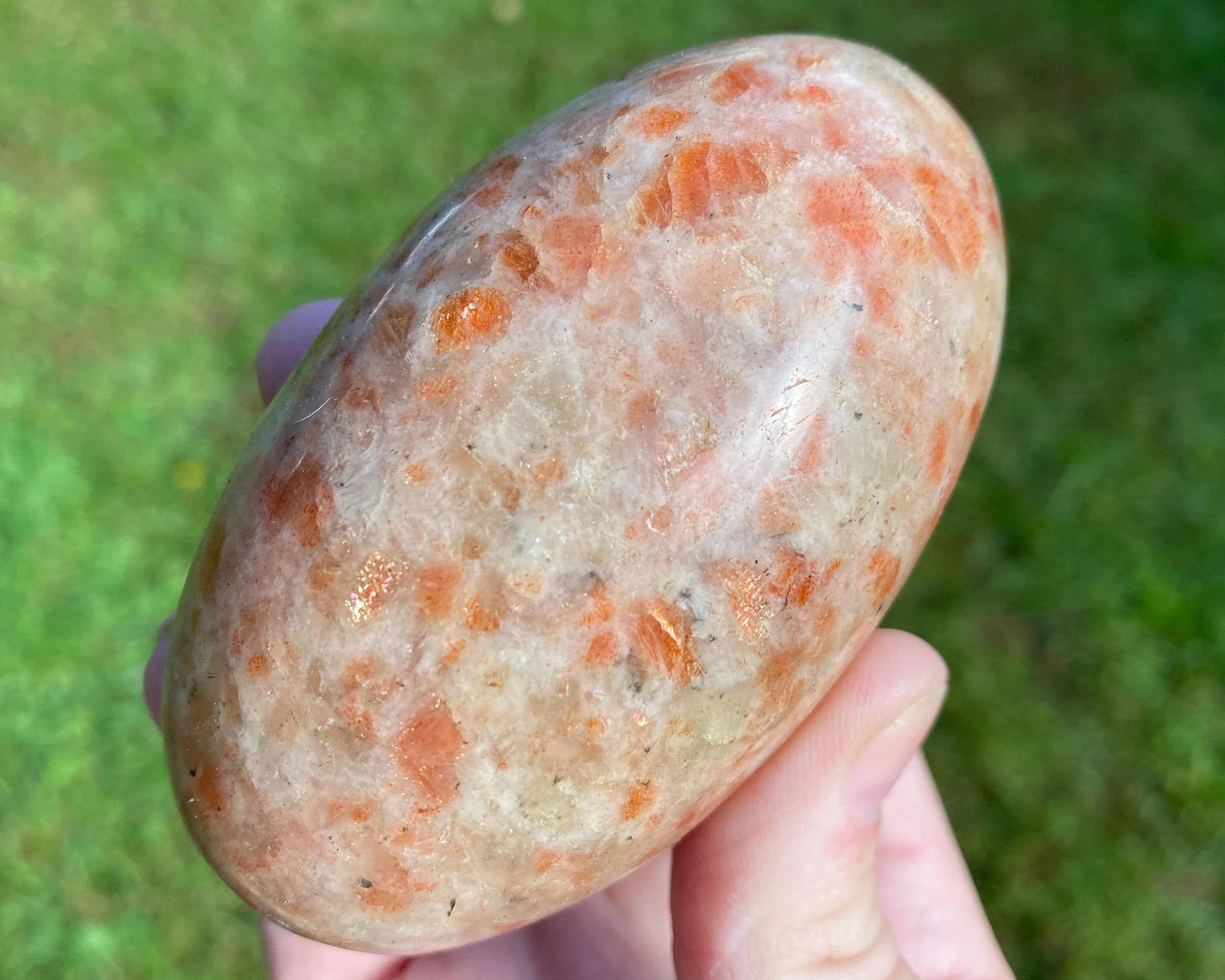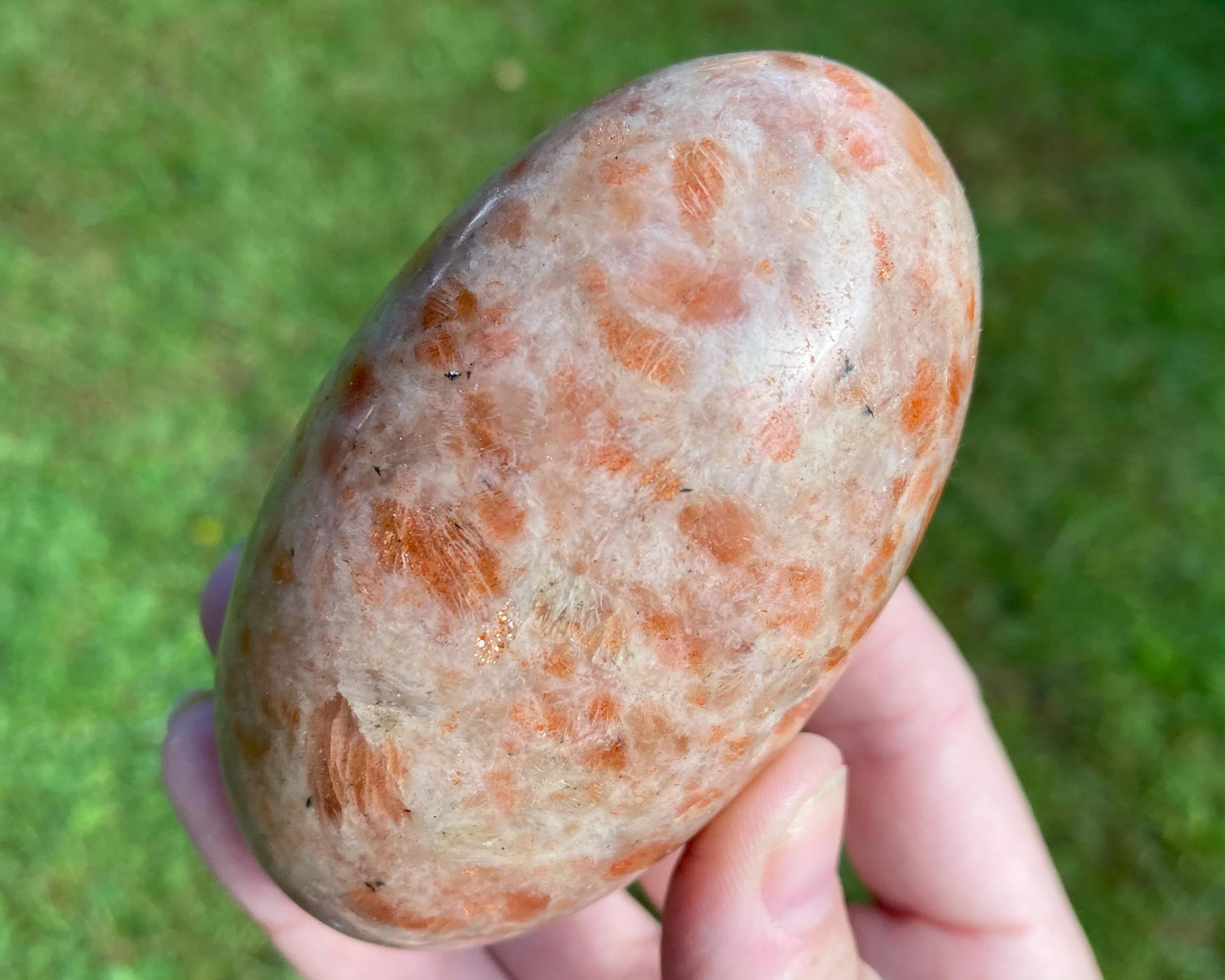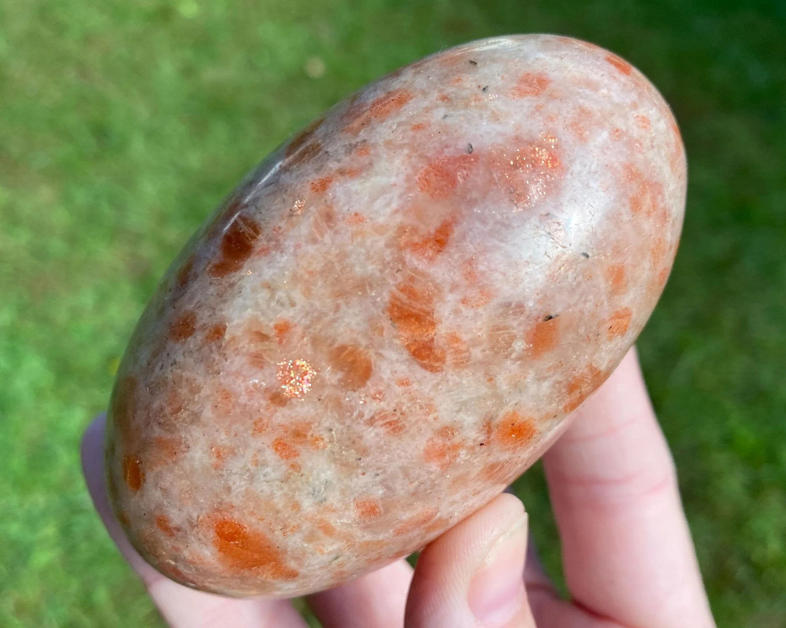This Sunstone has chatoyant, sparkly "confetti" that glitter when light hits them. It is very pretty and fun and makes a great pocket friend :) It is carved and polished into the Shiva Lingham shape. This one is very sparkly, great quality!