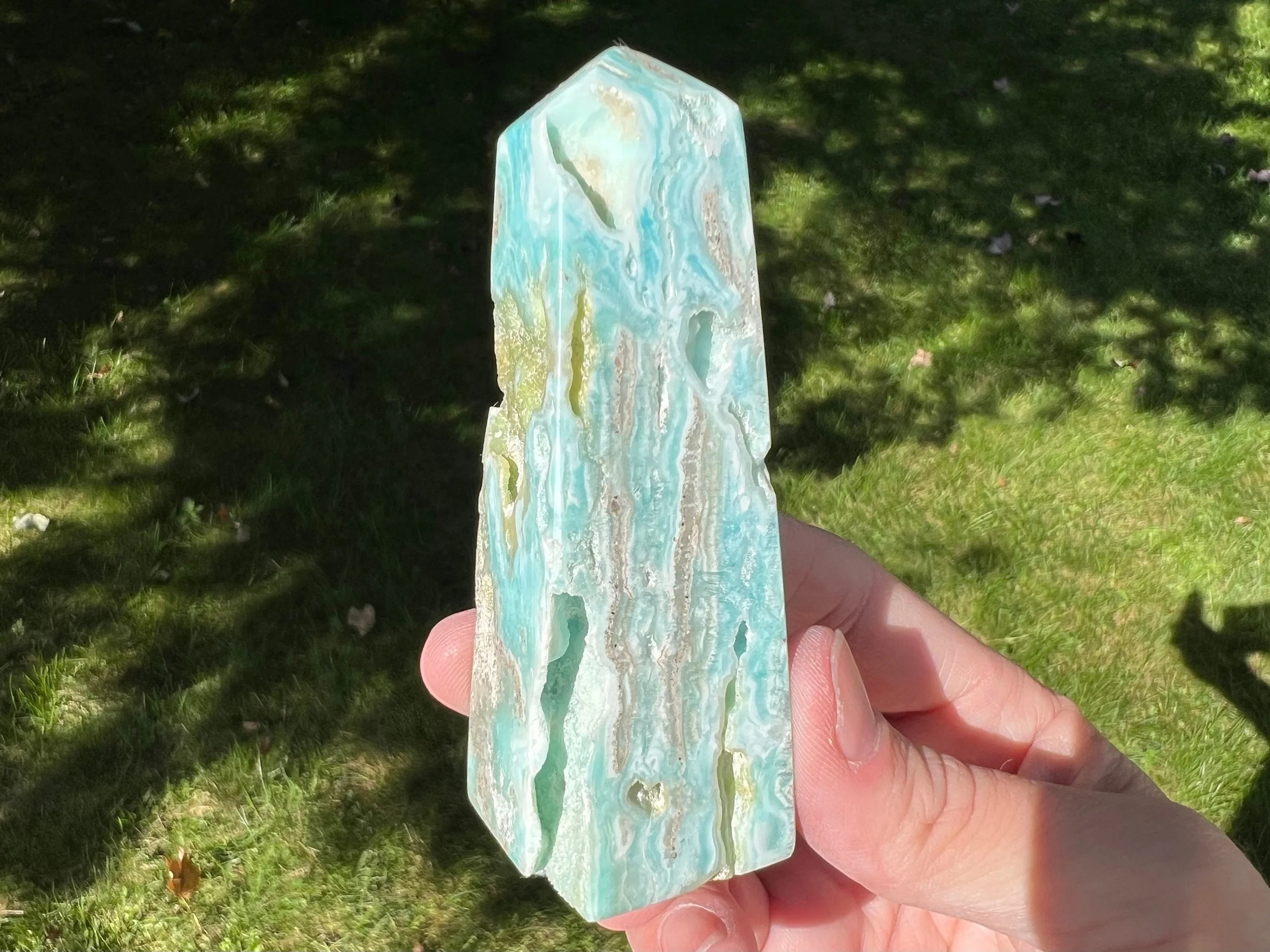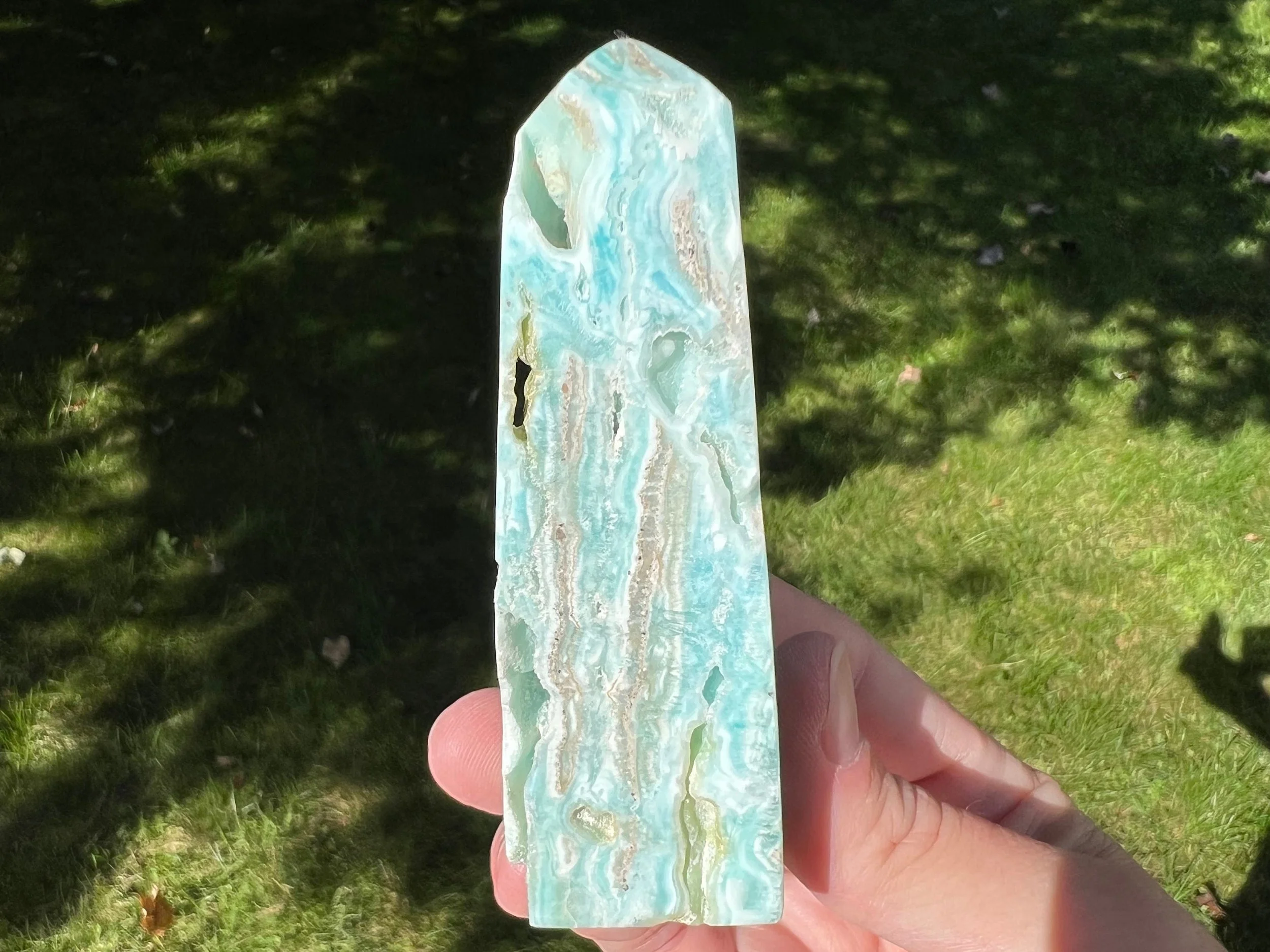 3.6" Blue Aragonite Crystal Tower #10 Polished Point, Aqua Blue Banded Calcite, Home Decor, Caribbean Gemstone Gift, Sea Beach House Accent