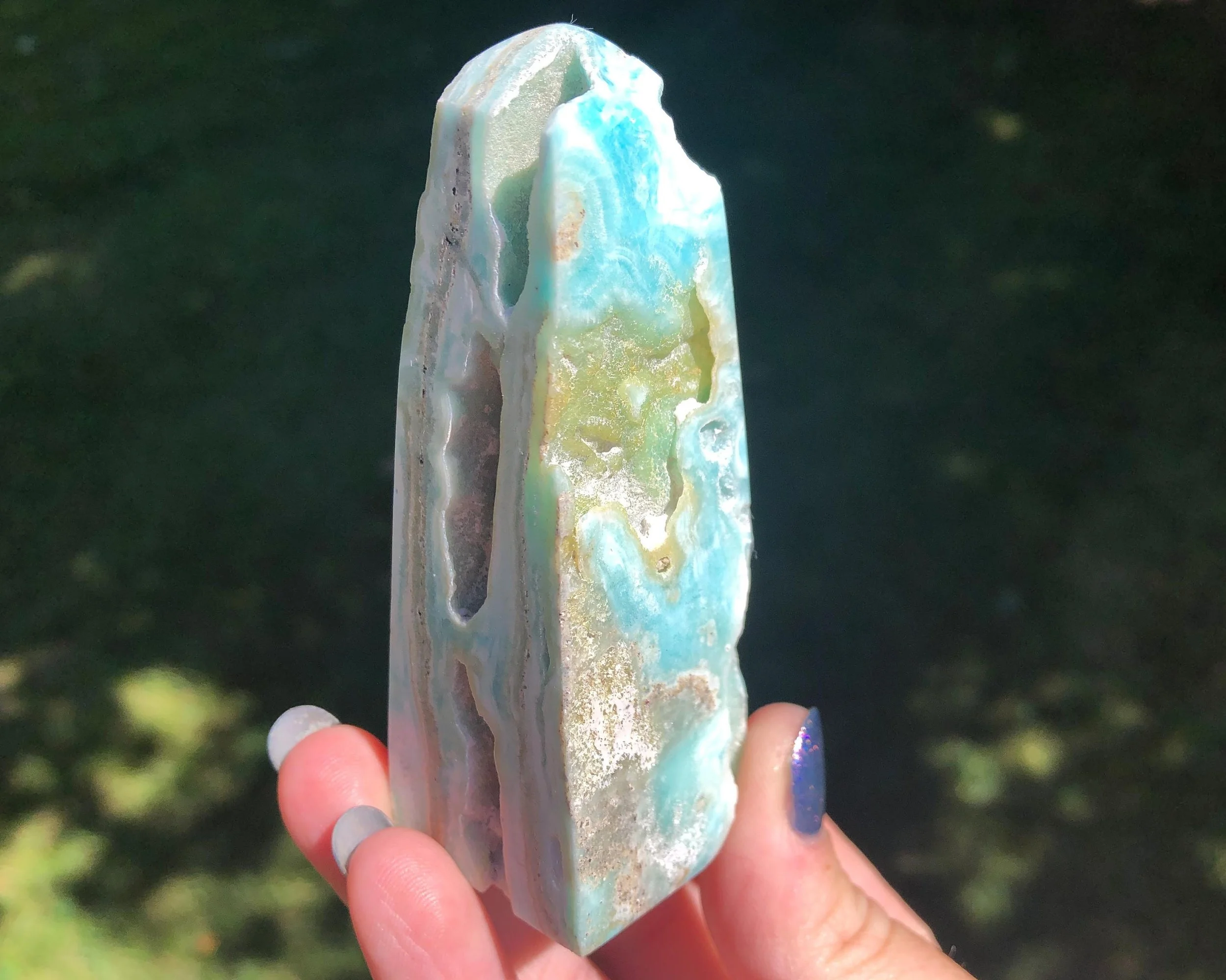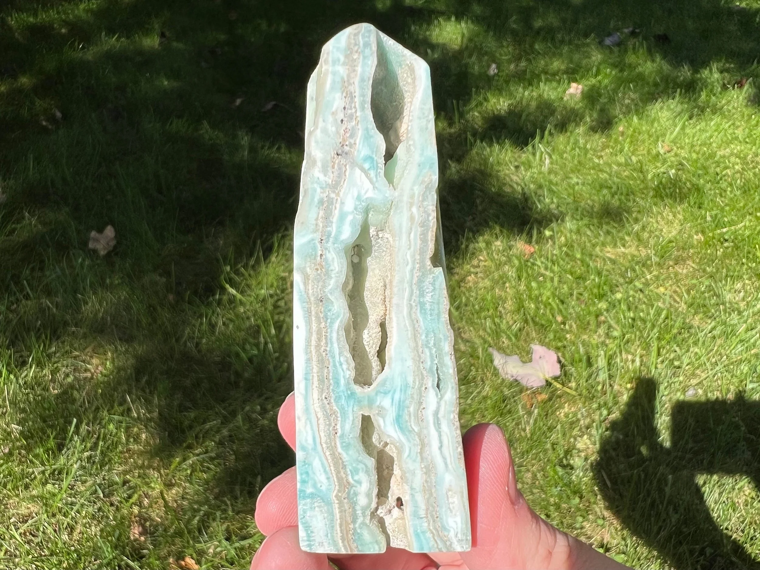 This is a crystal tower carved from beautiful blue Aragonite. It is banded in pretty patterns and has druzy pockets too. It is a cut and polished point made from natural stone. It is self standing.