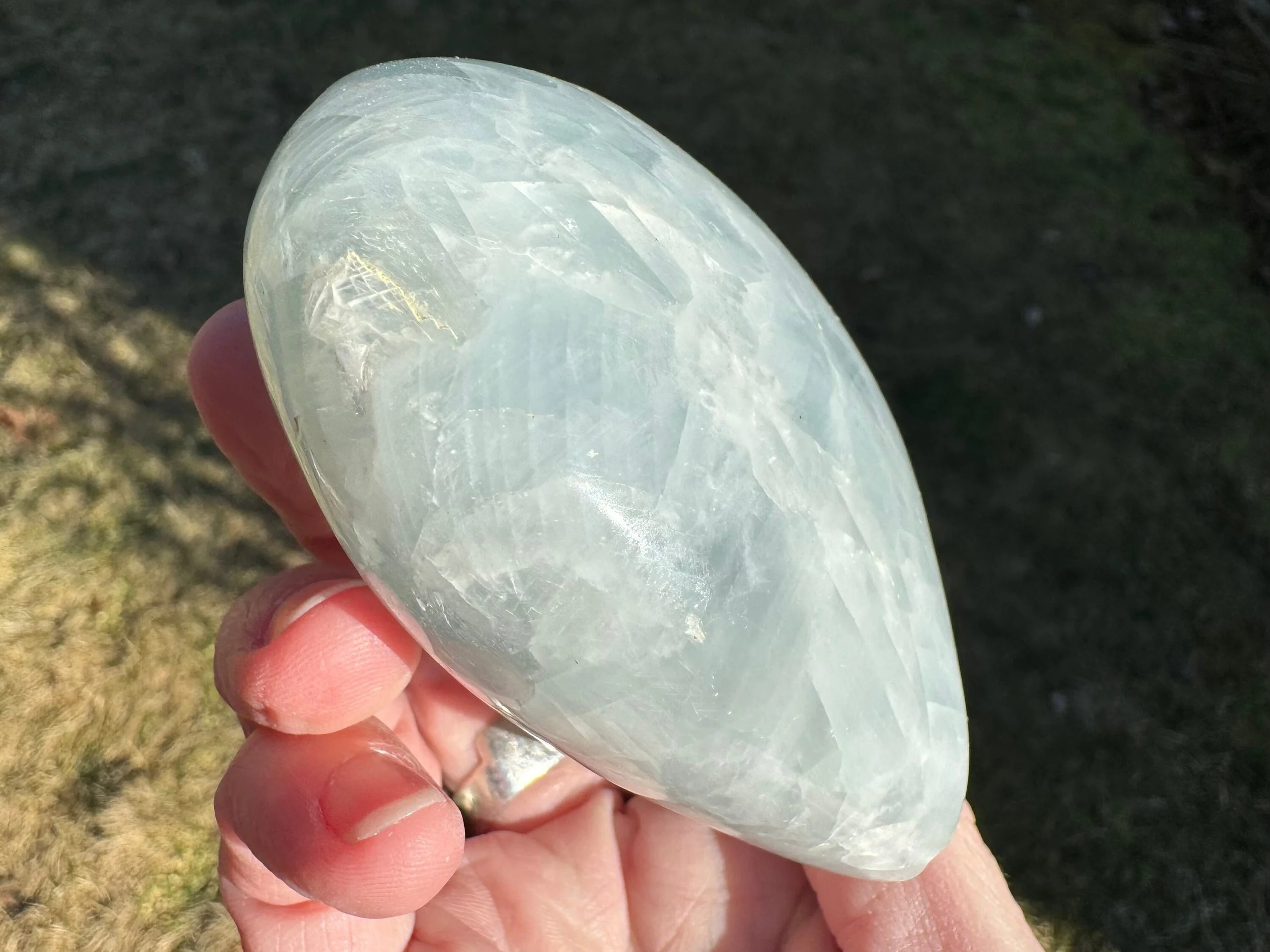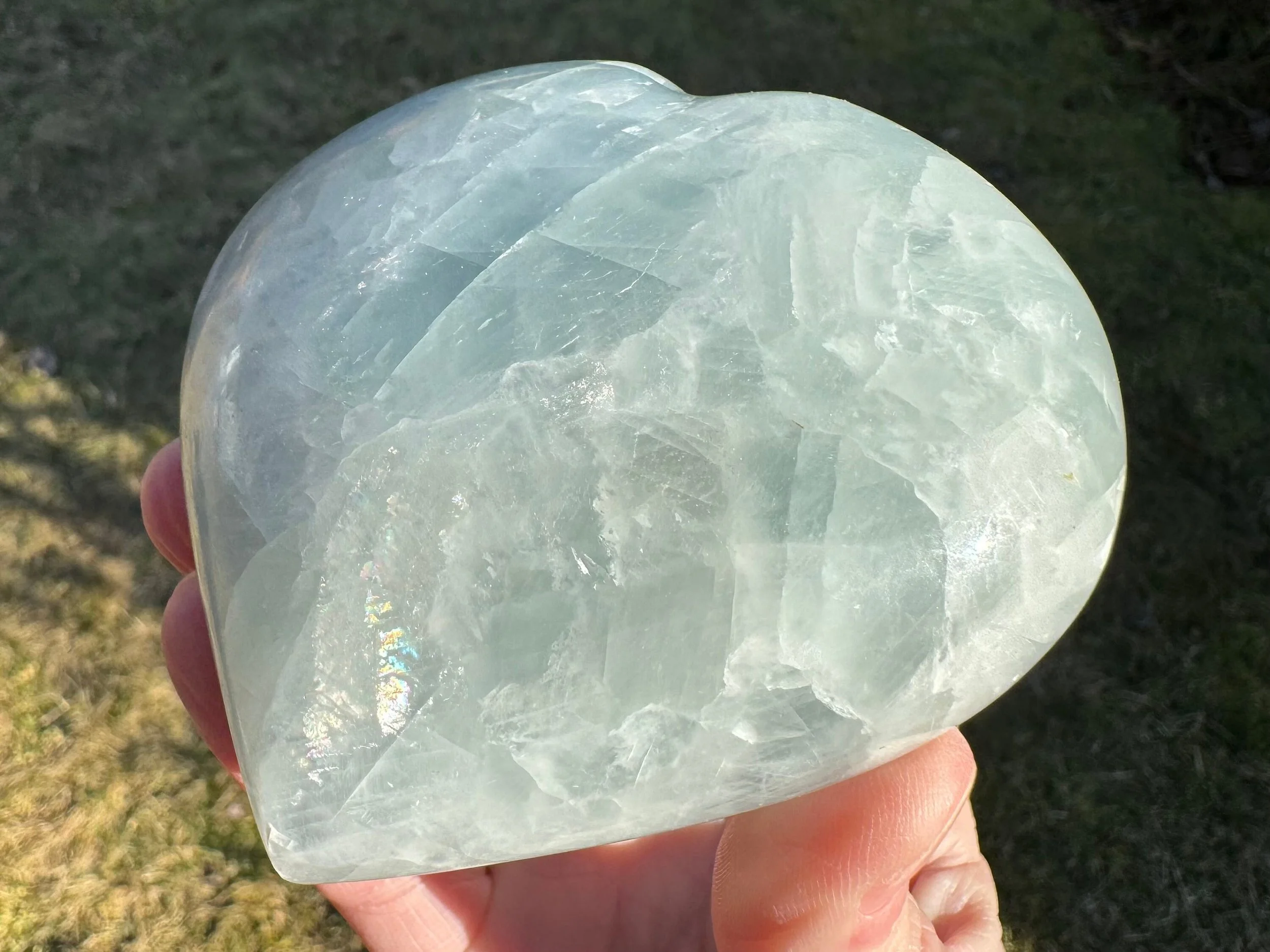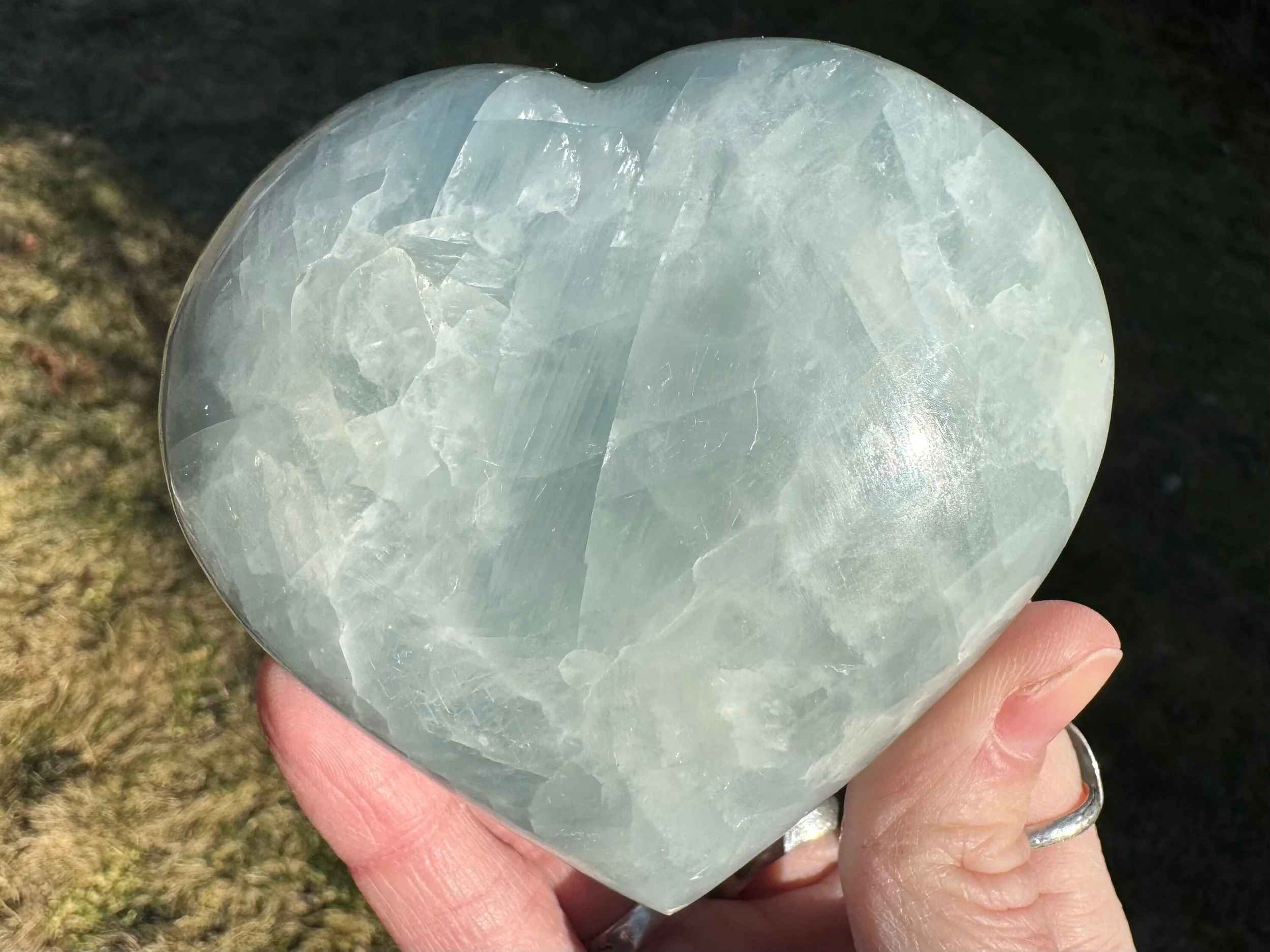 This is a lovely blue Calcite heart. It is a more gemmy, high quality material than most of the blue Calcite I've seen. You can see the shapes of the Calcite crystals and deep beautiful blue coloring, it shiny with a sheen that moves in the light and has some little rainbows too :)