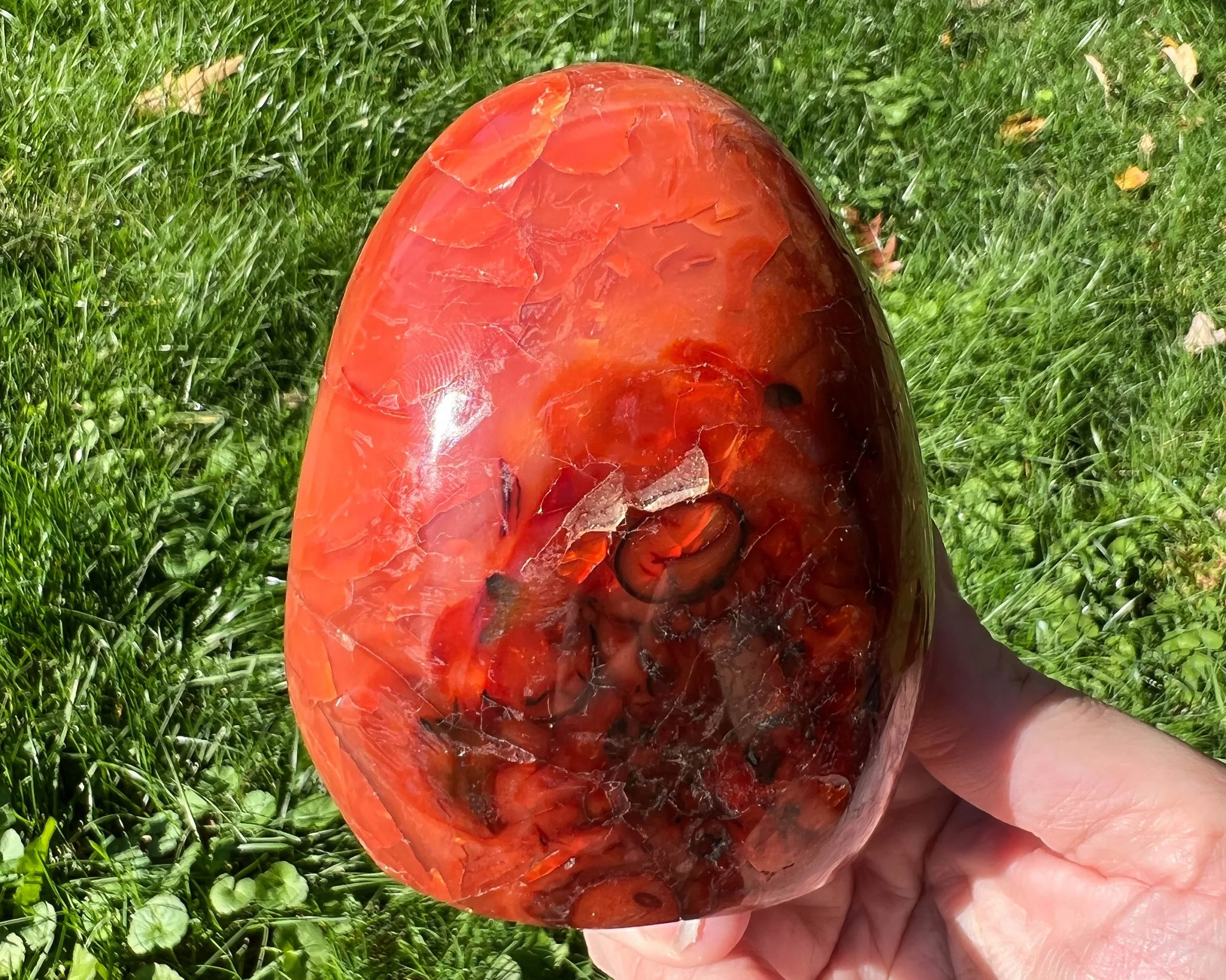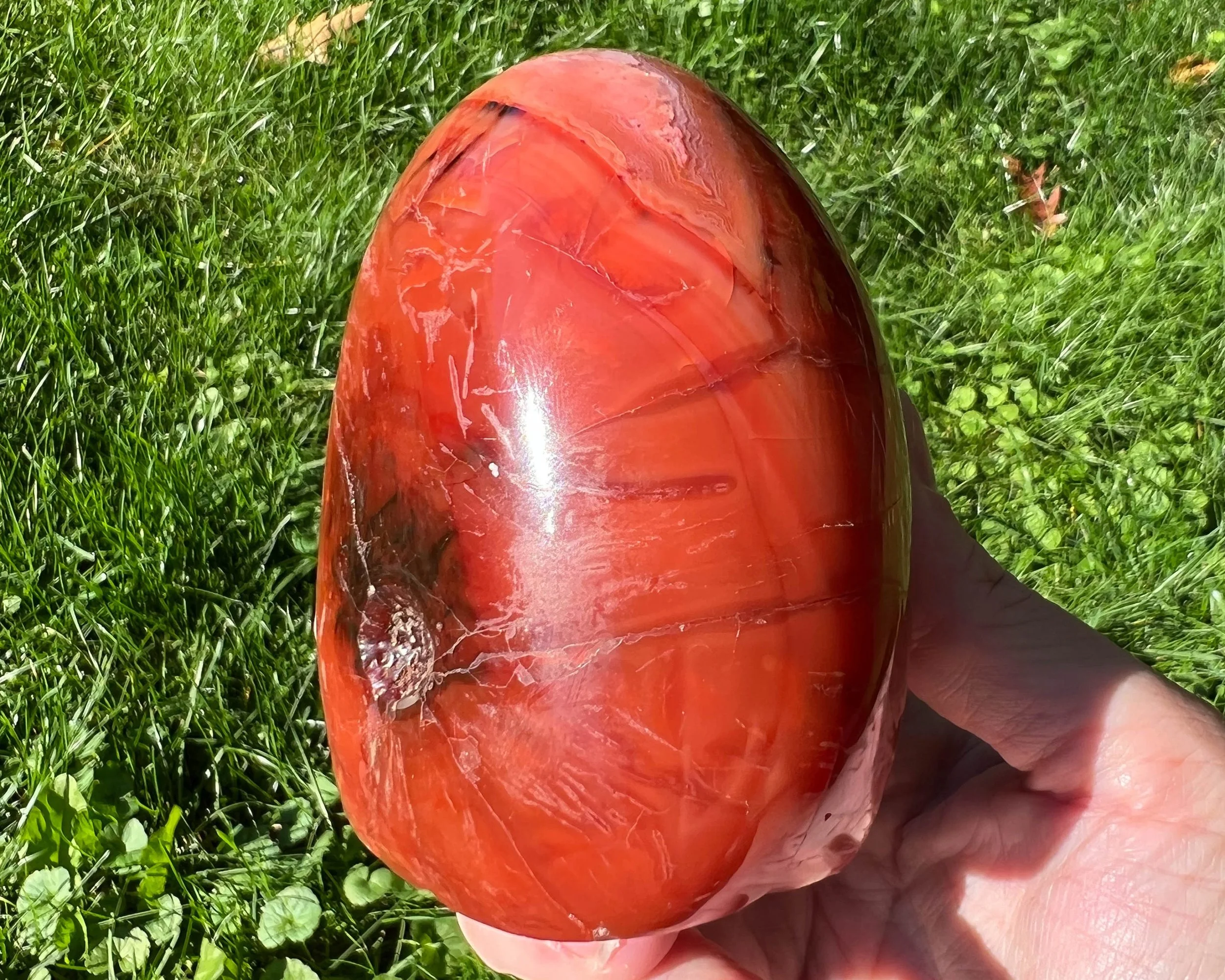 This is a self standing Carnelian Agate freeform display piece with beautiful coloring that has beautiful dark and bright reds, warm vibrant oranges, and contrasting translucent clear / white. It has lovely intricate banding, funky vein-like patterns and a funky little pocket.