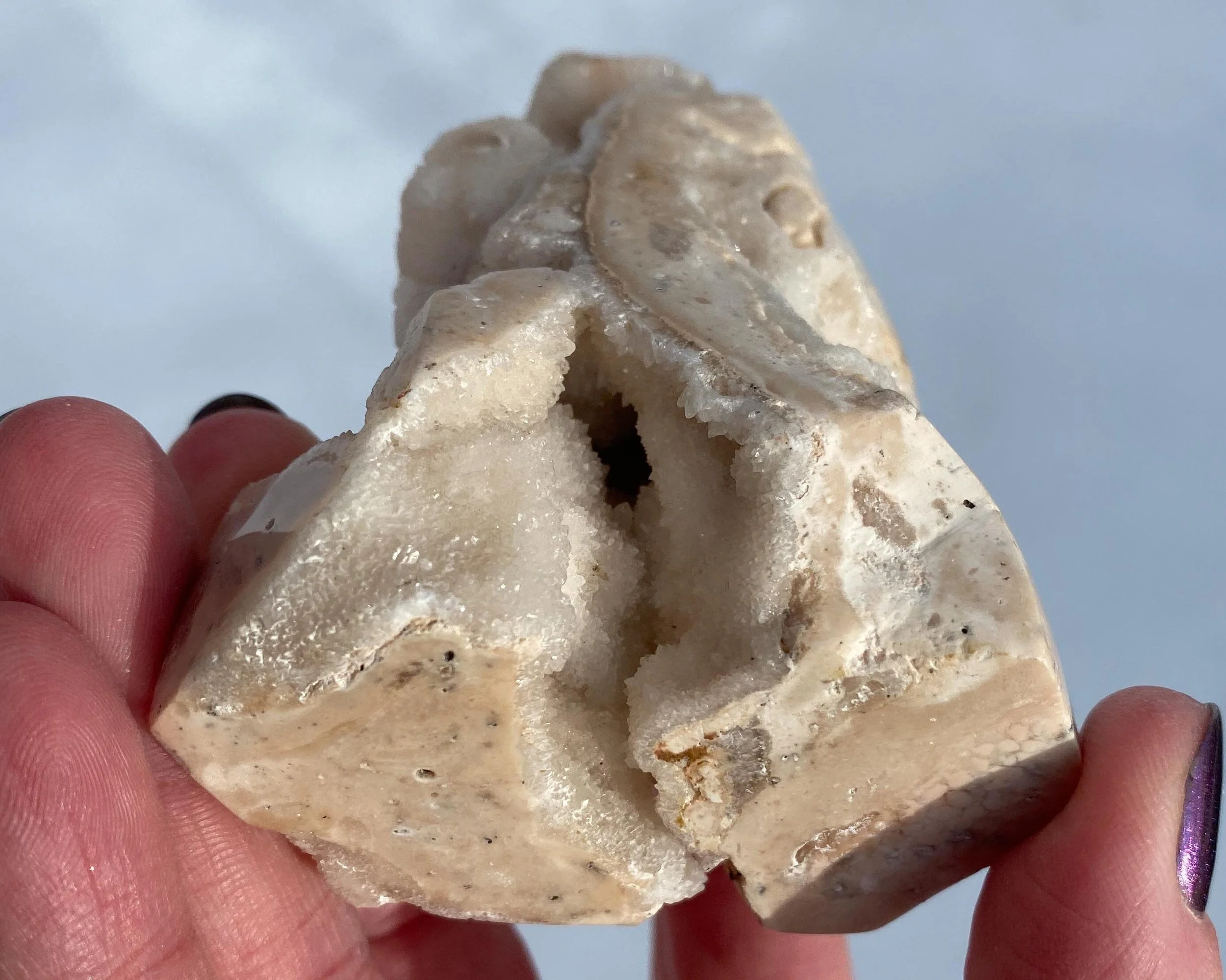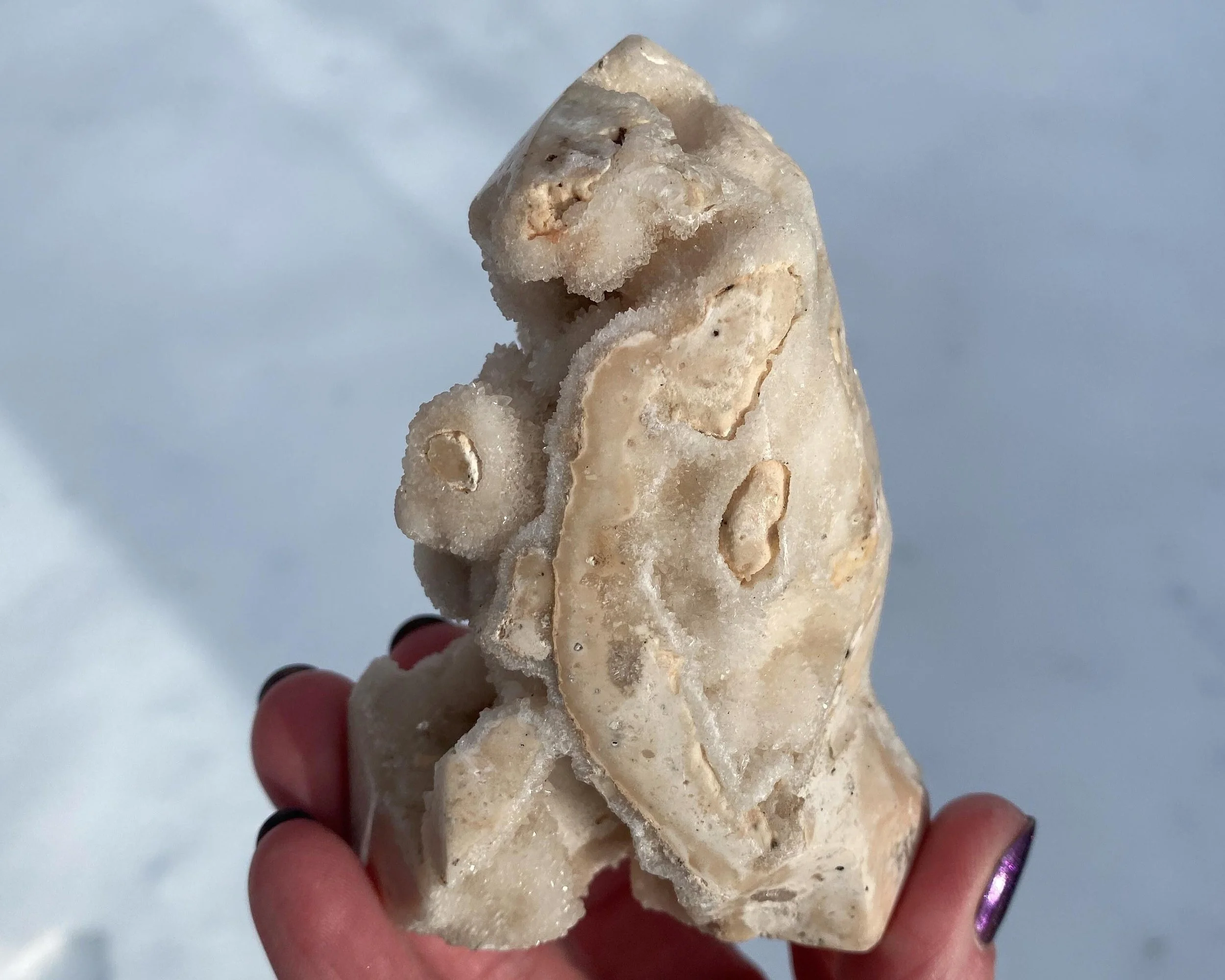 This is a wonderful tower carved from sparkly druzy Quartz covering either Chalcedony or Agate or perhaps both. It is lumpy and bumpy and full of funky caves. It is mostly white, mostly natural with some polished spots to shape it into a point. Very cool self standing piece.