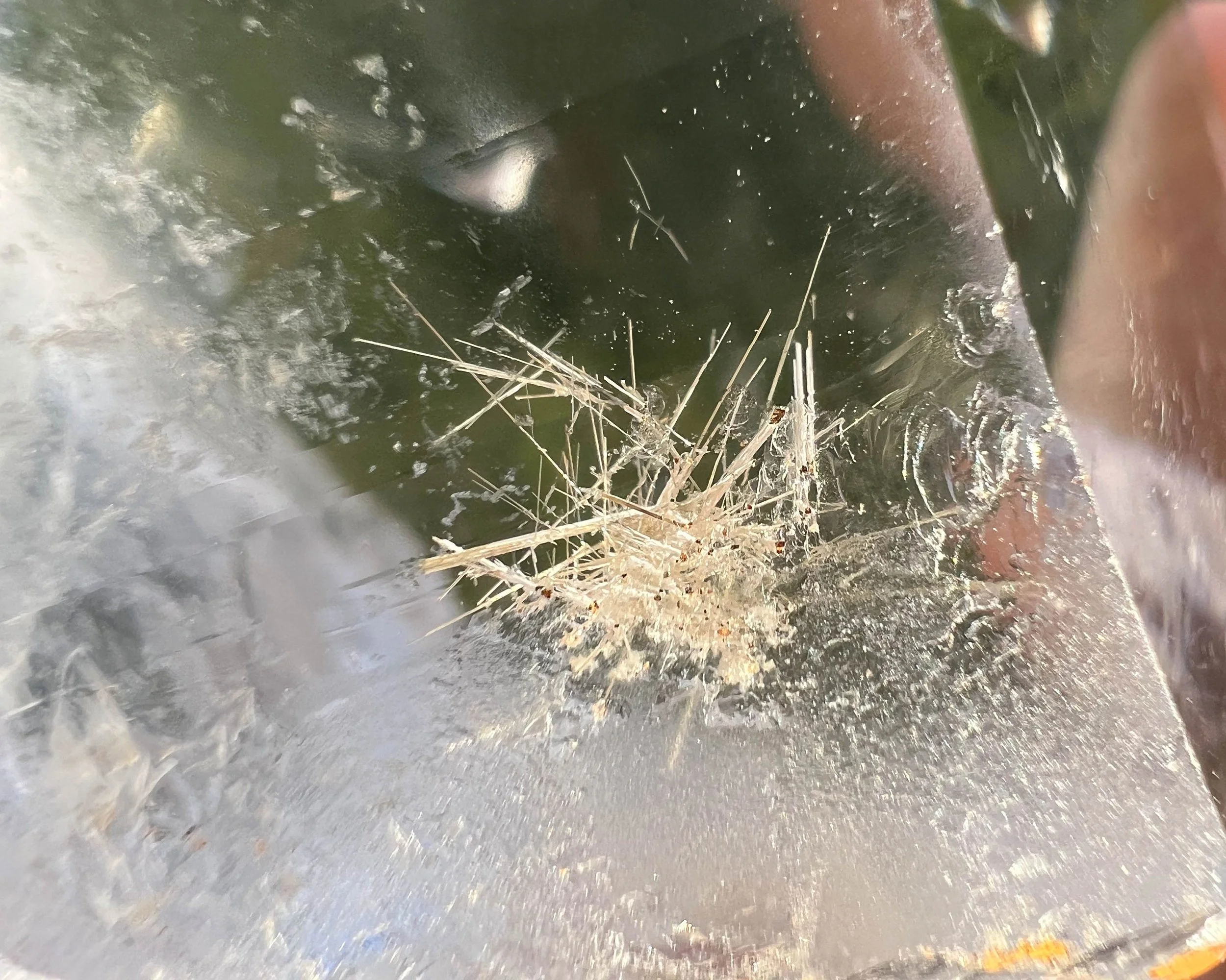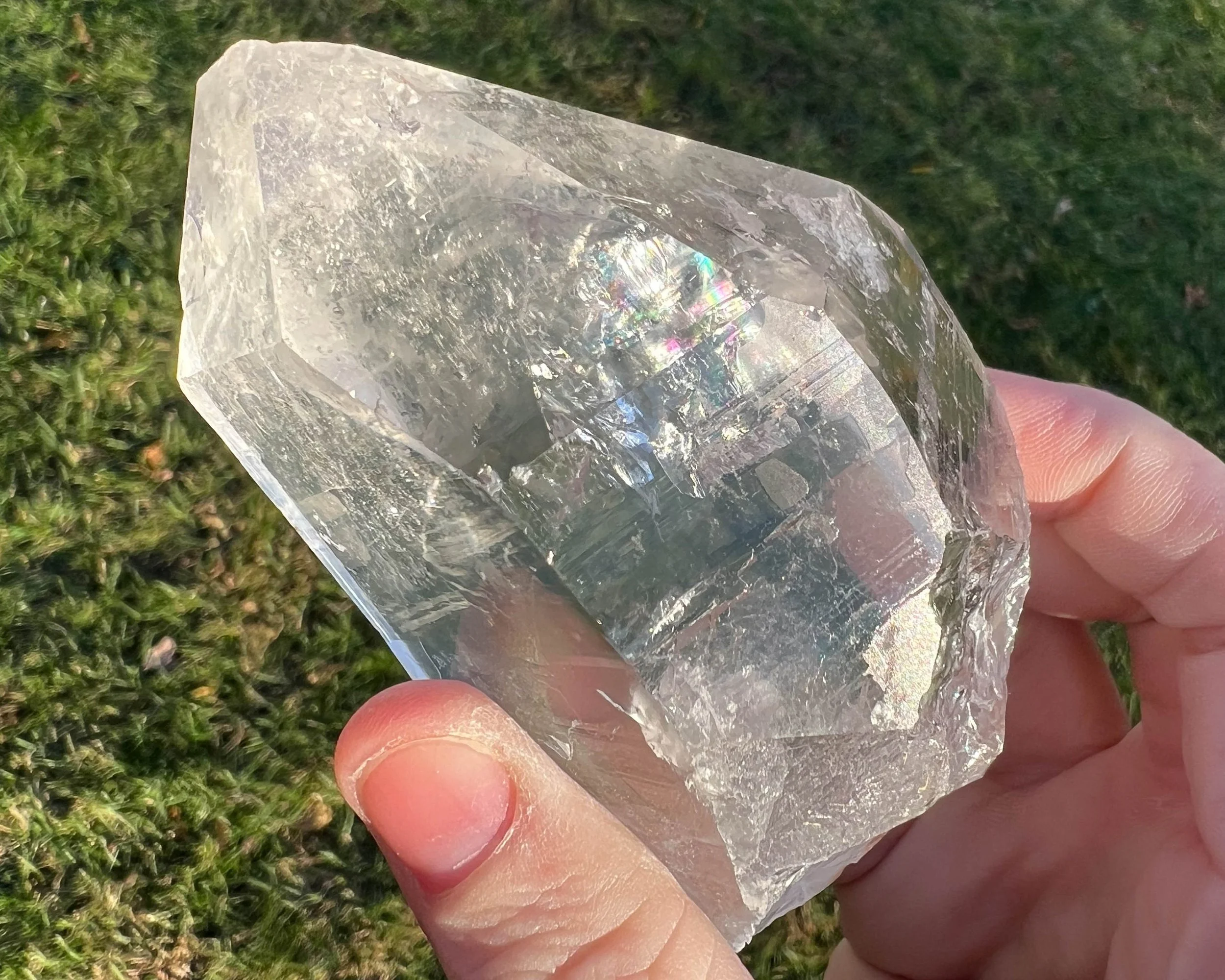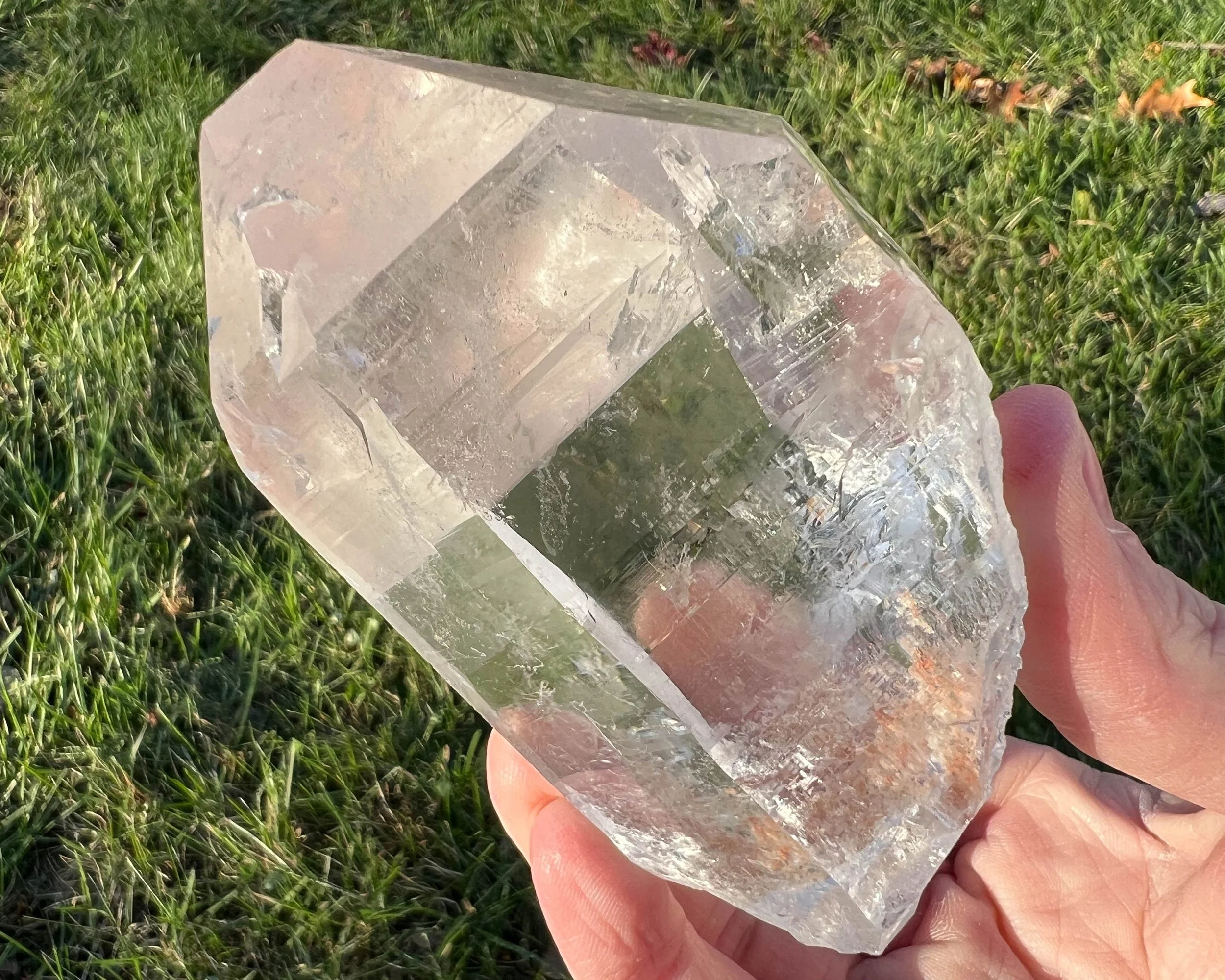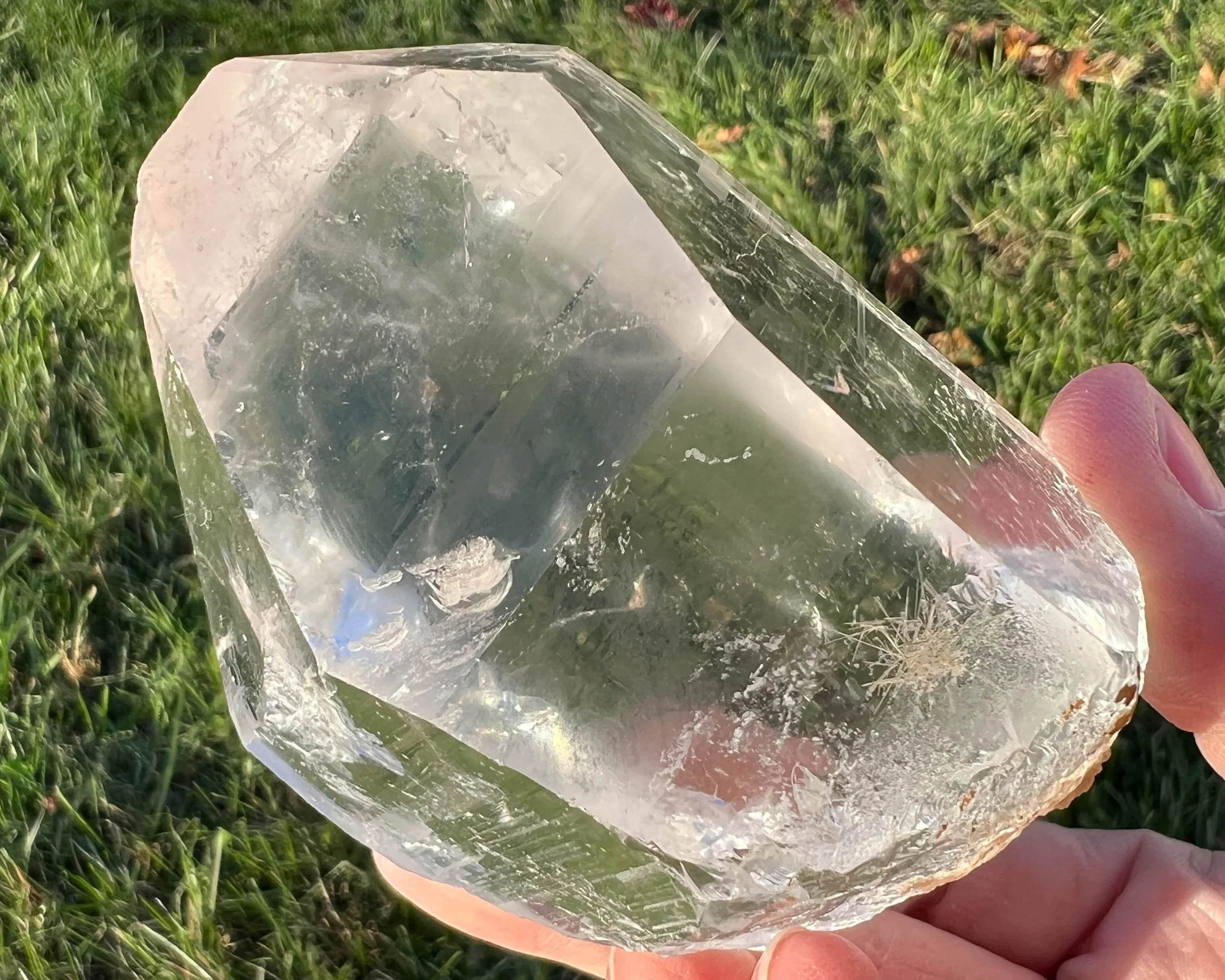 This one has optical clarity- water clear and chunky too. It has a little cluster of Rutile in it near the bottom which is pretty cool too. A really beautiful raw crystal.