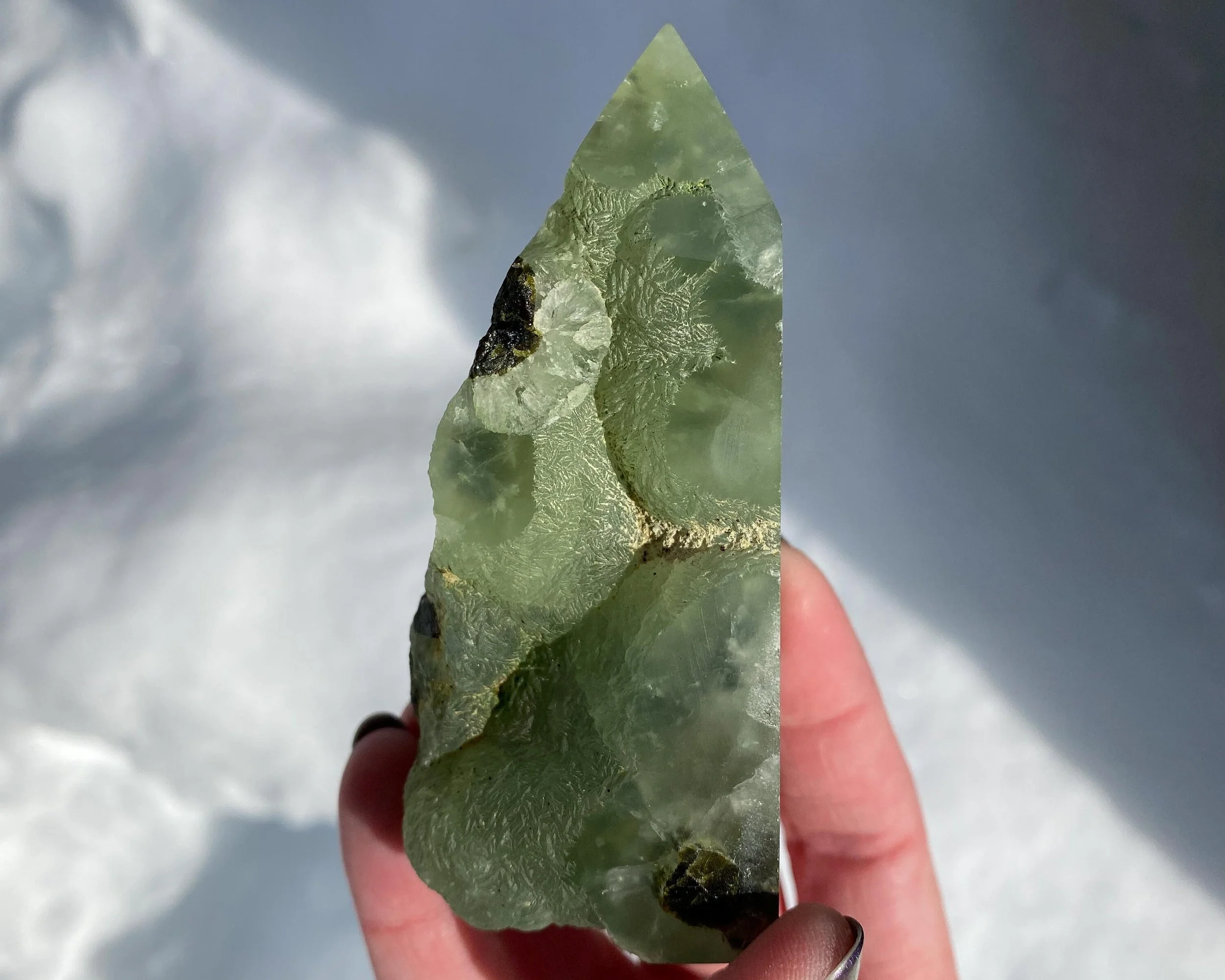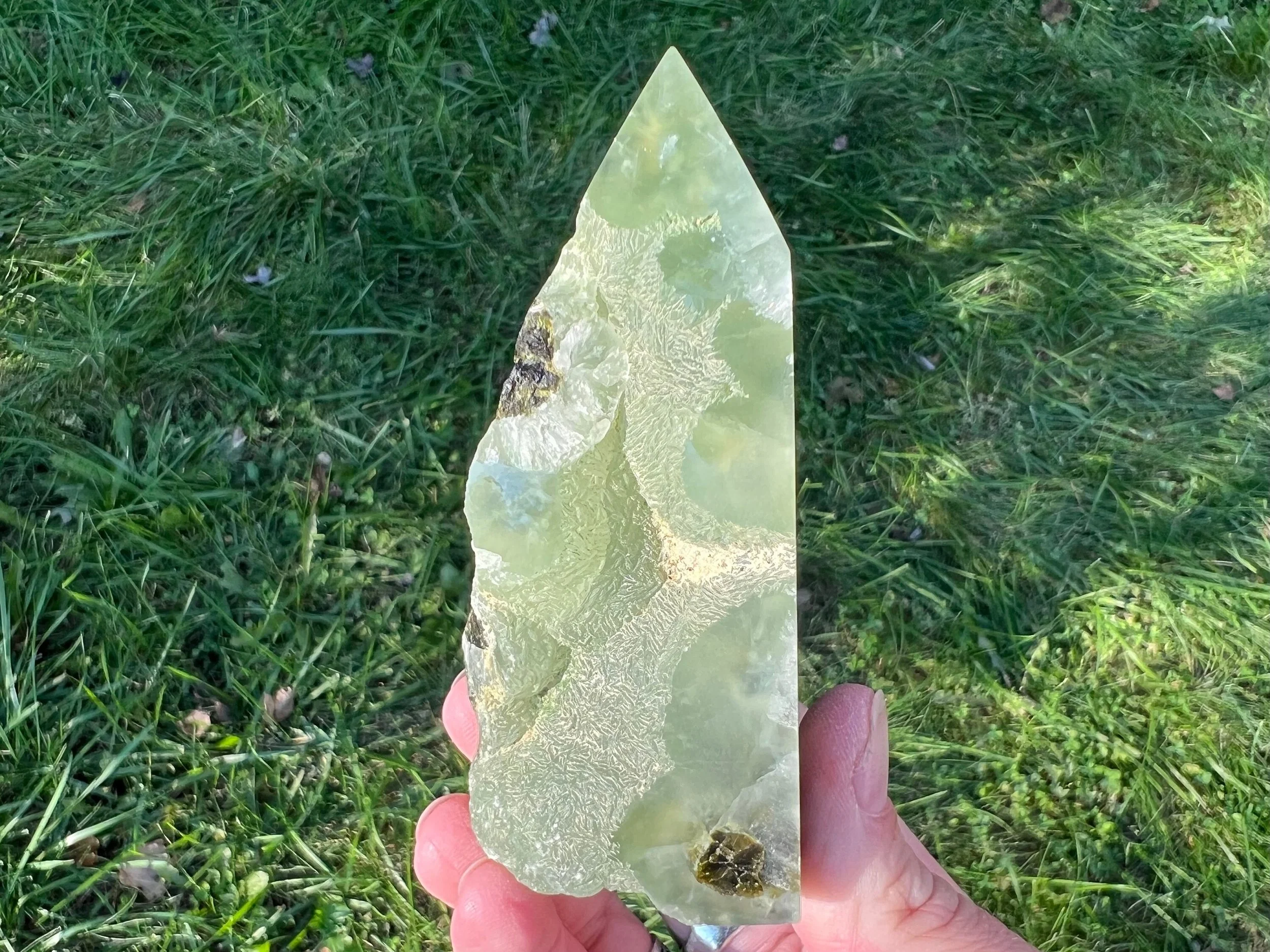 This is a semi polished Prehnite and Epidote crystal tower. It has a soothing green color that glows gorgeous in the light. It is semi polished, with some parts left natural / rough / raw. It has dark green Epidote inclusions in bright green Prehnite, cut and polished into a self standing point. A lovely gift to yourself or a loved one.
