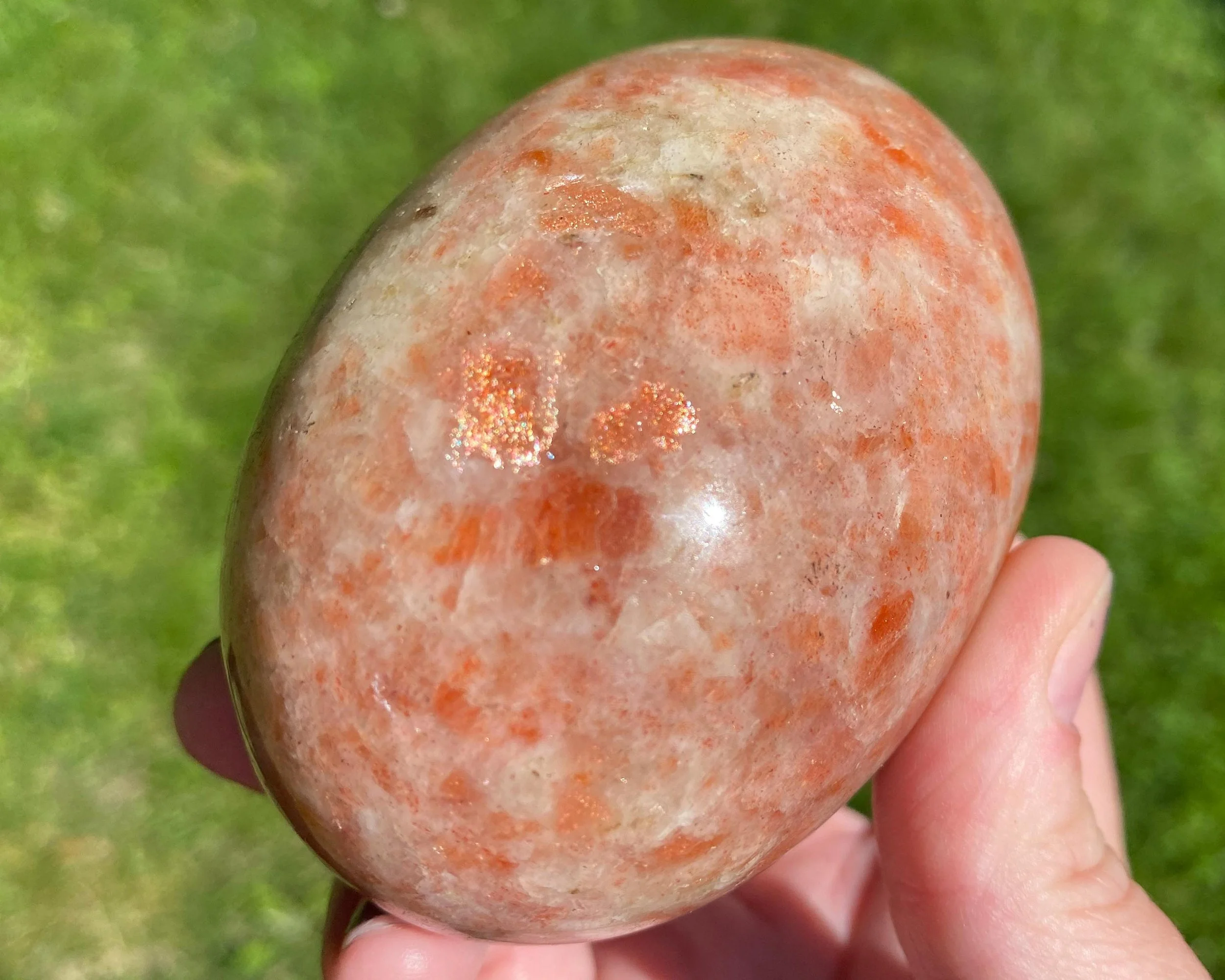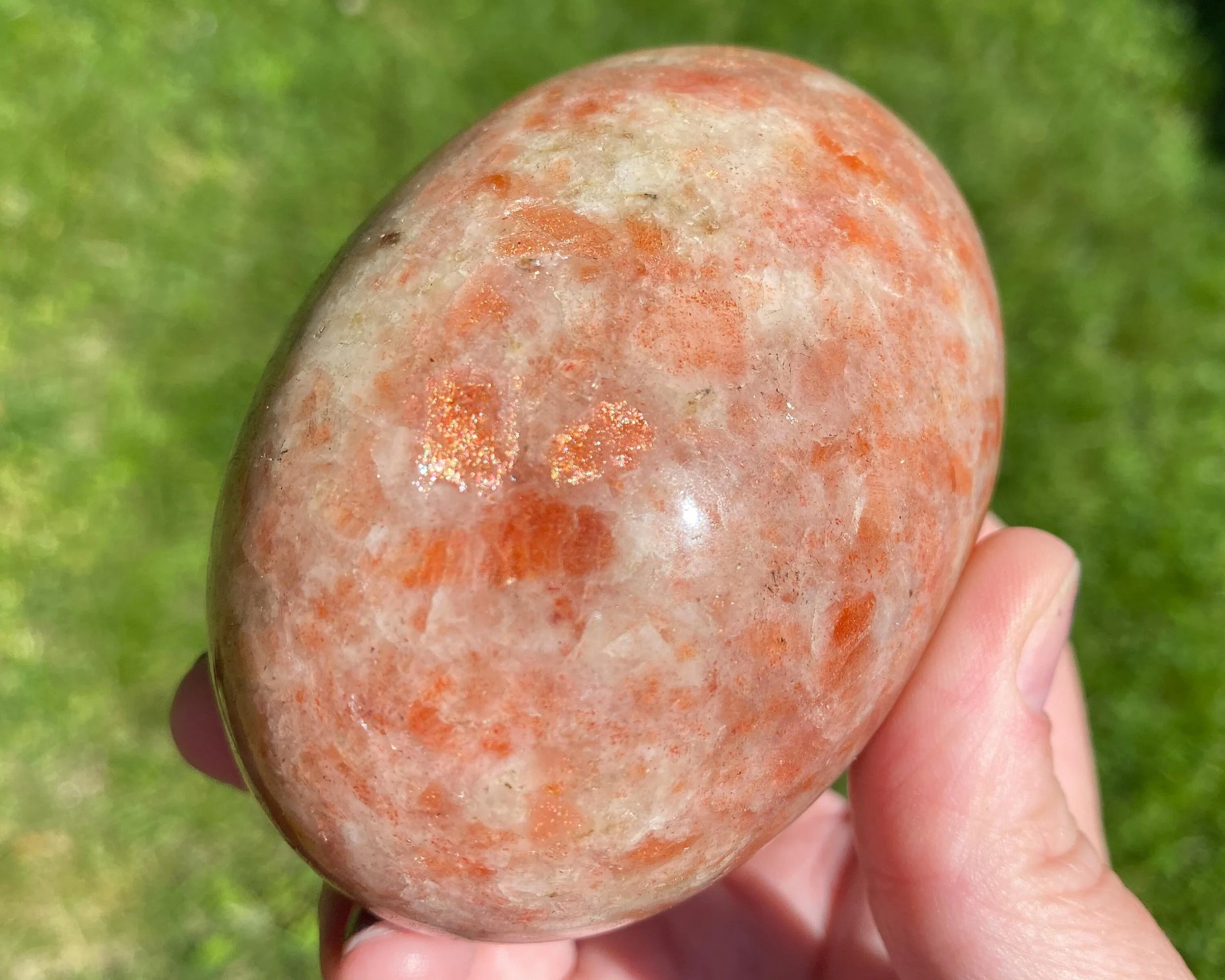 This Sunstone has chatoyant, sparkly "confetti" that glitter when light hits them. It is very pretty and fun and makes a great pocket friend :) It is carved and polished into the Shiva Lingham shape. This one is very sparkly, great quality!