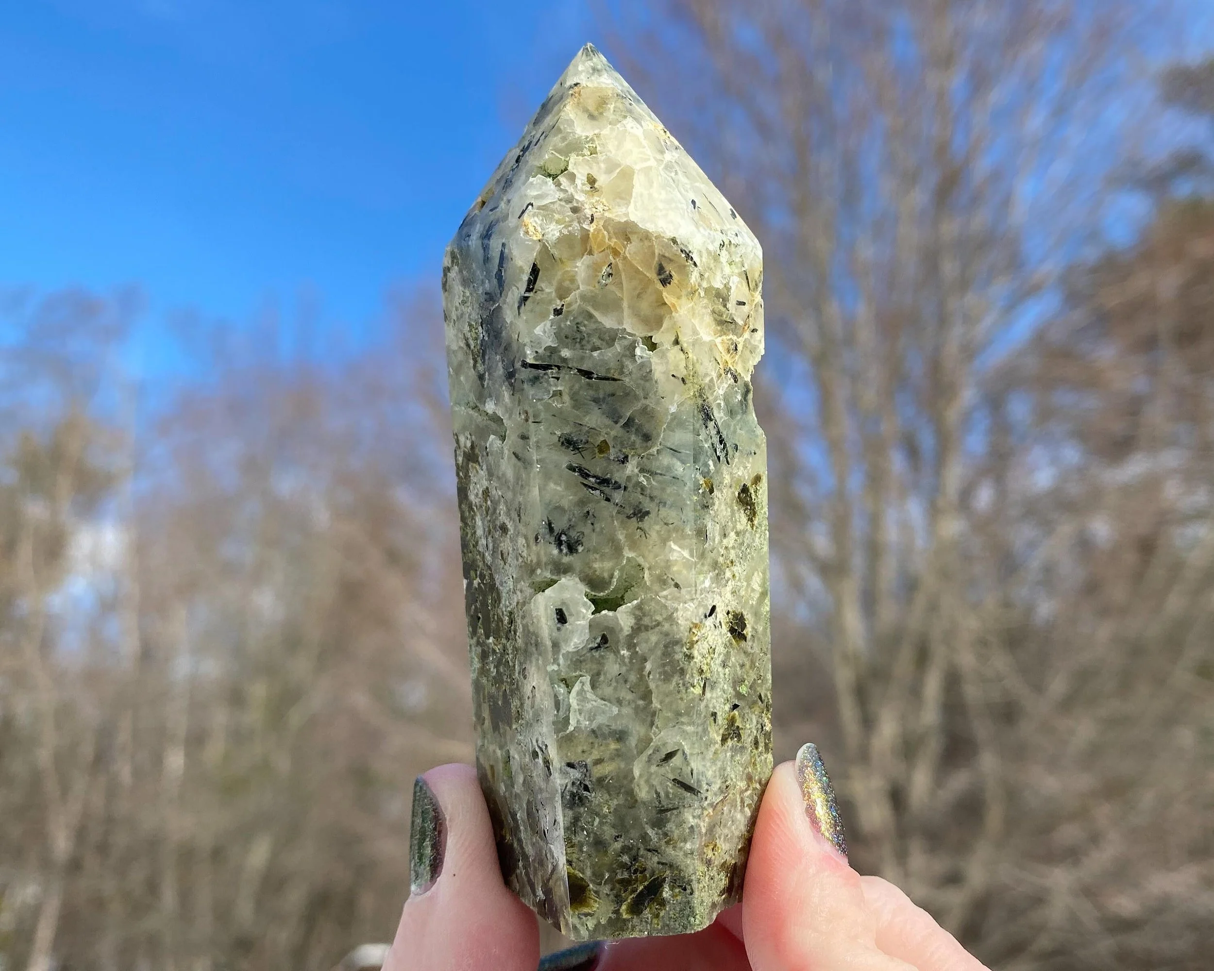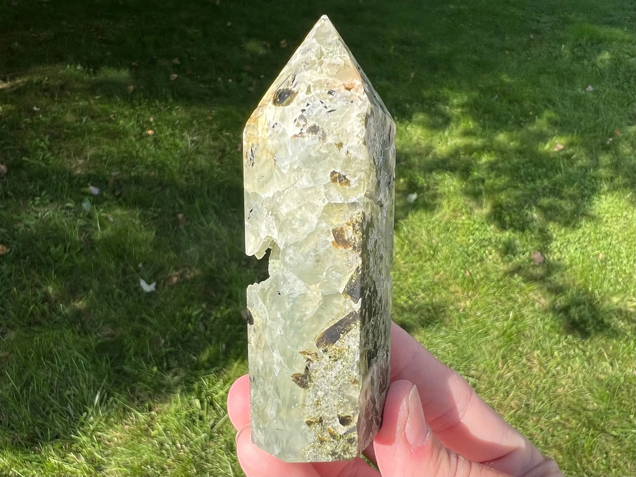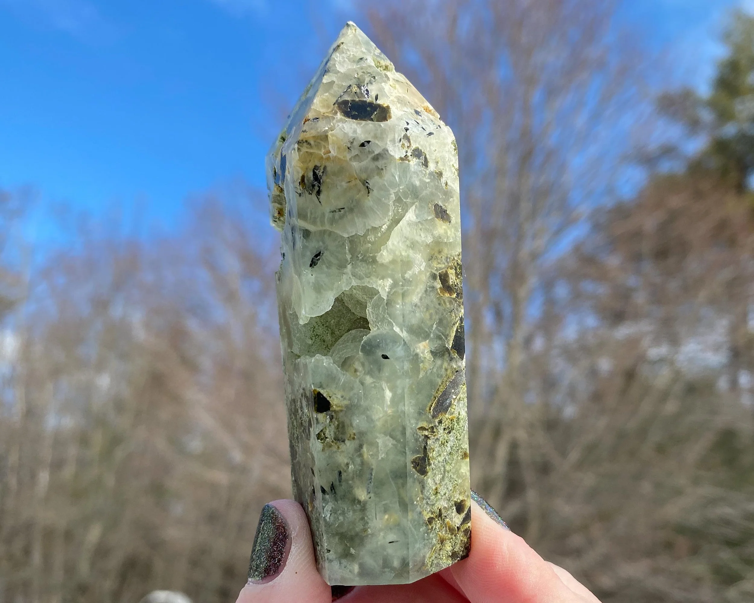 This Prehnite and Epidote crystal tower has a soothing green coloring that glows gorgeous in the light. It is semi polished, with some parts left natural. It has dark green Epidote inclusions inside bright green Prehnite, cut and polished into a self standing point. They are so lovely.