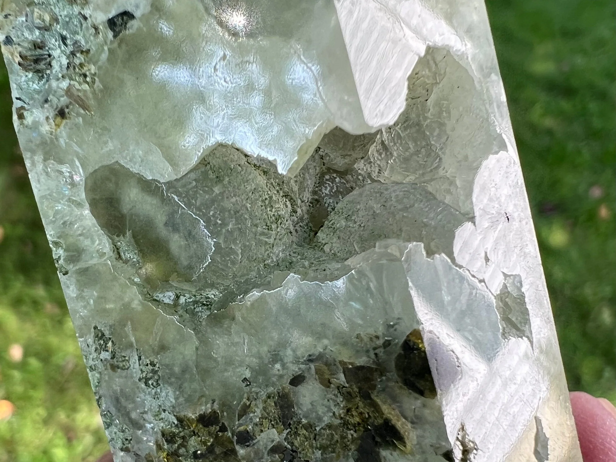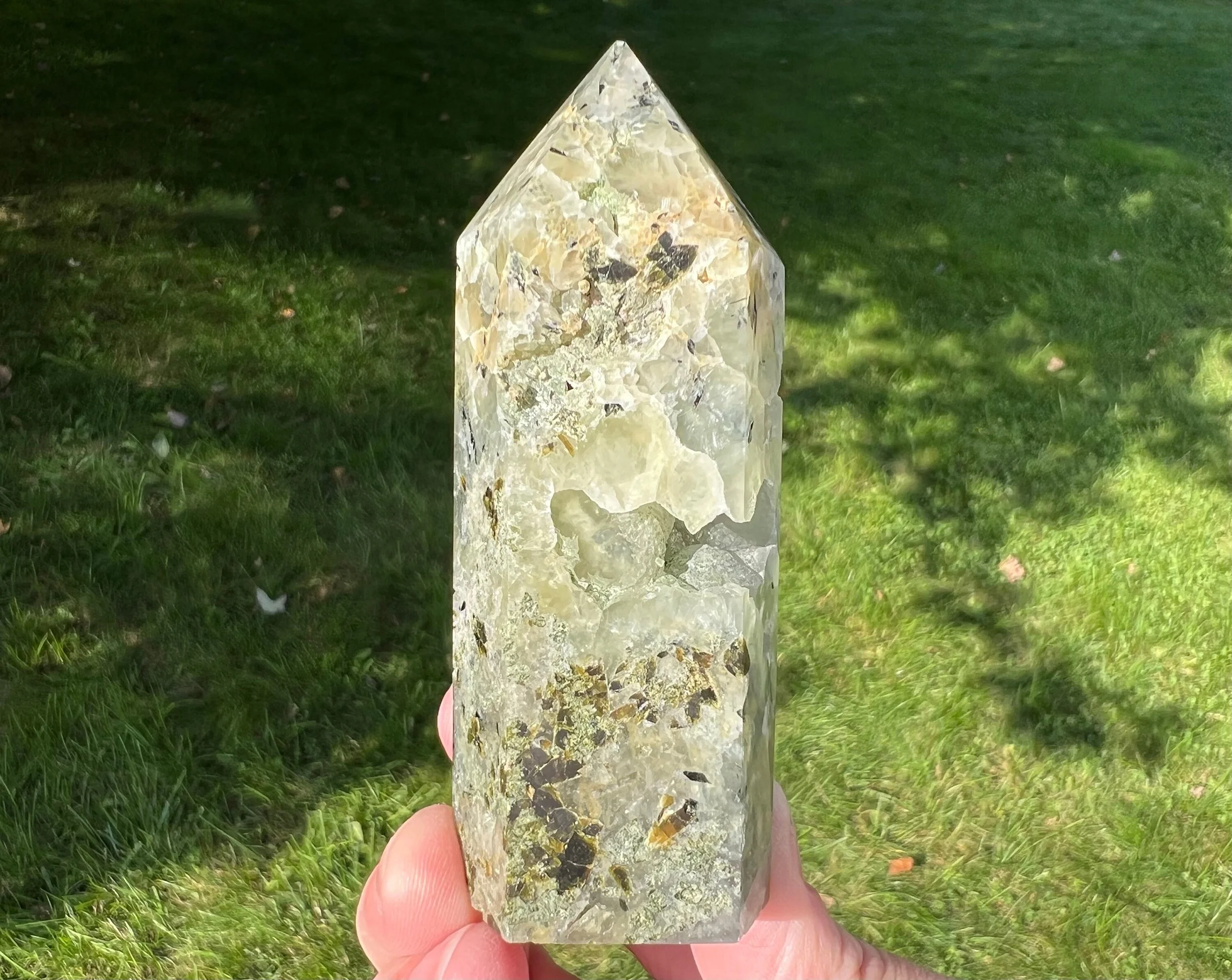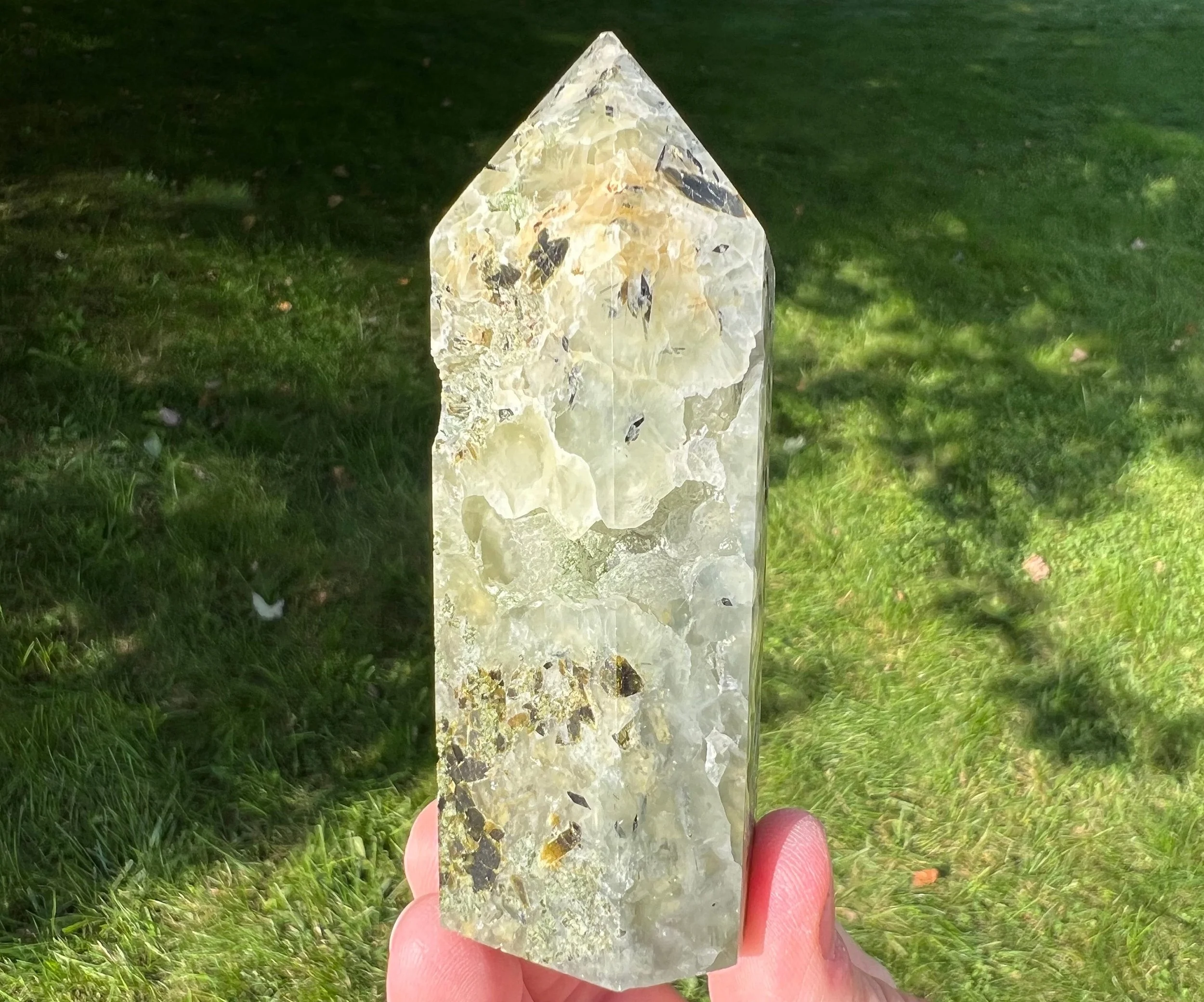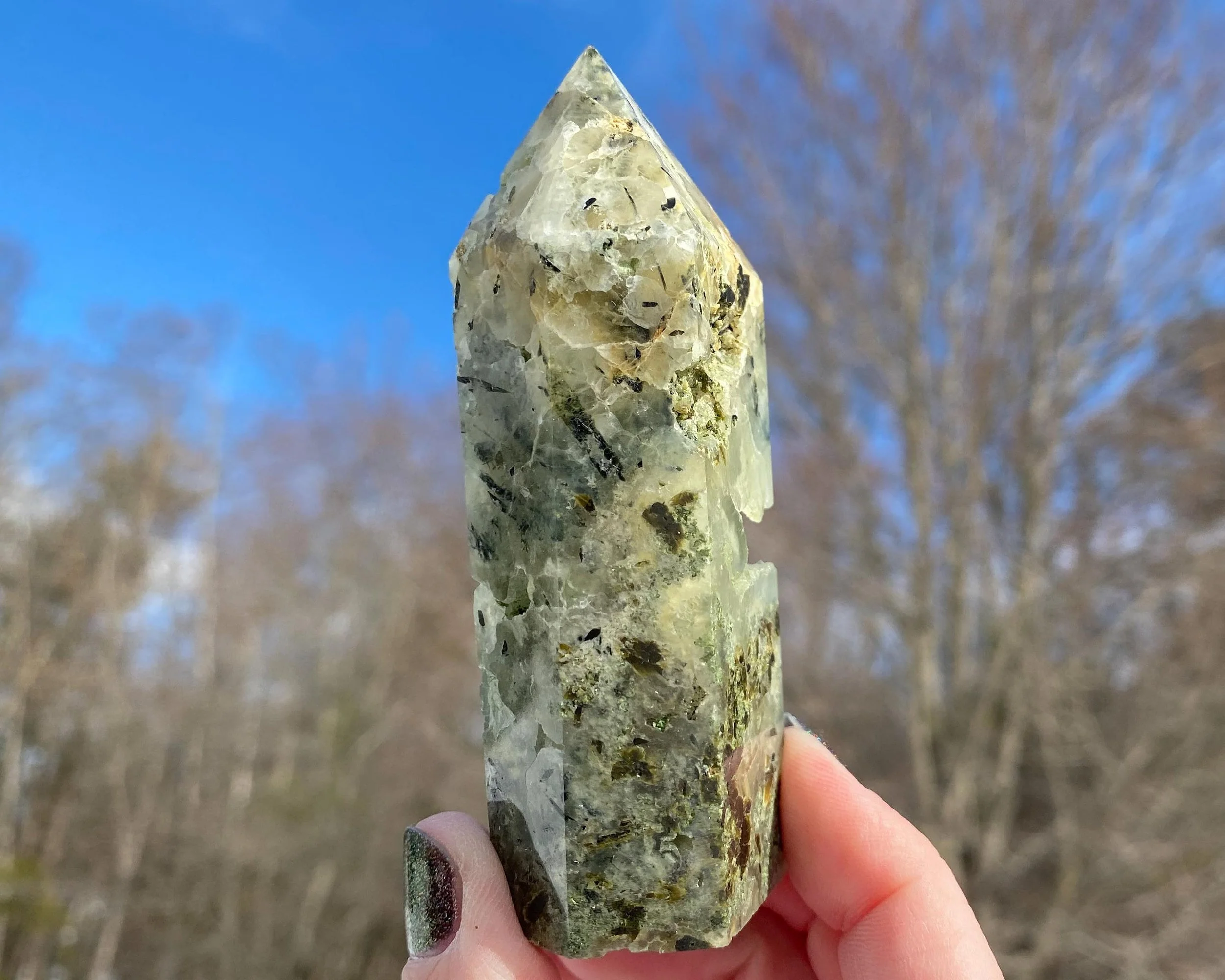 This Prehnite and Epidote crystal tower has a soothing green coloring that glows gorgeous in the light. It is semi polished, with some parts left natural. It has dark green Epidote inclusions inside bright green Prehnite, cut and polished into a self standing point. They are so lovely.