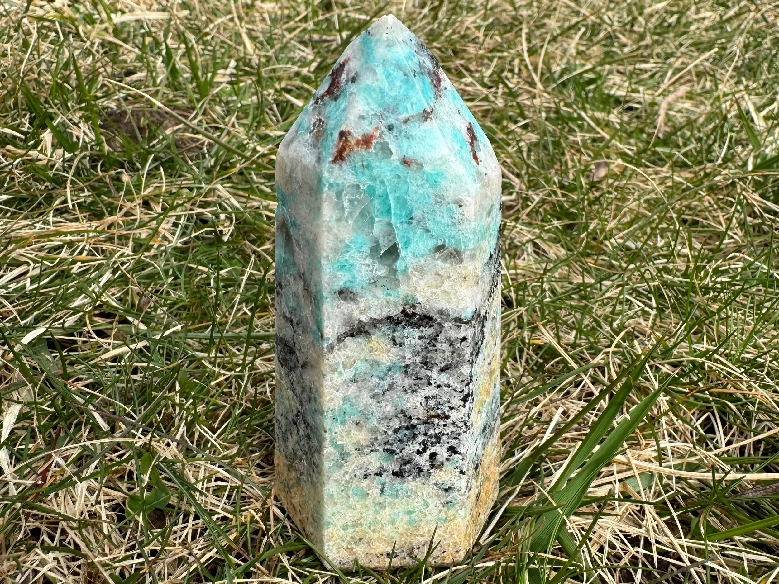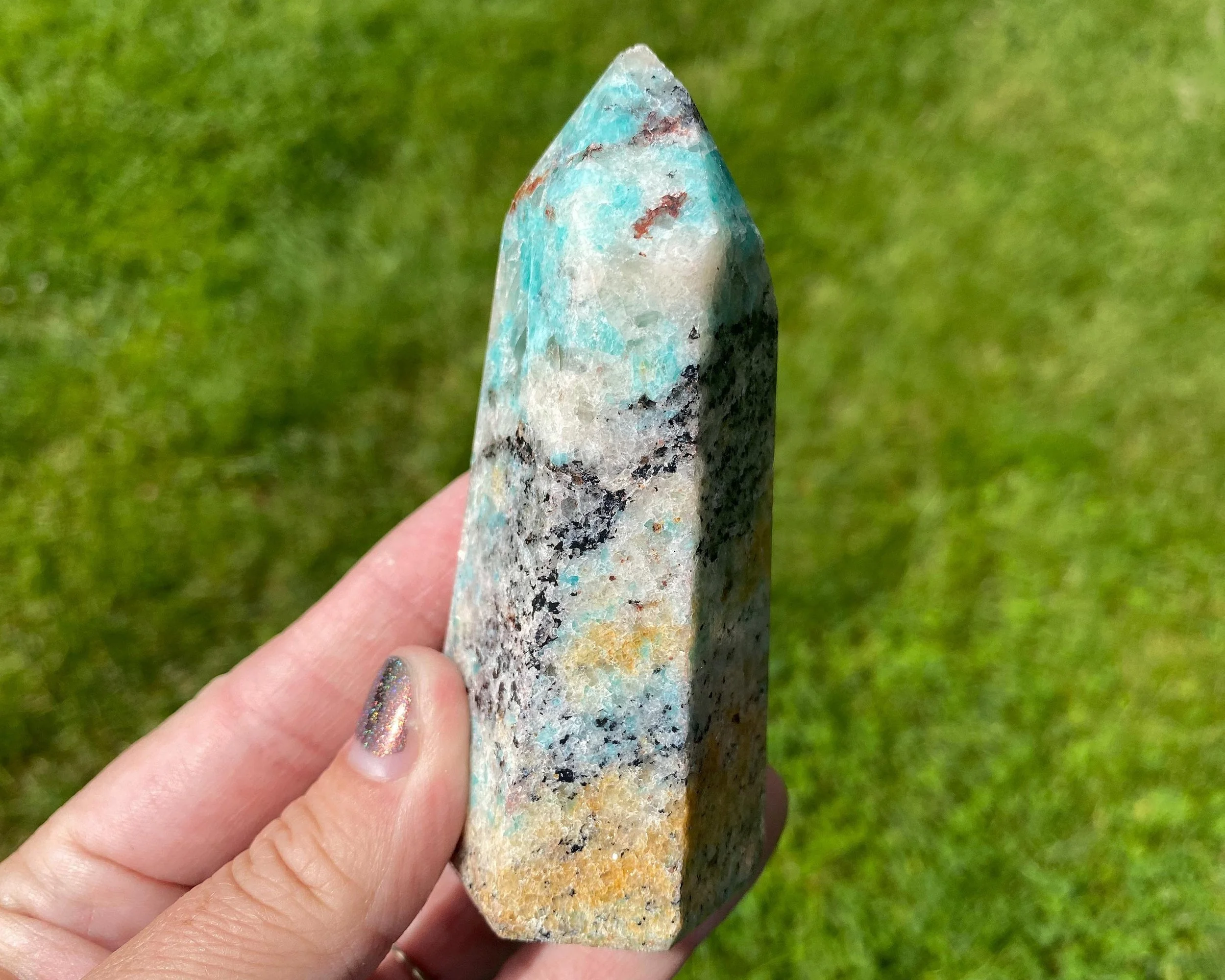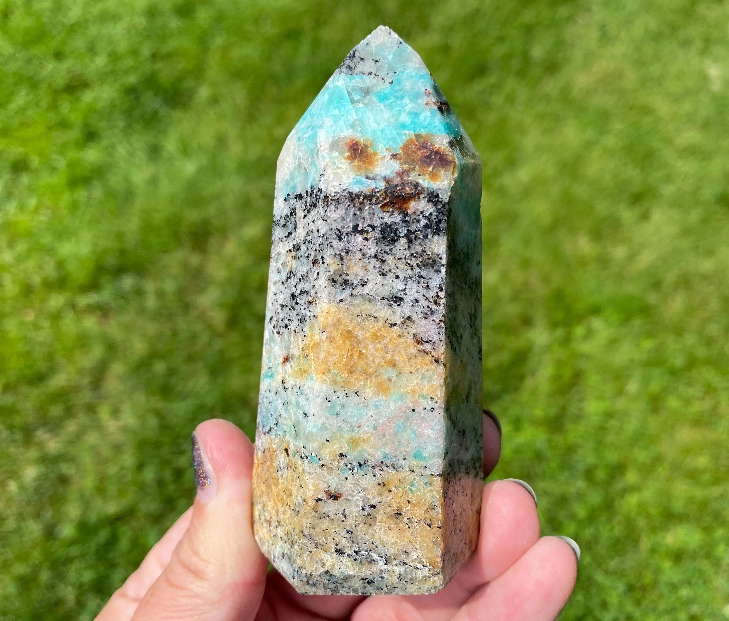 This is a beautiful and vibrant tower of vibrant Amazonite with Smoky Quartz and other minerals. It has bright blue greens, black, gray and white. It is colorful with pretty contrast and self standing.
