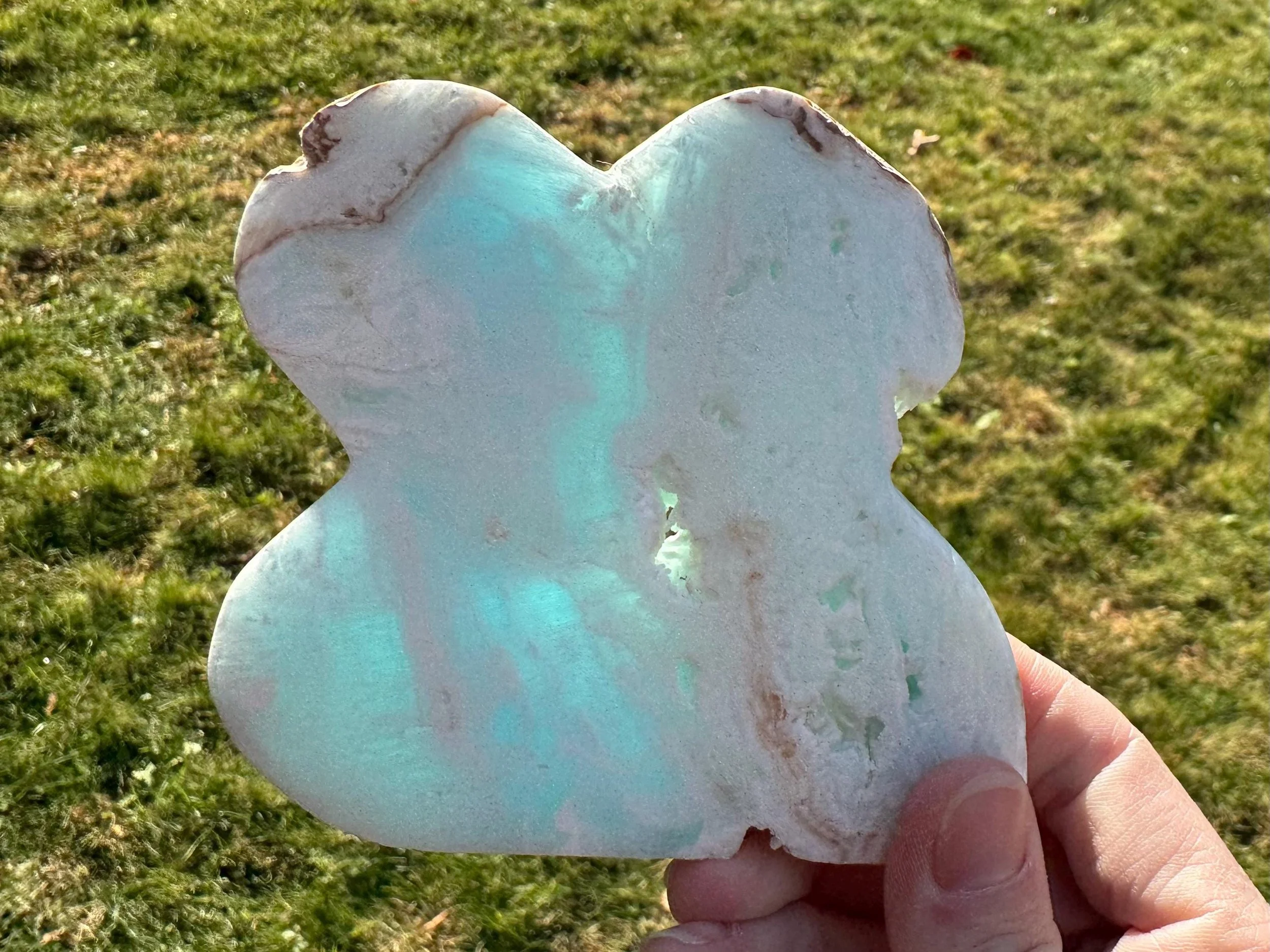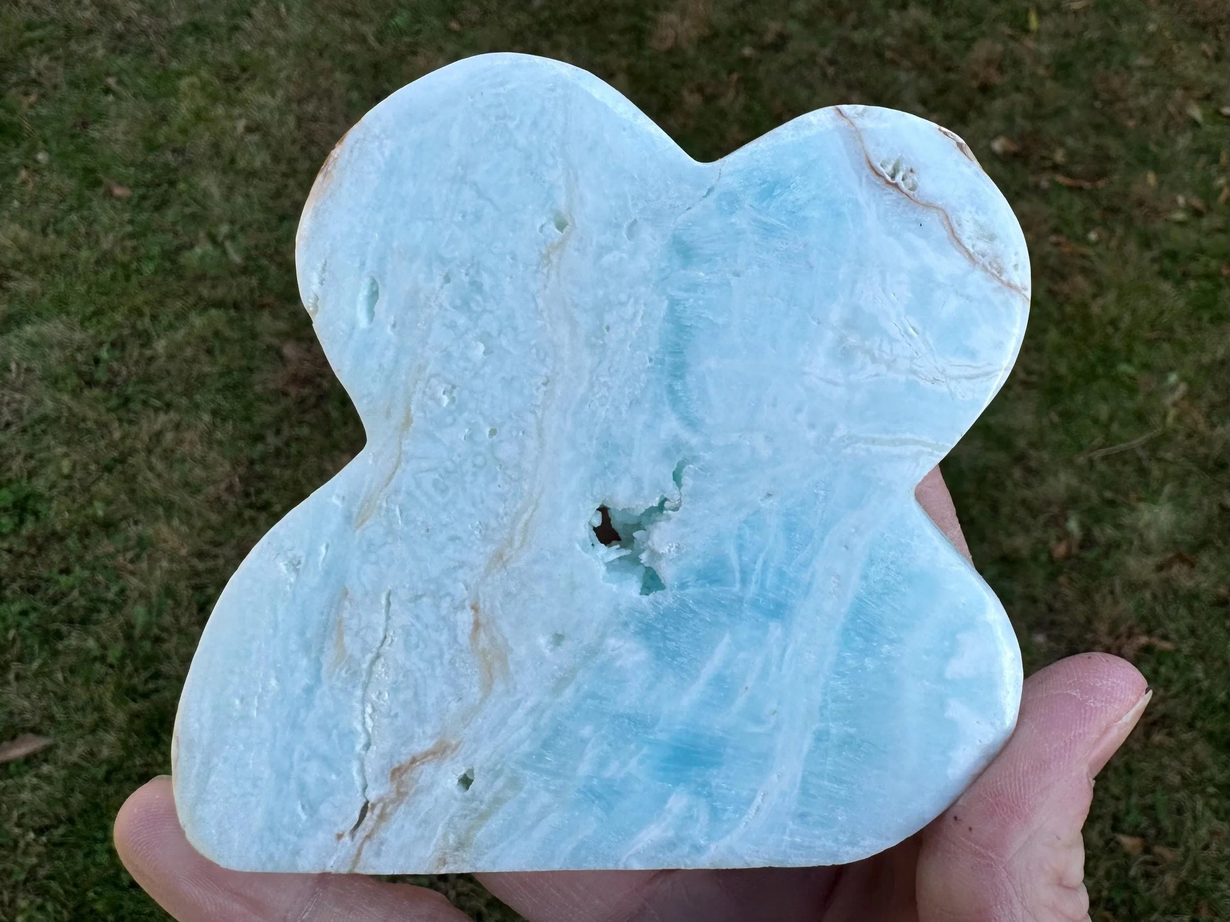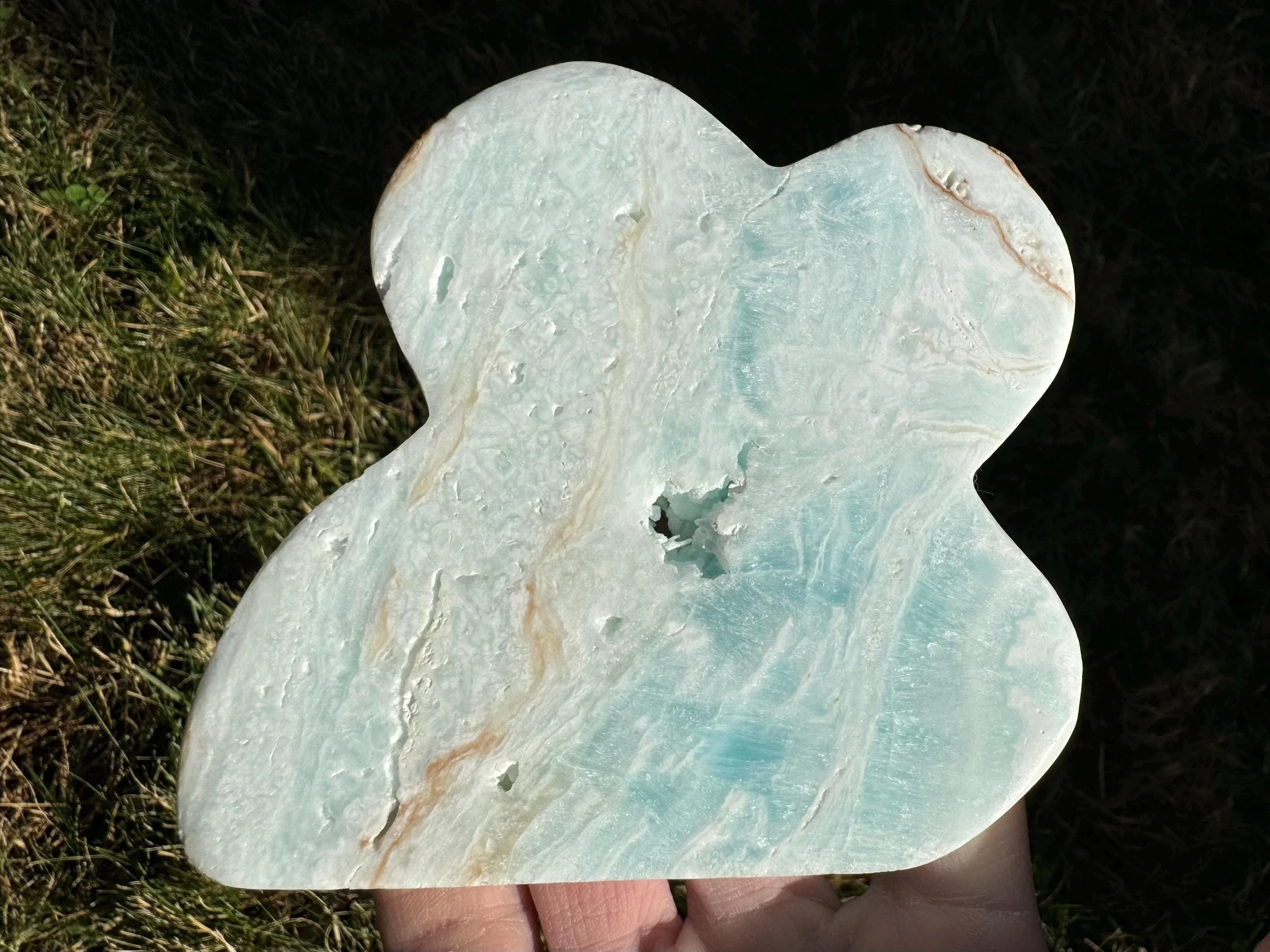 This is a sweet cloud figurine carved from beautiful blue Calcite and Aragonite. These have a gorgeous Caribbean blue coloring with swirls of white and sand colored browns. Reminiscent of the Caribbean Sea. This cloud carving has natural little pockets in the stone with Aragonite crystal formations in them, the one in the middle goes right through like a little tunnel. A cool piece of home decor, and a great gift for any crystal collector, witchy human, ocean, beach or weather lover, really just about anyone, even yourself :)