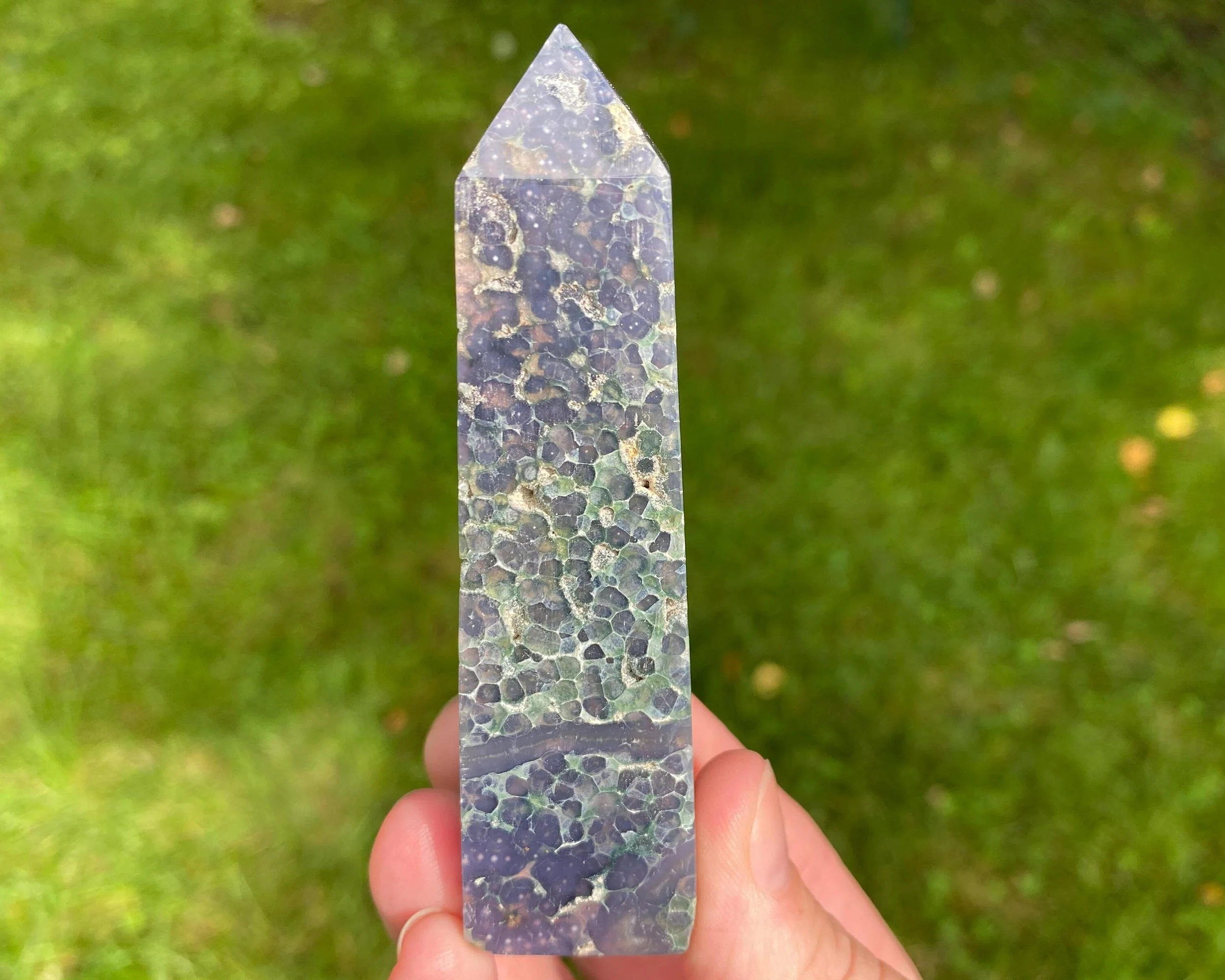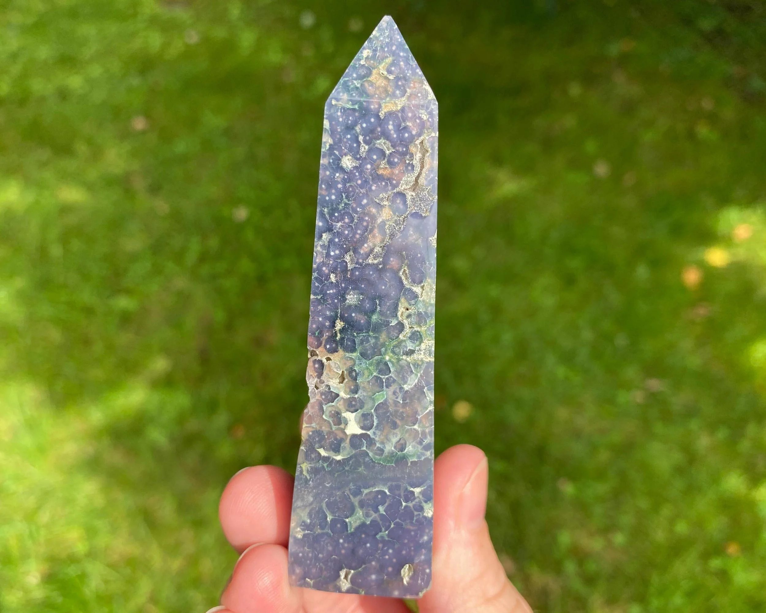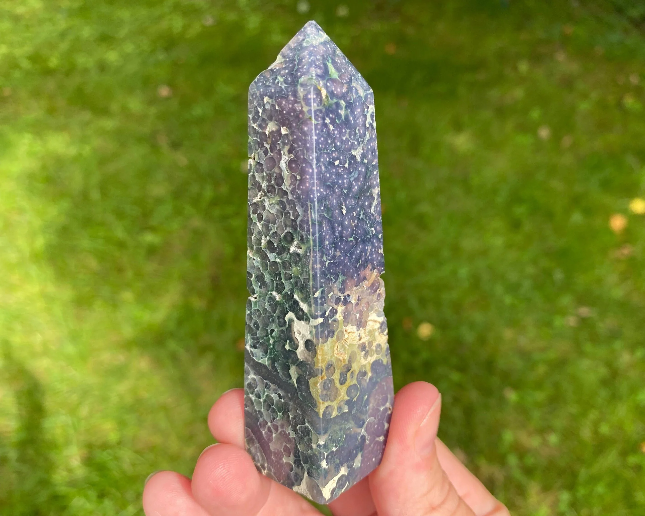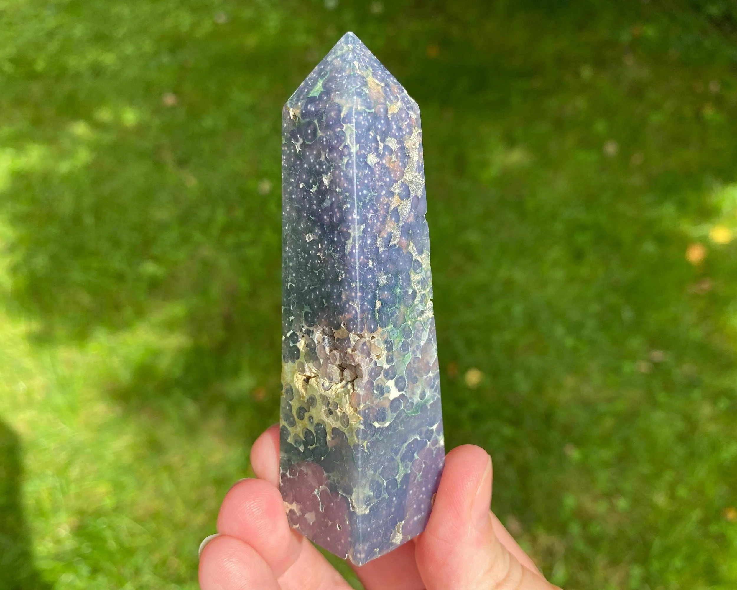 This is a beautiful semi-polished Grape Agate tower, also known as purple and green Botryoidal Chalcedony with Druzy Quartz. It comes from Indonesia and is not enhanced or dyed. The druzy can be very sparkly, and some has a shiny, velvety look to it. The polished area has very cool patterns with beautiful colors. Gorgeous all around!