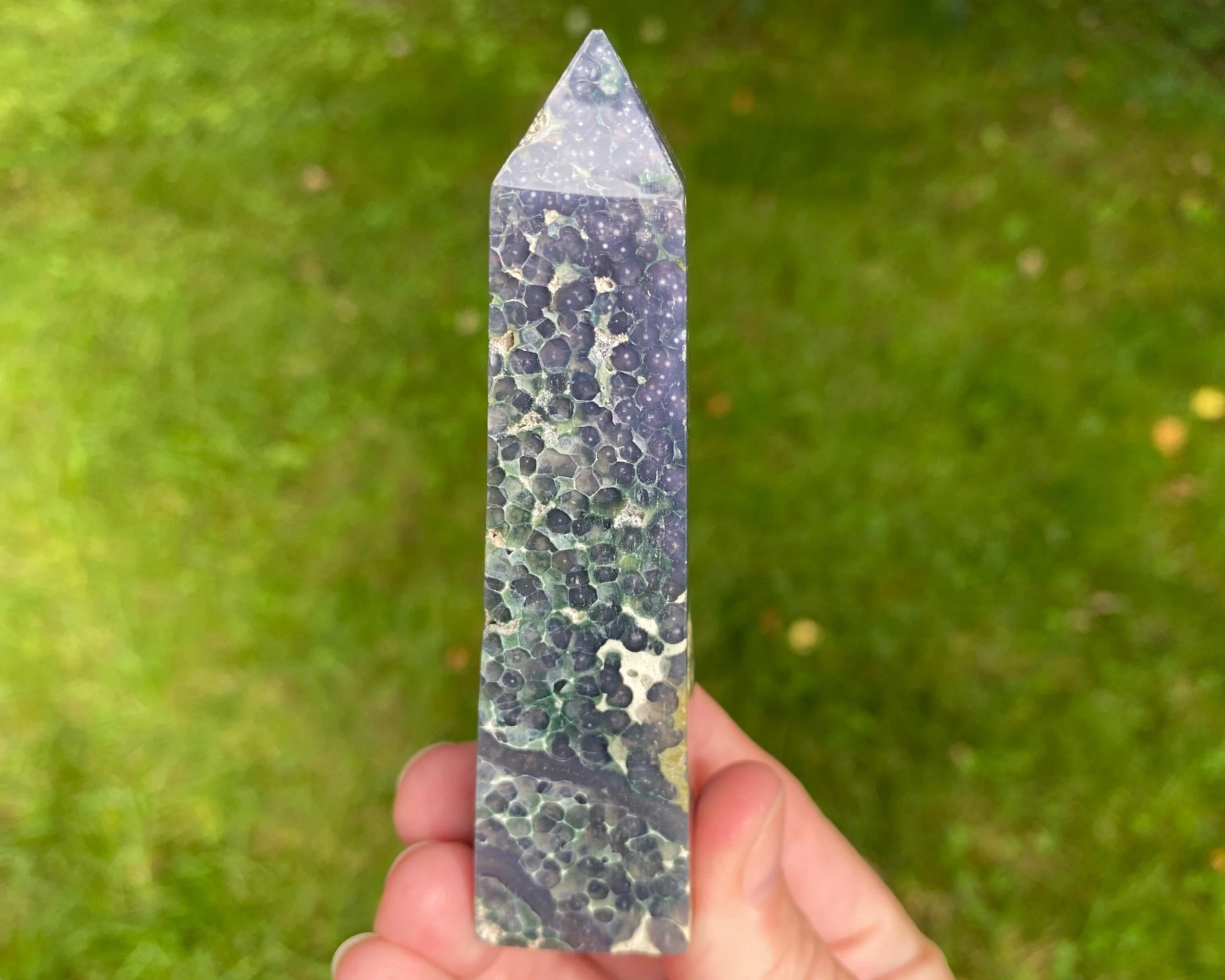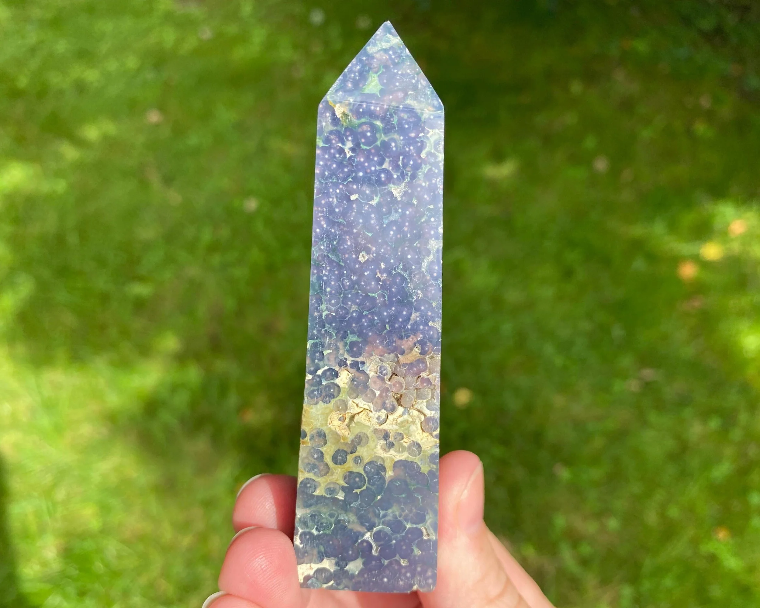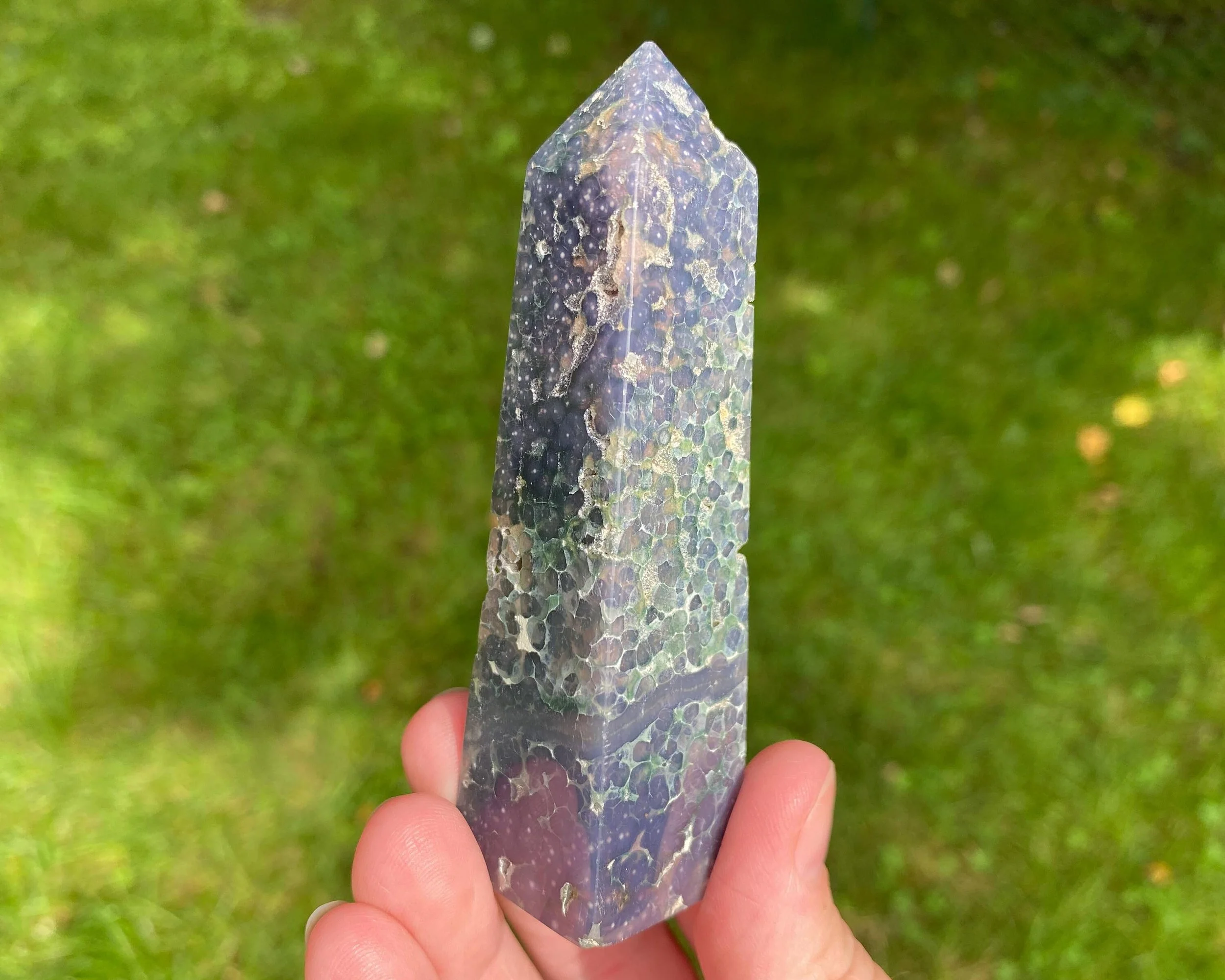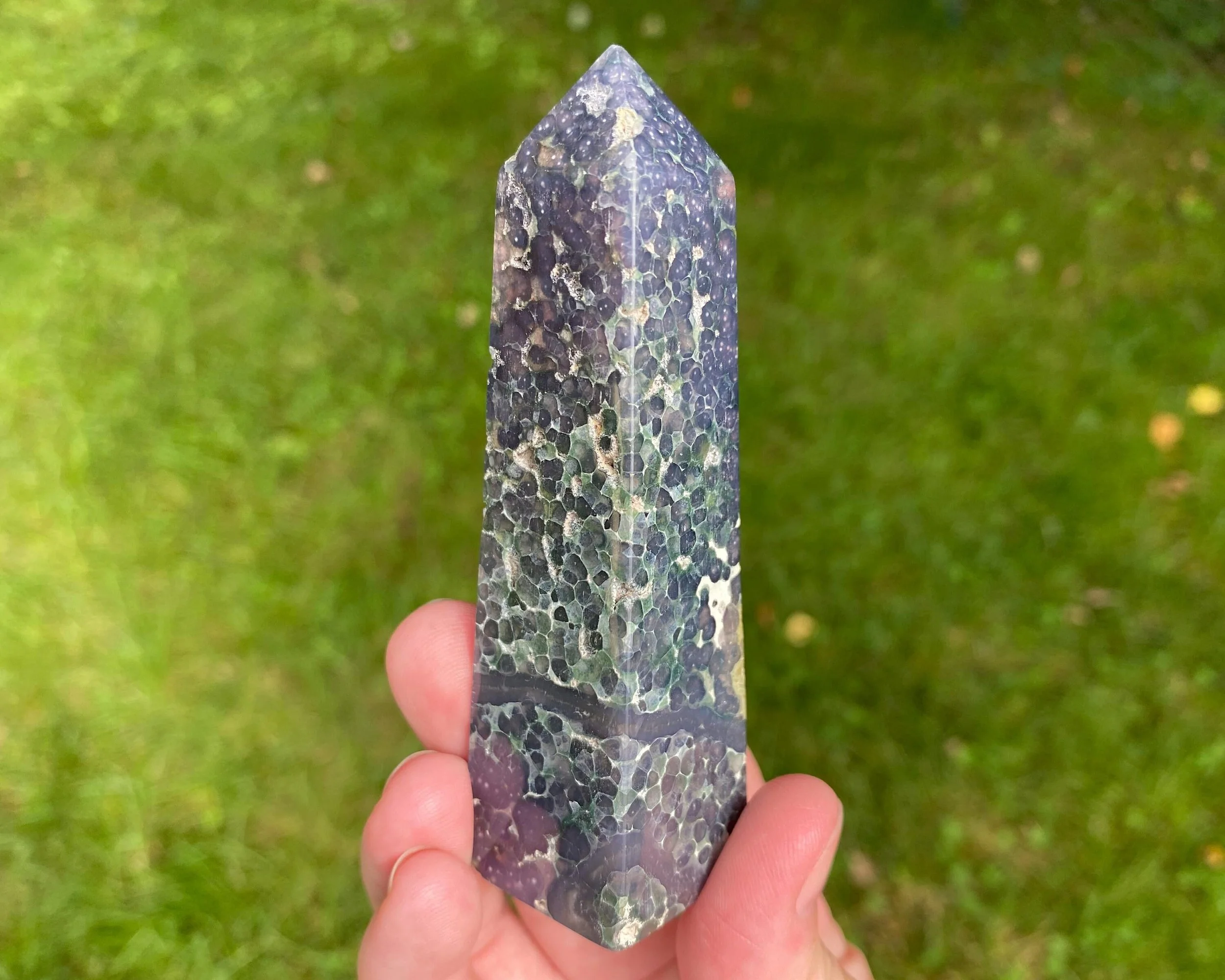 This is a beautiful semi-polished Grape Agate tower, also known as purple and green Botryoidal Chalcedony with Druzy Quartz. It comes from Indonesia and is not enhanced or dyed. The druzy can be very sparkly, and some has a shiny, velvety look to it. The polished area has very cool patterns with beautiful colors. Gorgeous all around!