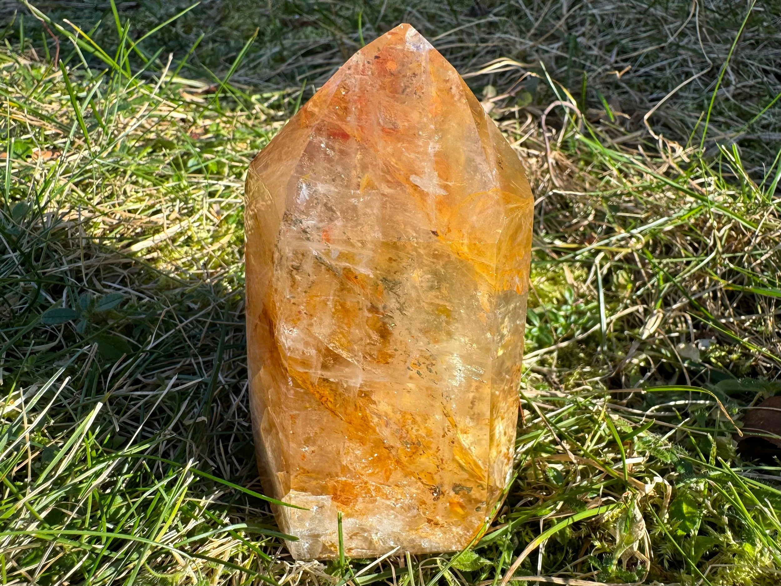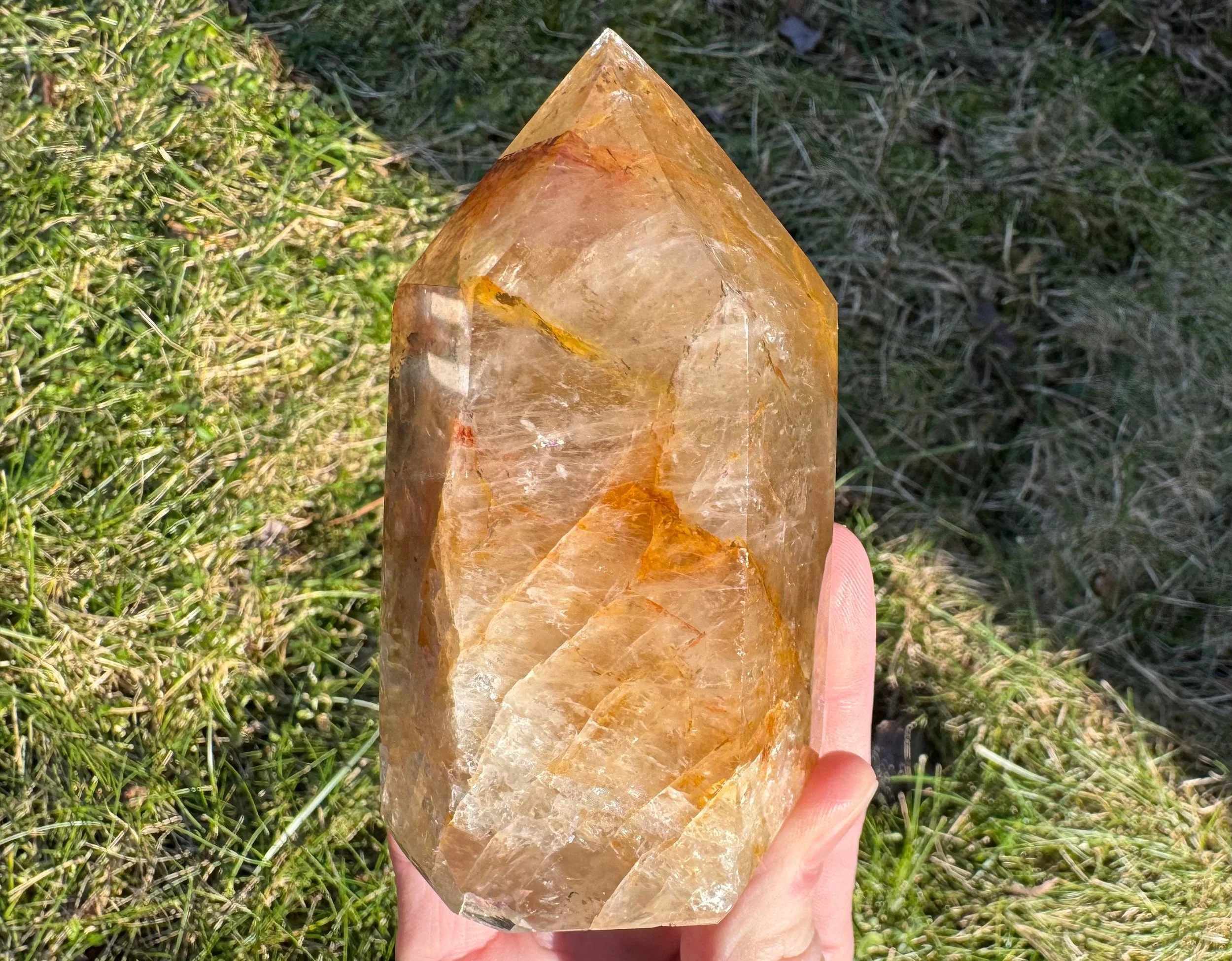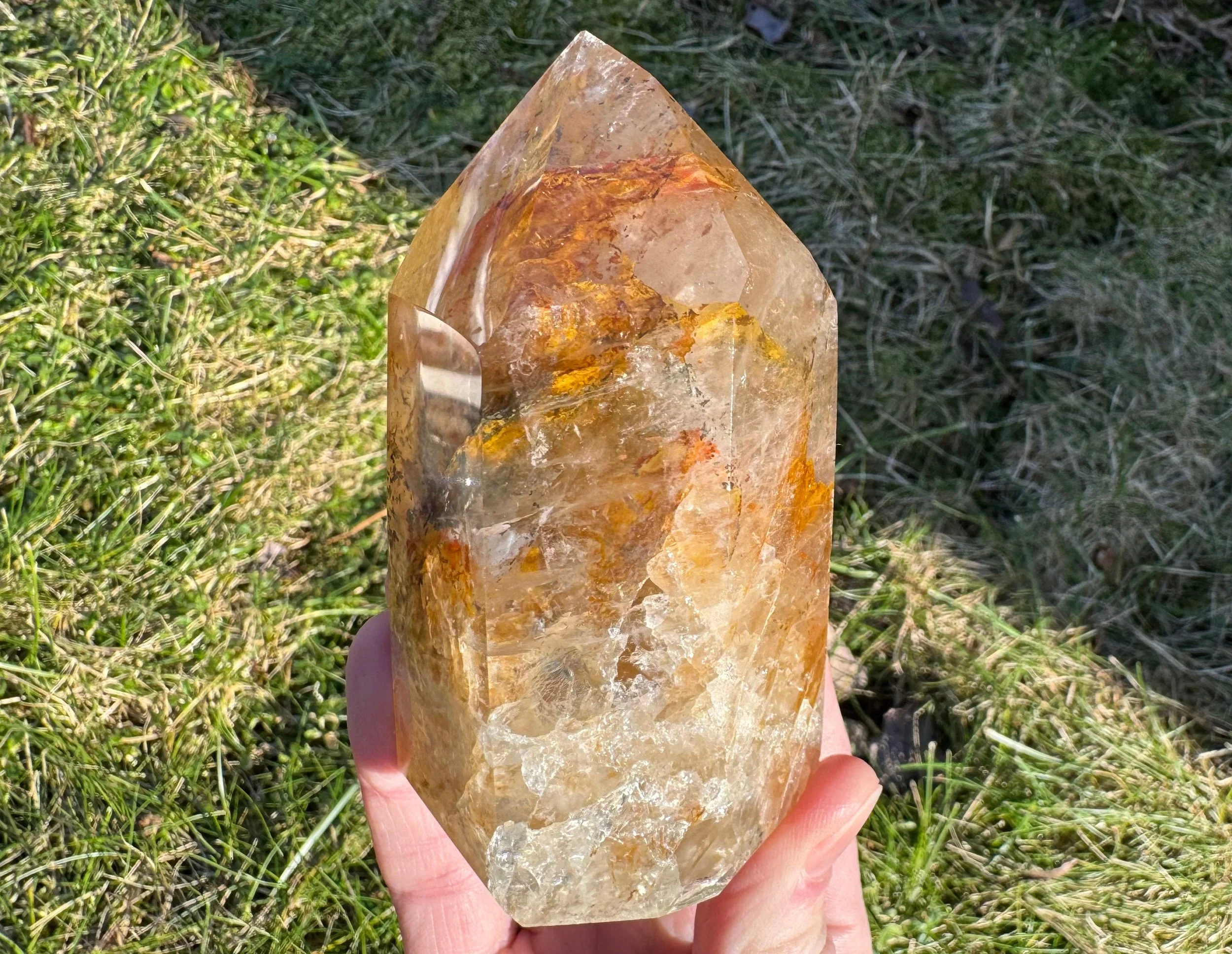 This is a Golden Healer, or Yellow Hematoid Quartz tower. It is a self standing polished point with yellow Hematite inclusions. it also has some funky gold inclusions, some black ones almost like dendrites but I don't see dendritic shape, and it has rainbows too. From Brazil.