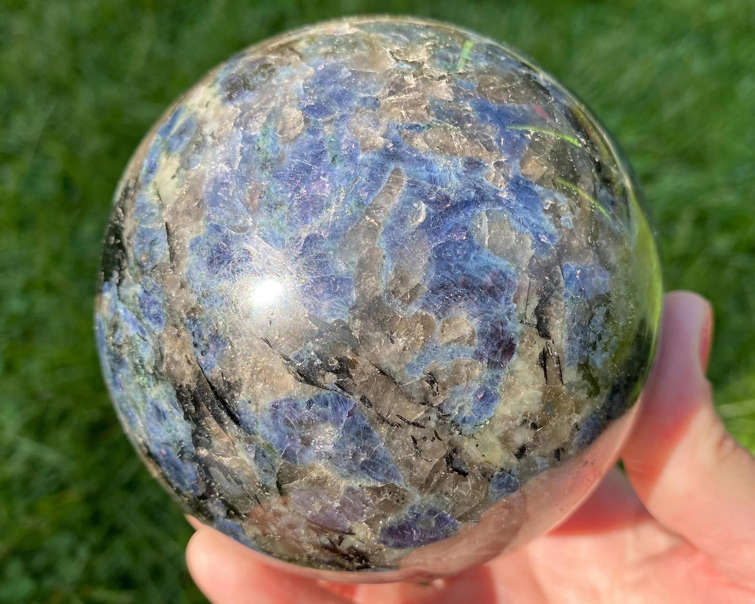 This is a lovely sphere of natural Iolite, a blue Cordierite known for its lovely color. It also has some Quartz and Smoky Quartz and may even have other minerals included inside it. The color is fantastic.