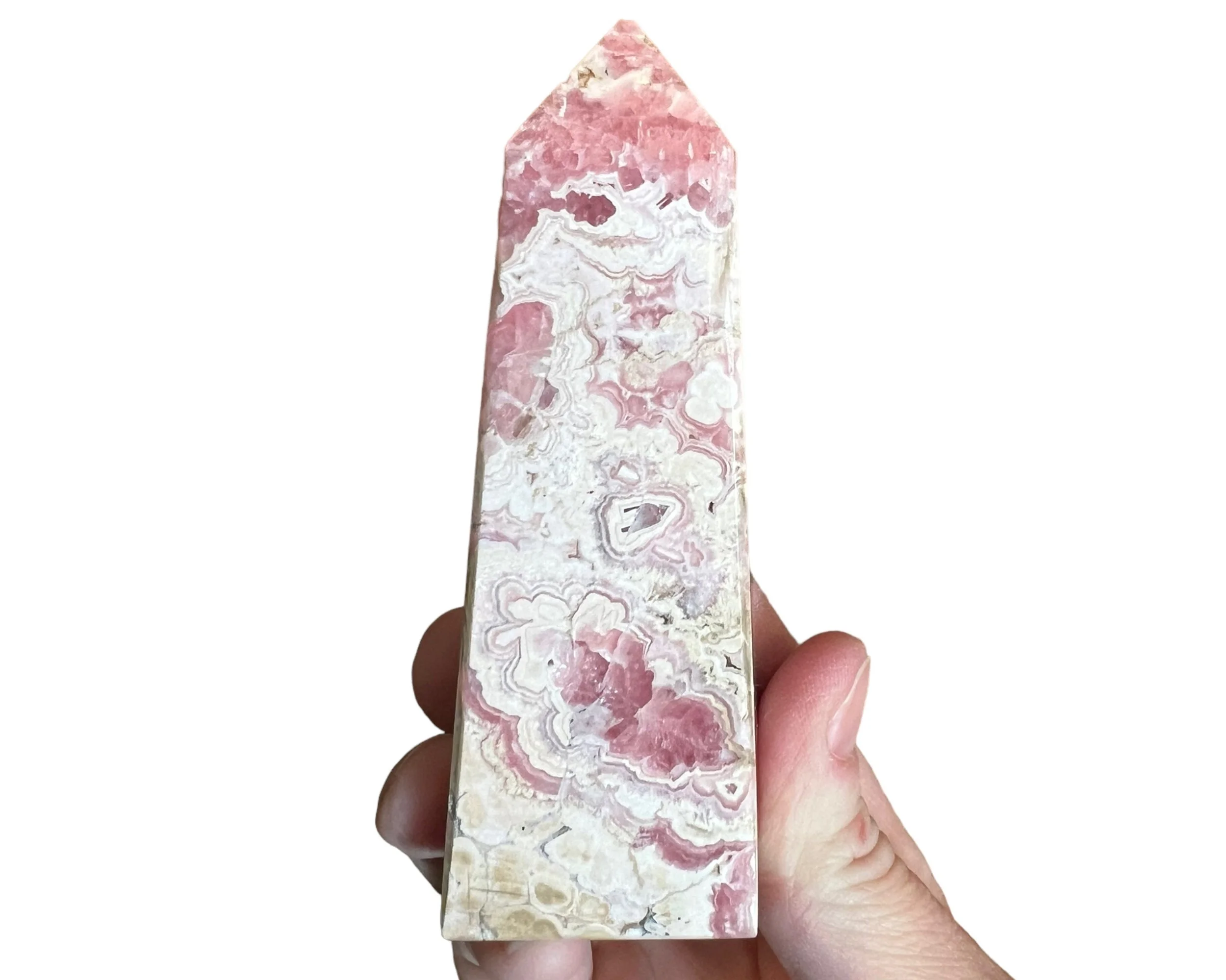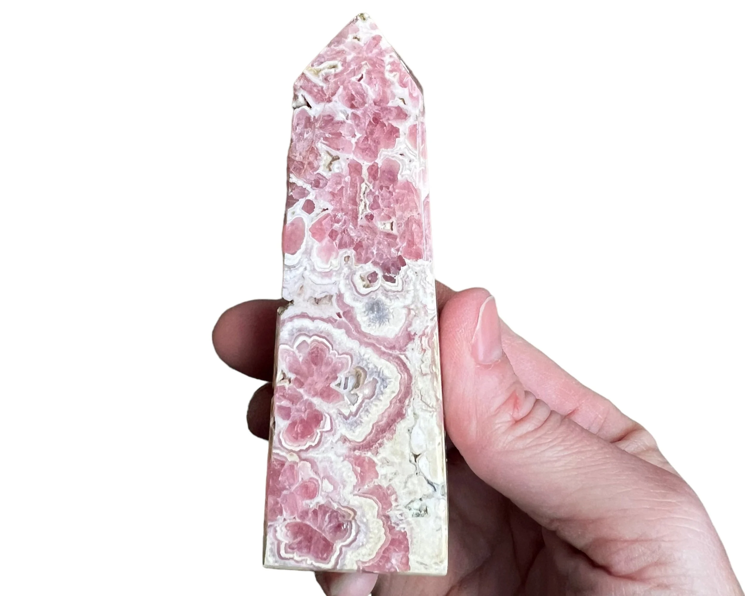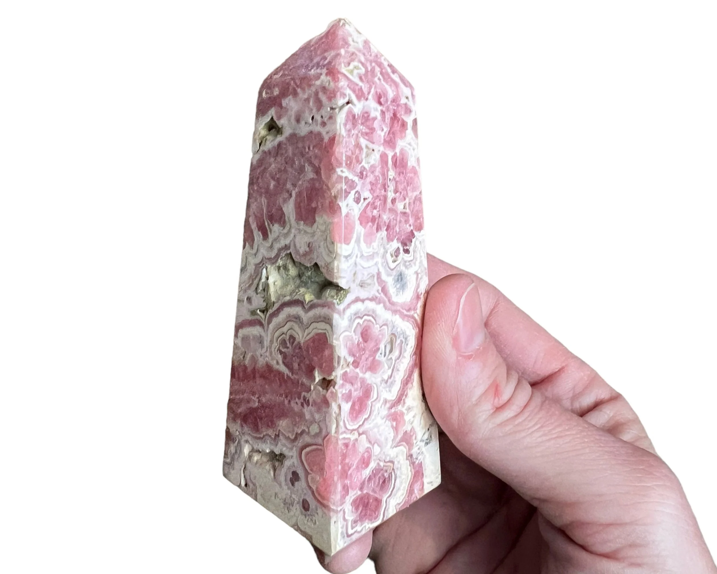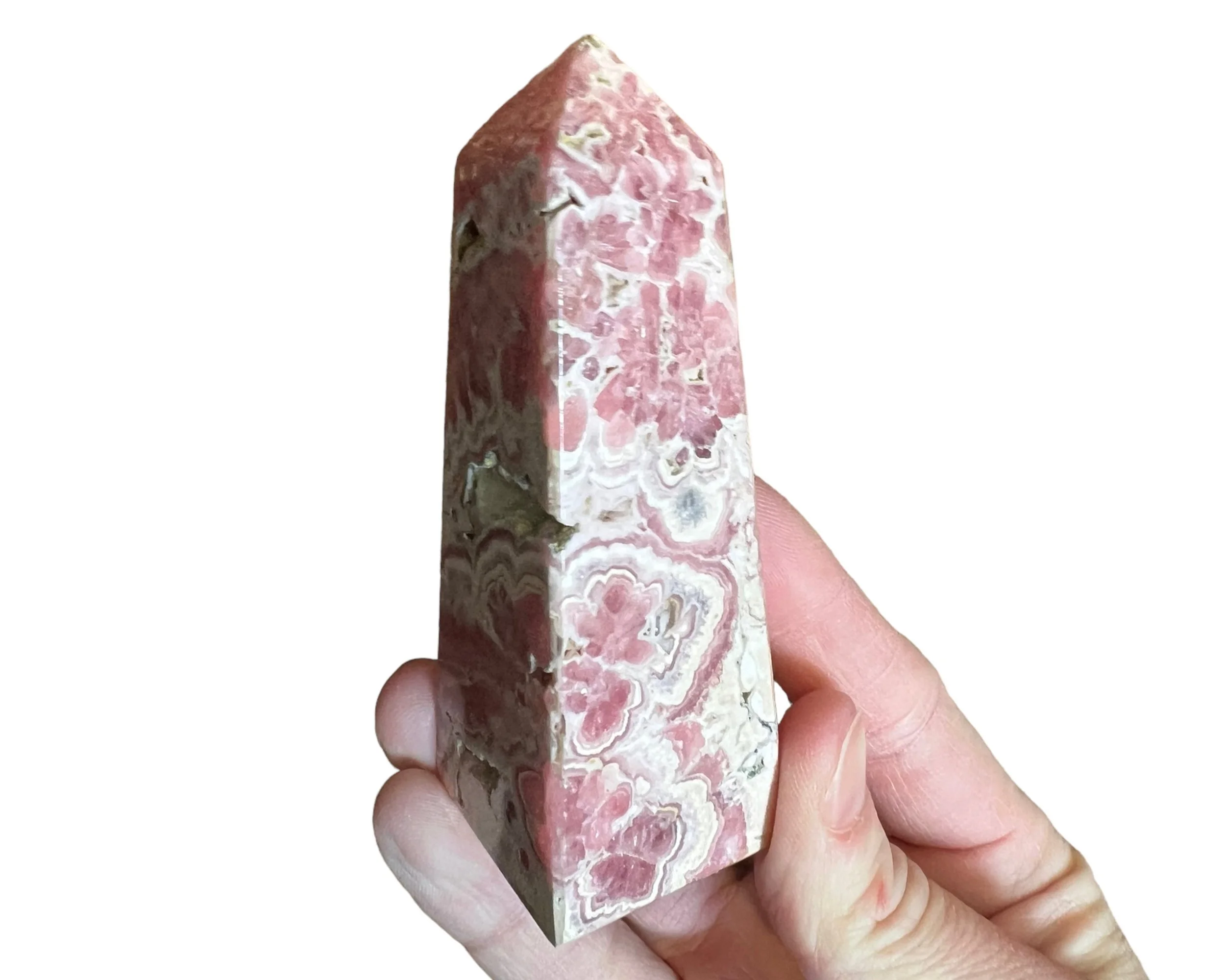 This is a self standing tower carved from Rhodochrosite. It has deep and bright pinks intricately banded with white and grays, open natural pockets, and is polished all the way around. It even has a nice sparkle to it. This is a four sided tower or point.