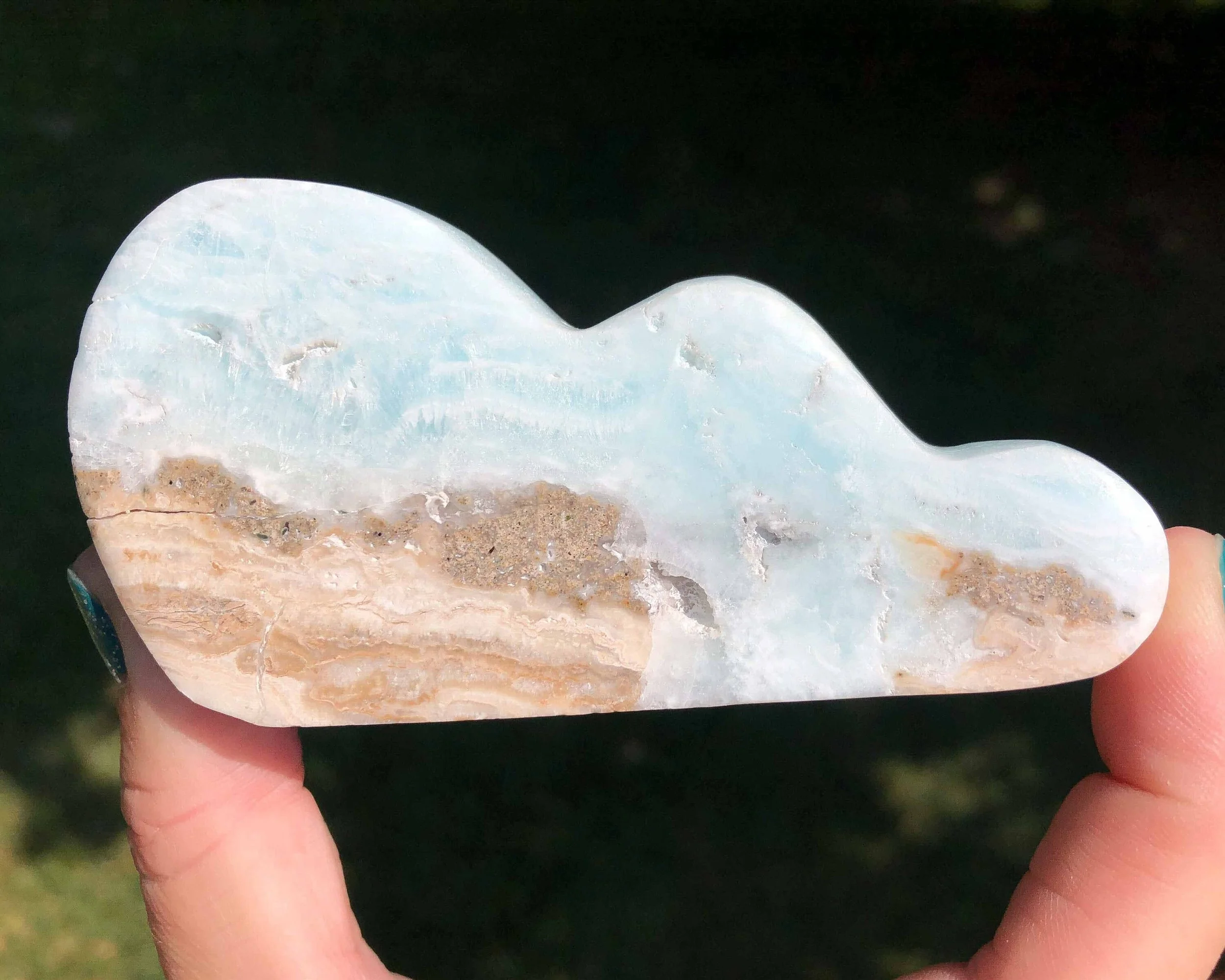 This is a sweet cloud carved from beautiful blue Calcite and Aragonite. These have a gorgeous Caribbean blue coloring with swirls of white and sand colored browns.