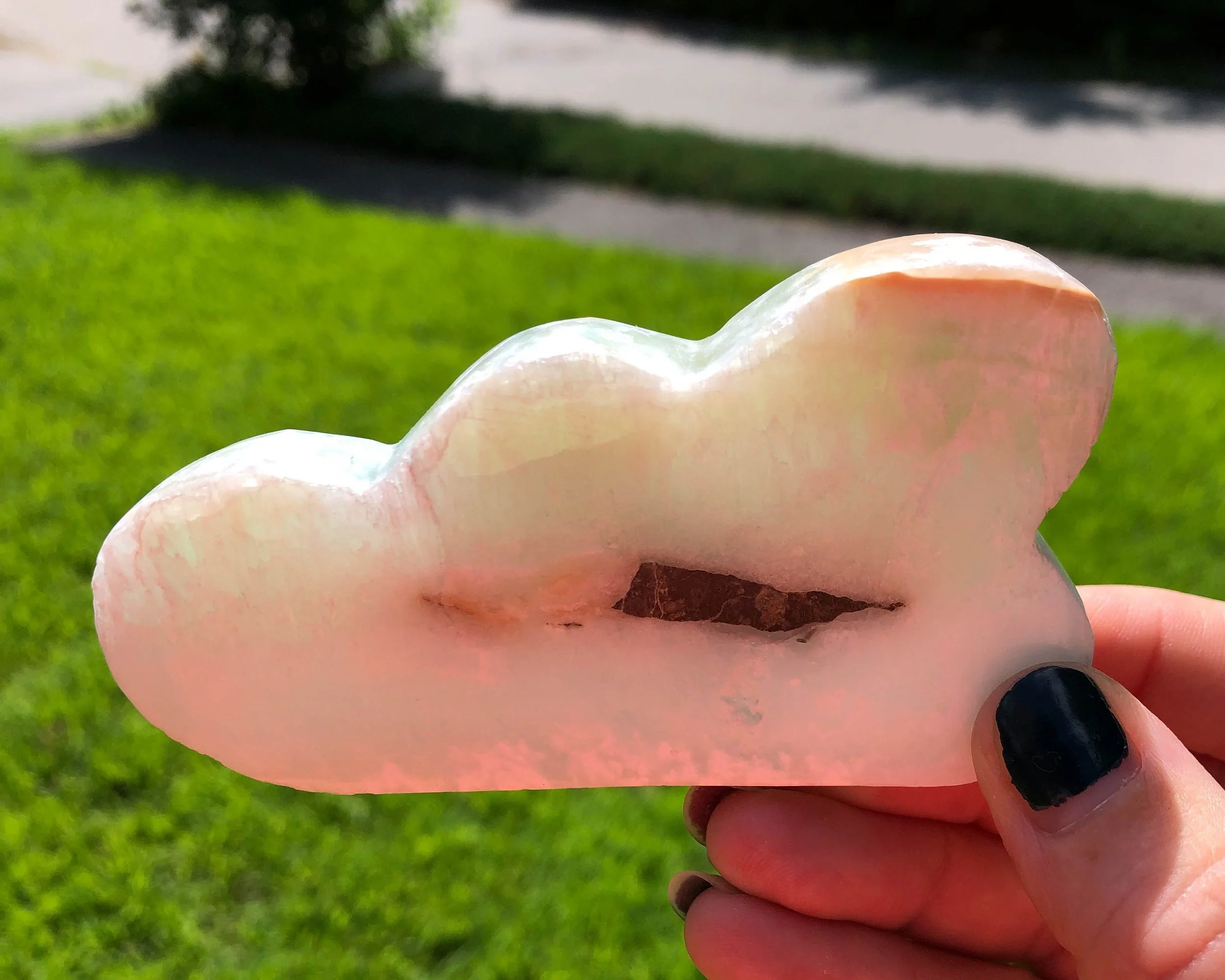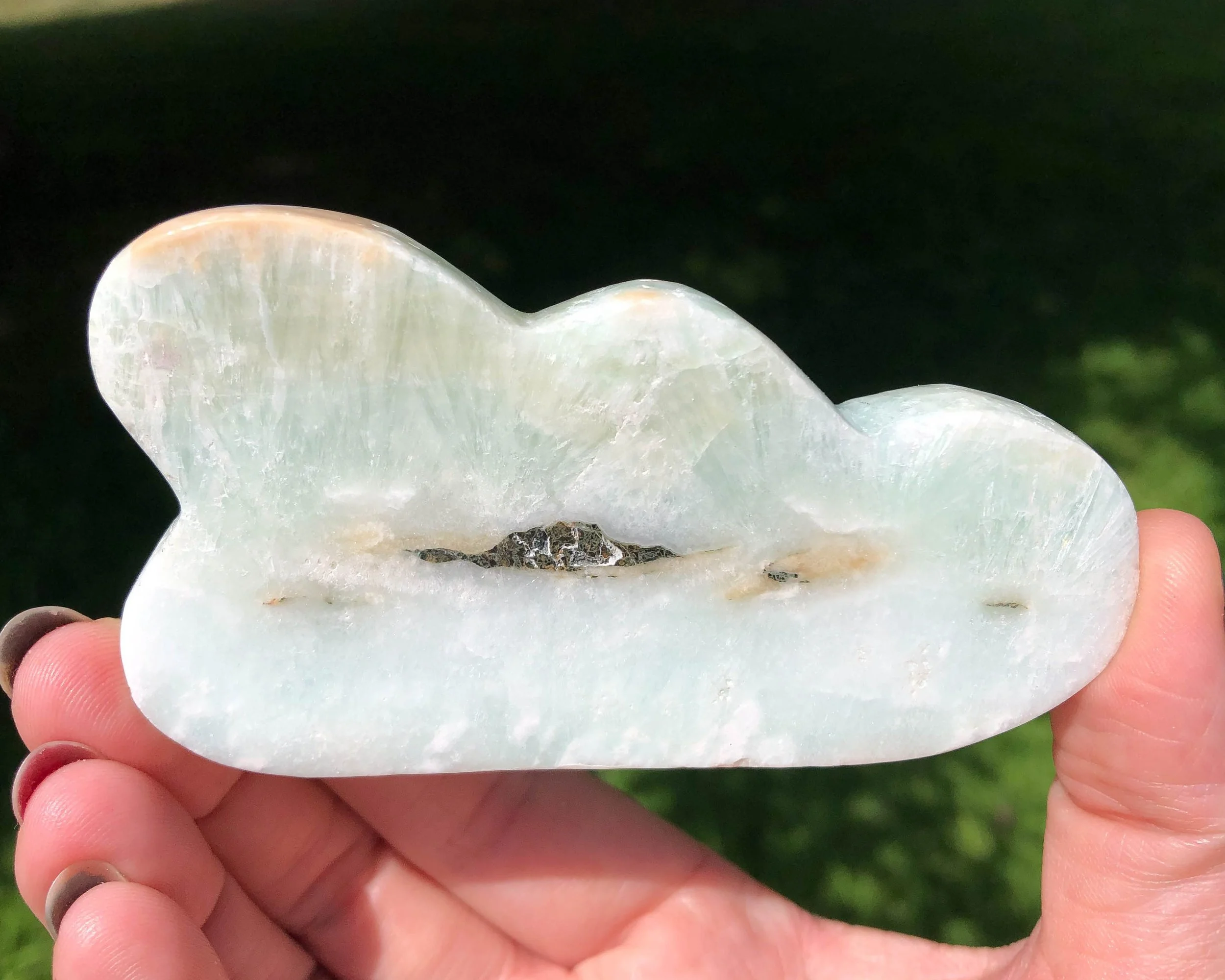 This is a sweet cloud carved from beautiful blue Calcite and Aragonite. These have a gorgeous Caribbean blue coloring with swirls of white and sand colored browns.